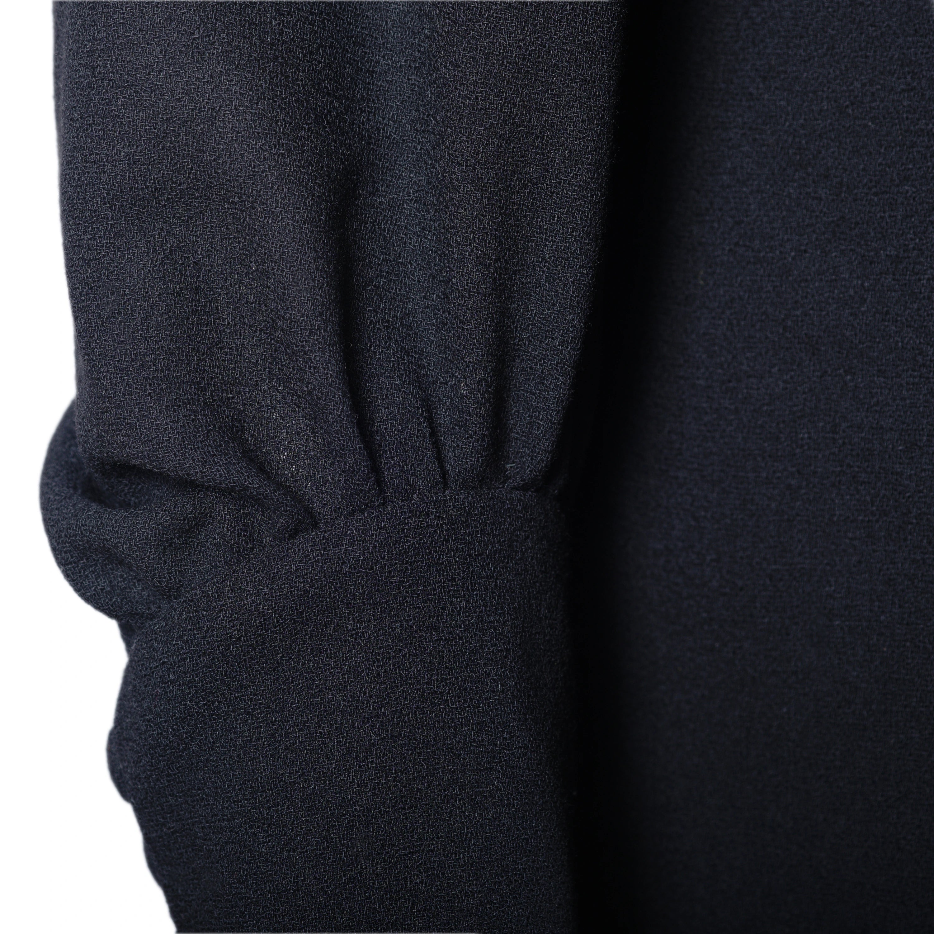 Goo Woog dress in high-quality black fabric with shiny stone embellishments, creating a modern and sparkling effect. Straight-cut design with a classic neckline and precise stitching that highlights the quality of the materials and craftsmanship. The lightweight yet durable fabric allows natural movement and gives fluidity to the garment, while the stones add brightness and character.