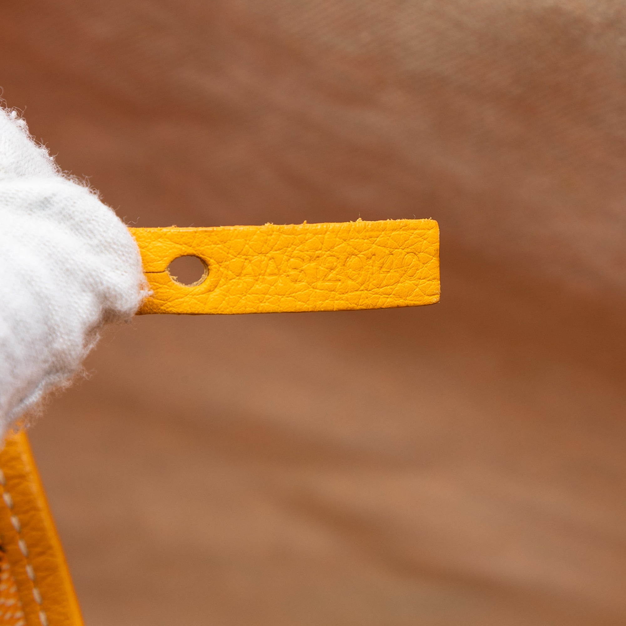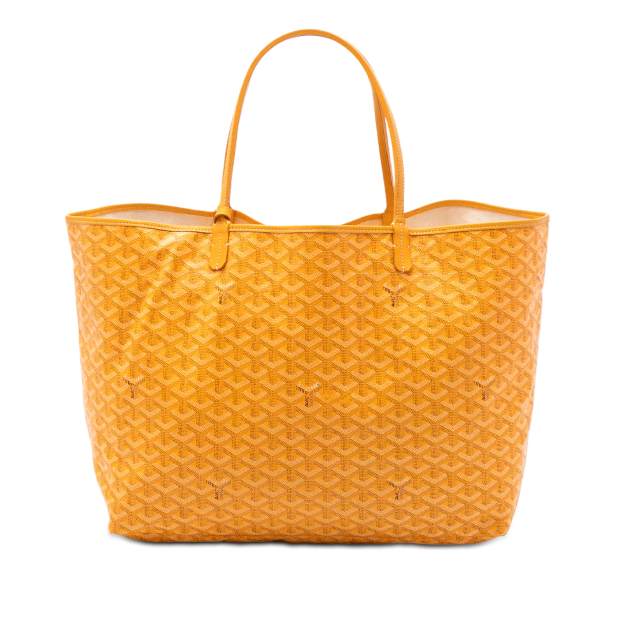 The Goyardine Saint Louis GM features a coated canvas body with leather trim, flat leather handles, an open top, and a removable flap pouch. Retail Price: 2813.00
