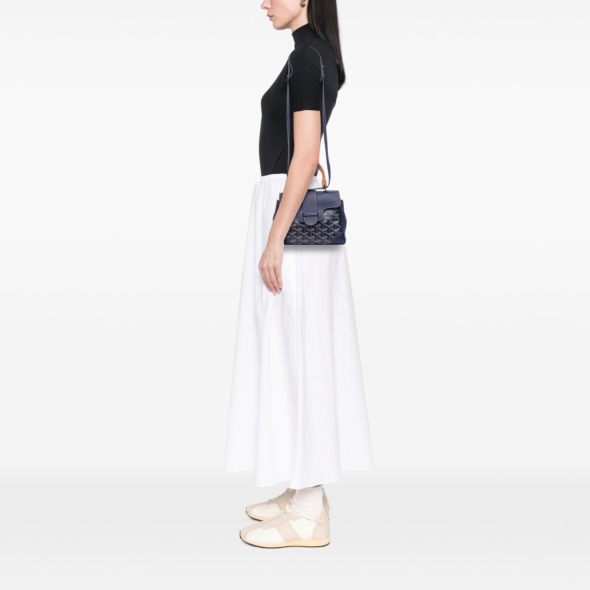 The Mini Saigon features a coated canvas body with leather trim, a wooden top handle, a removable flat leather strap, a front flap with slip-through closure, and an interior slip pocket. Retail Price: 3670.00