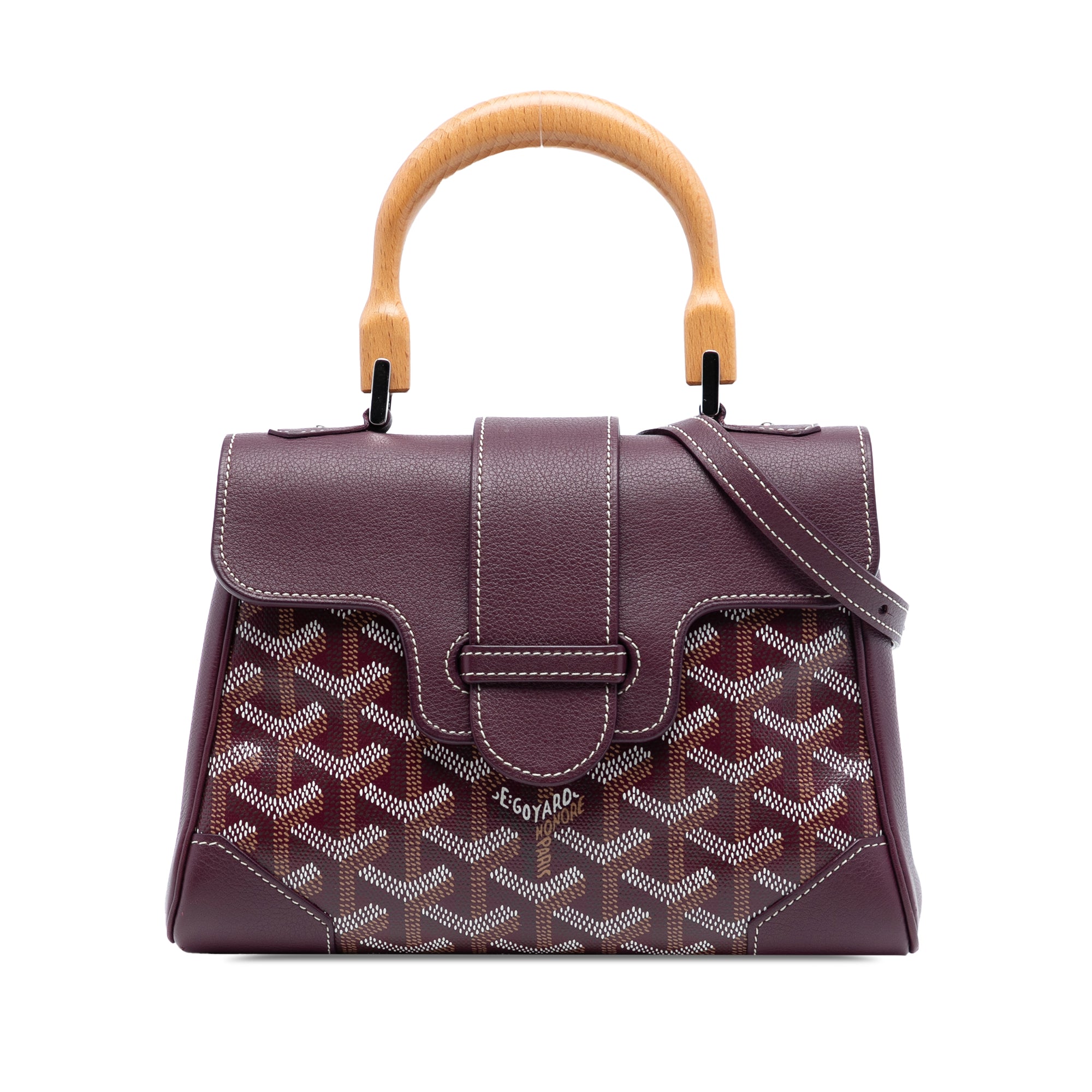 The Mini Saigon features a coated canvas body with leather trim, a wooden top handle, a removable flat leather strap, a front flap with slip-through closure, and an interior slip pocket. Retail Price: 3590.00