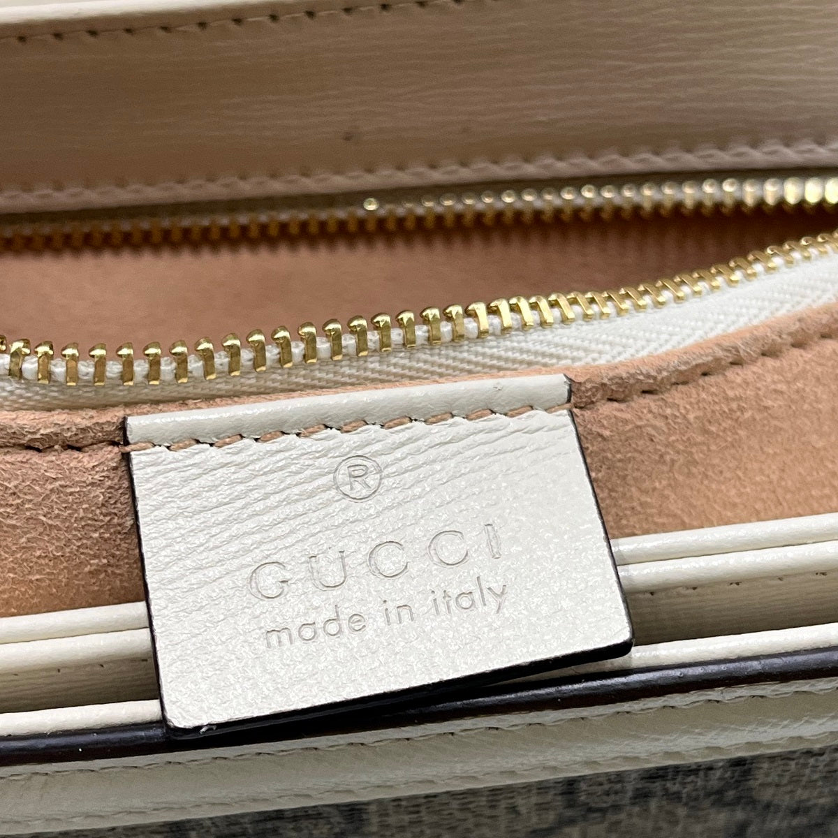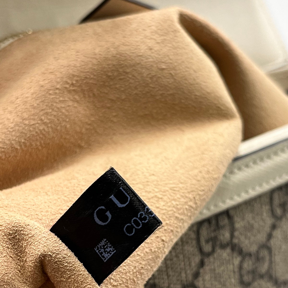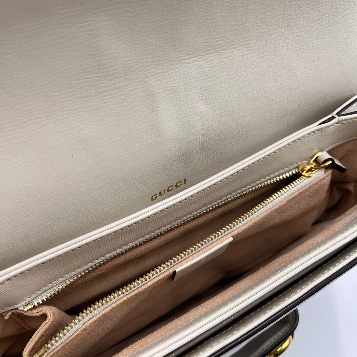 The Gucci 1955 Horsebit Bag with white trim is a timeless and elegant piece that celebrates the brand’s equestrian heritage. Its classic design and versatile functionality make it a standout accessory for any occasion.