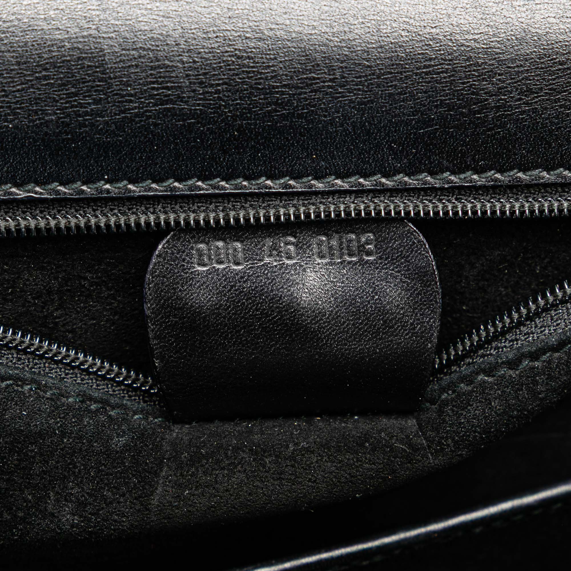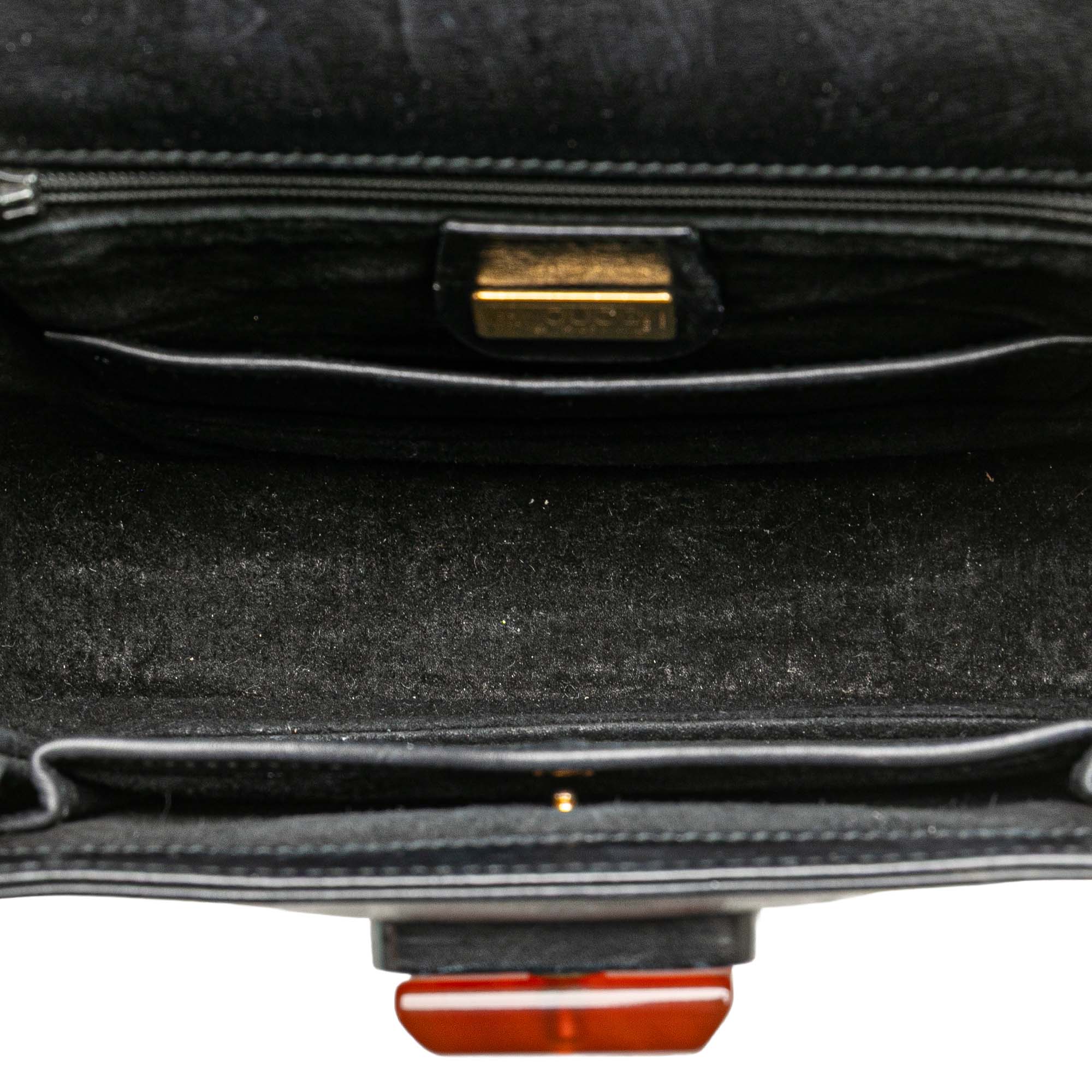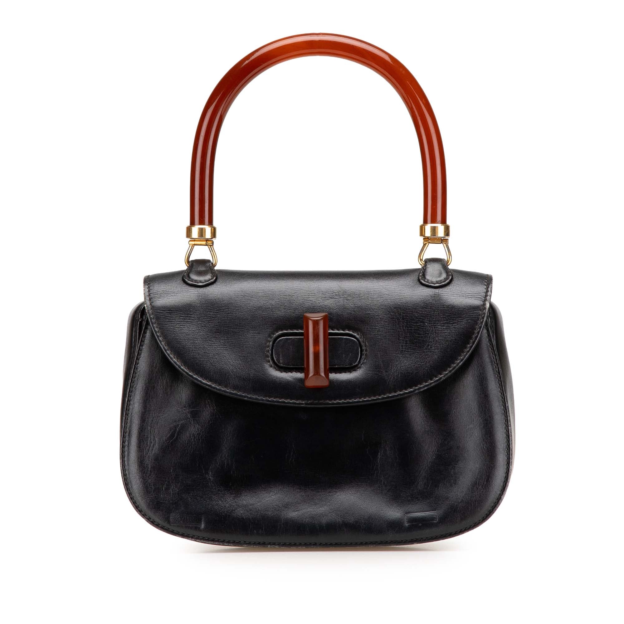 This handbag features a leather body, a plastic top handle, a flap with plastic turn lock closure, and interior zip and slip pockets. Retail Price: 1145.00