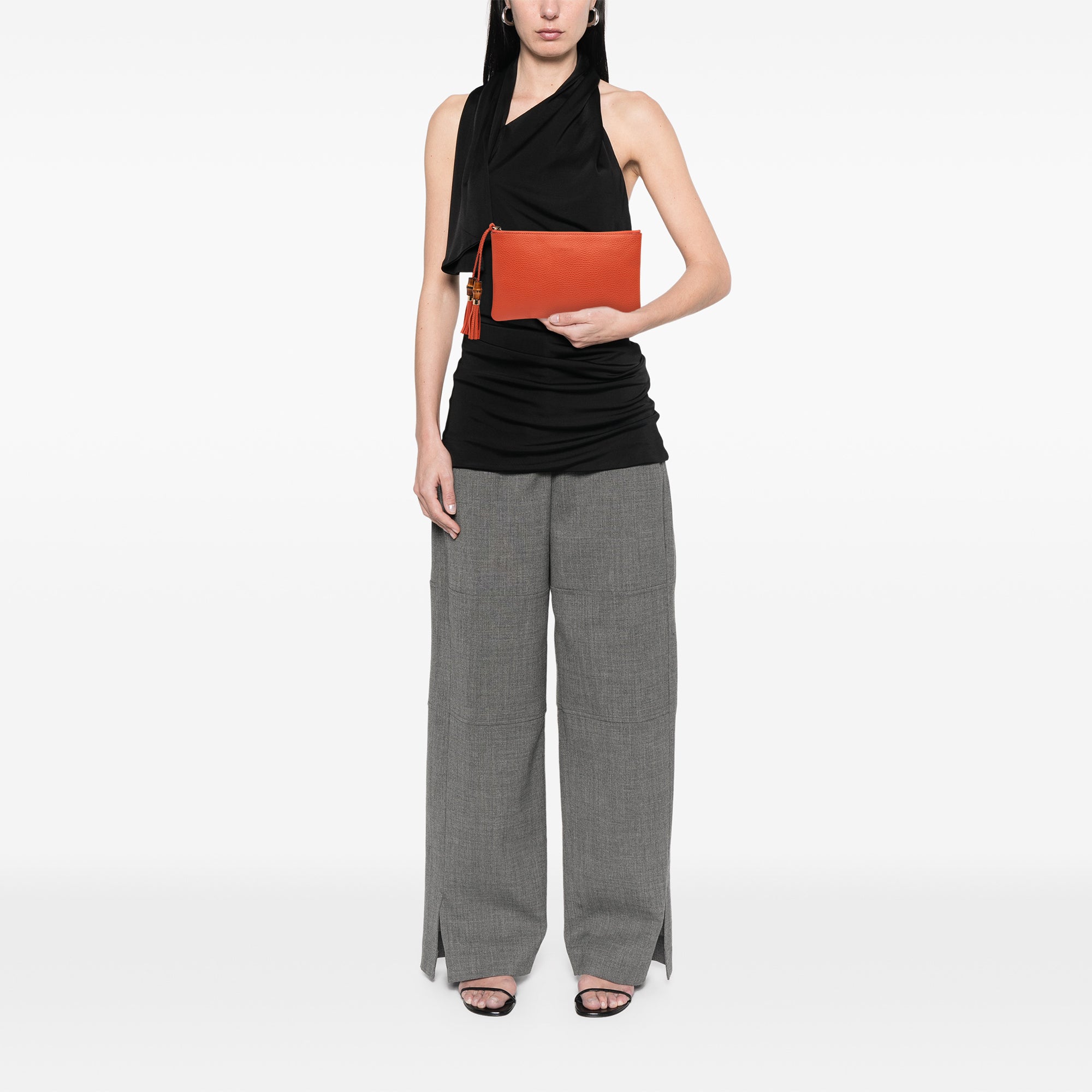 This clutch bag features a leather body, a top zip closure with bamboo and tassel details, and an interior slip pocket. Retail Price: 600.00