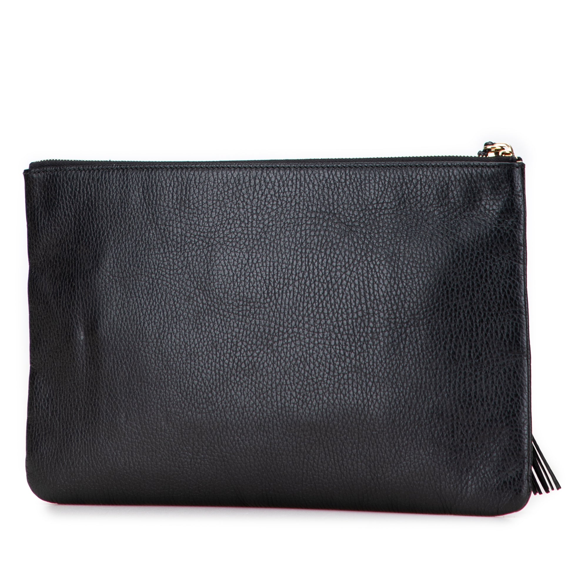 This clutch bag features a leather body, a bamboo with tassel detail, a top zip closure, and an interior slip pocket. Retail Price: 600.00