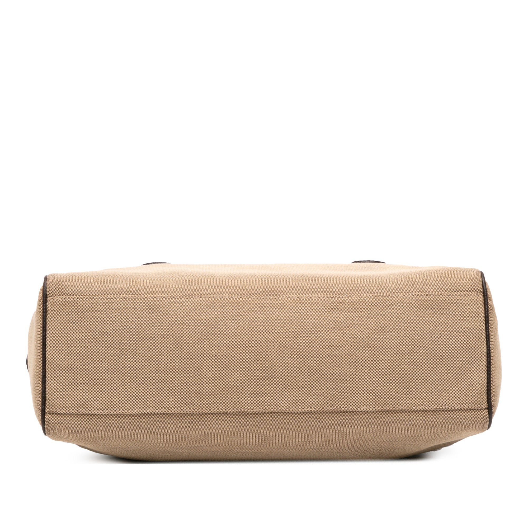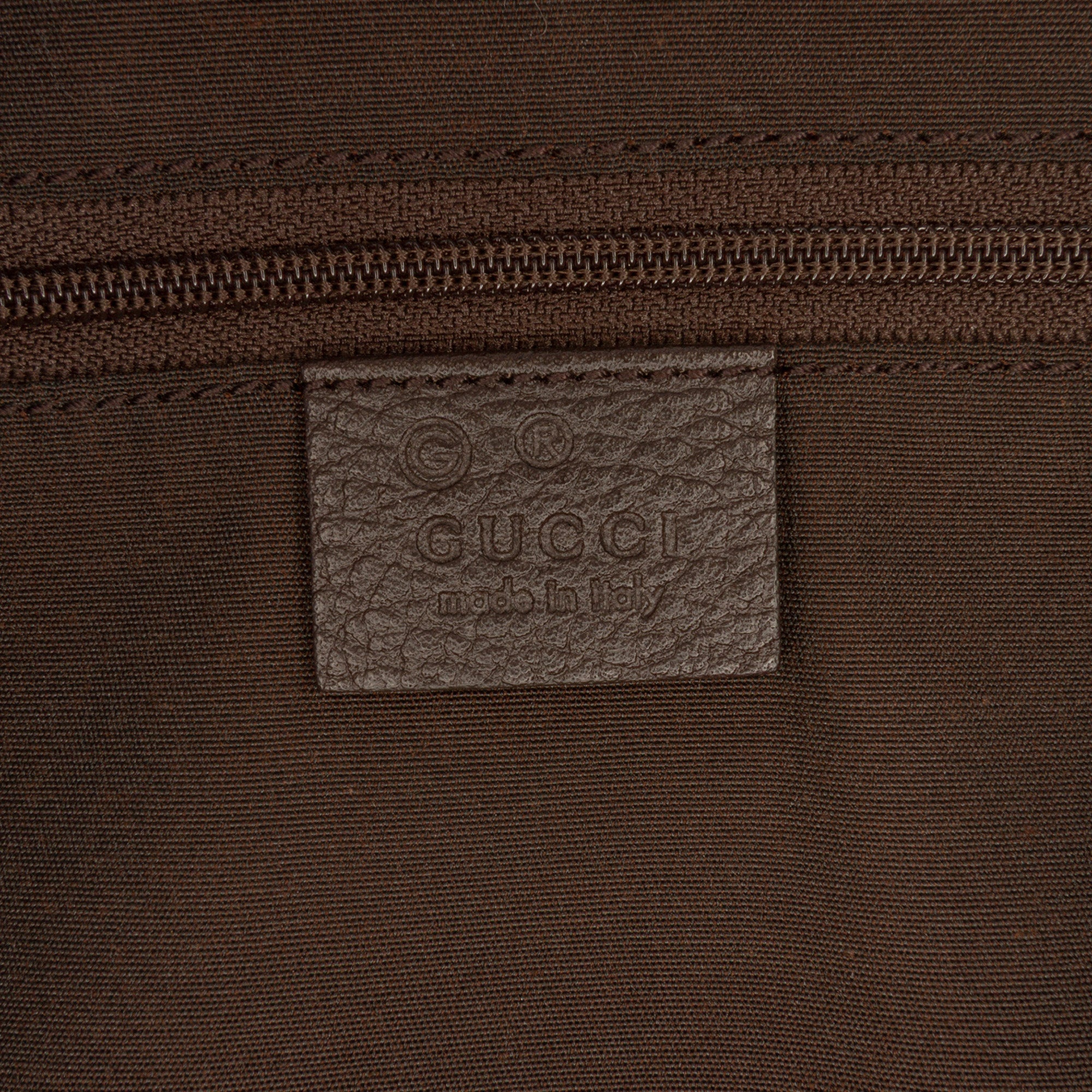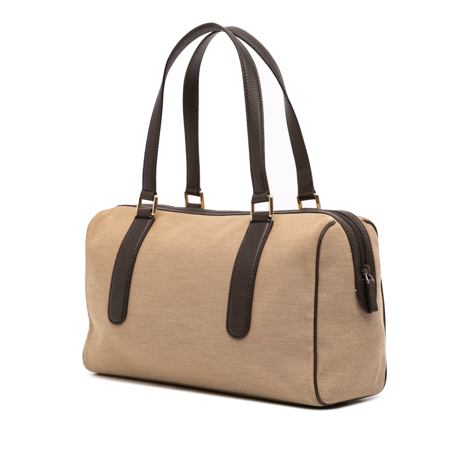 This boston bag features a canvas body with leather trim, flat leather straps, a top zip closure, and interior zip and slip pockets. Retail Price: 723.00