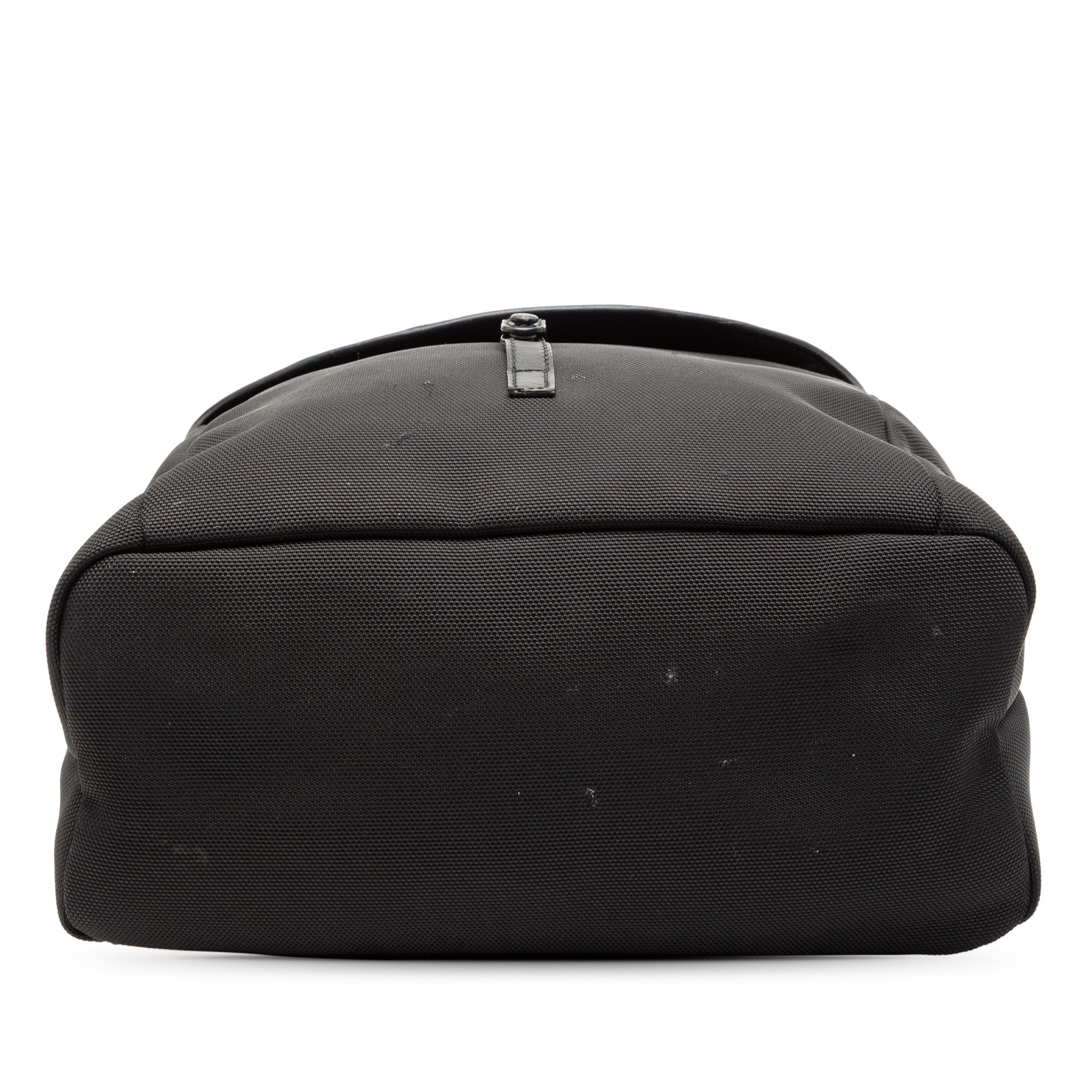 This backpack features a canvas body, adjustable flat back straps, a top flap, a top zip closure, an exterior back slip pocket, and interior zip and slip pockets. Retail Price: 1413.00