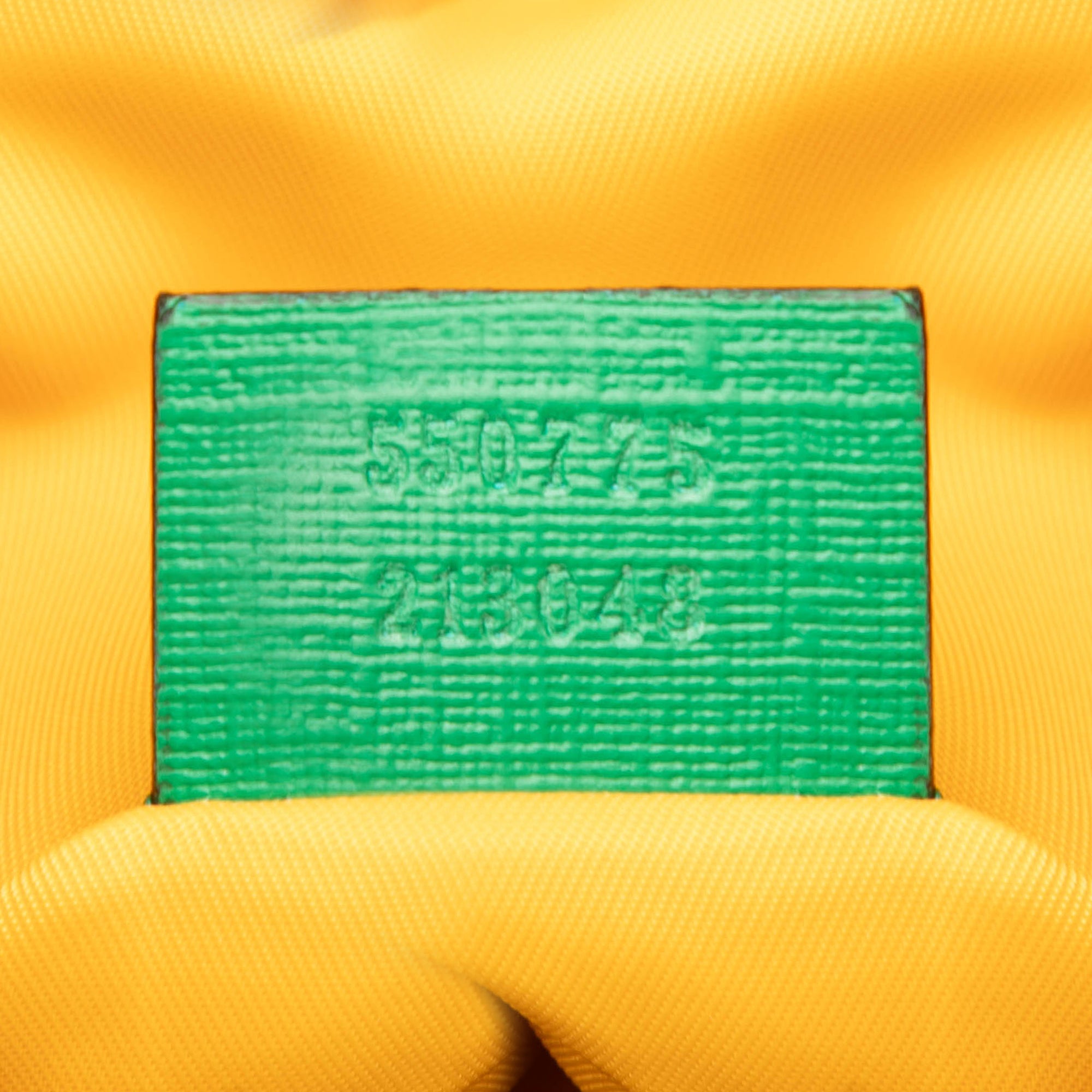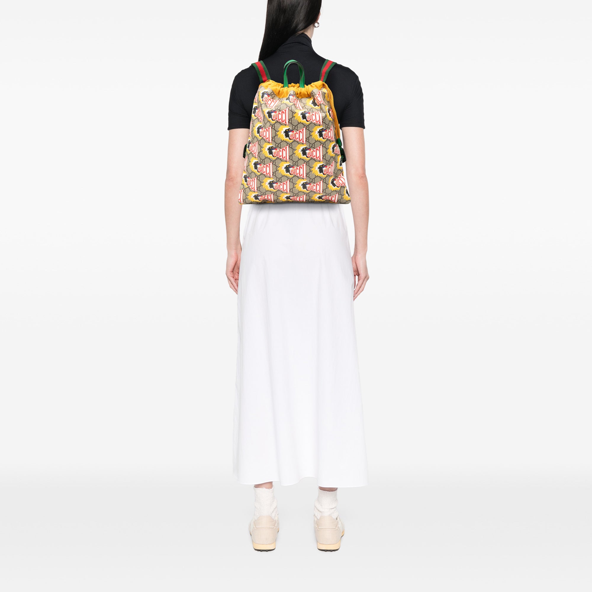 This backpack features a printed coated canvas body, flat leather top handles, adjustable flat canvas back straps, and an open top with a drawstring closure. Retail Price: 990.00