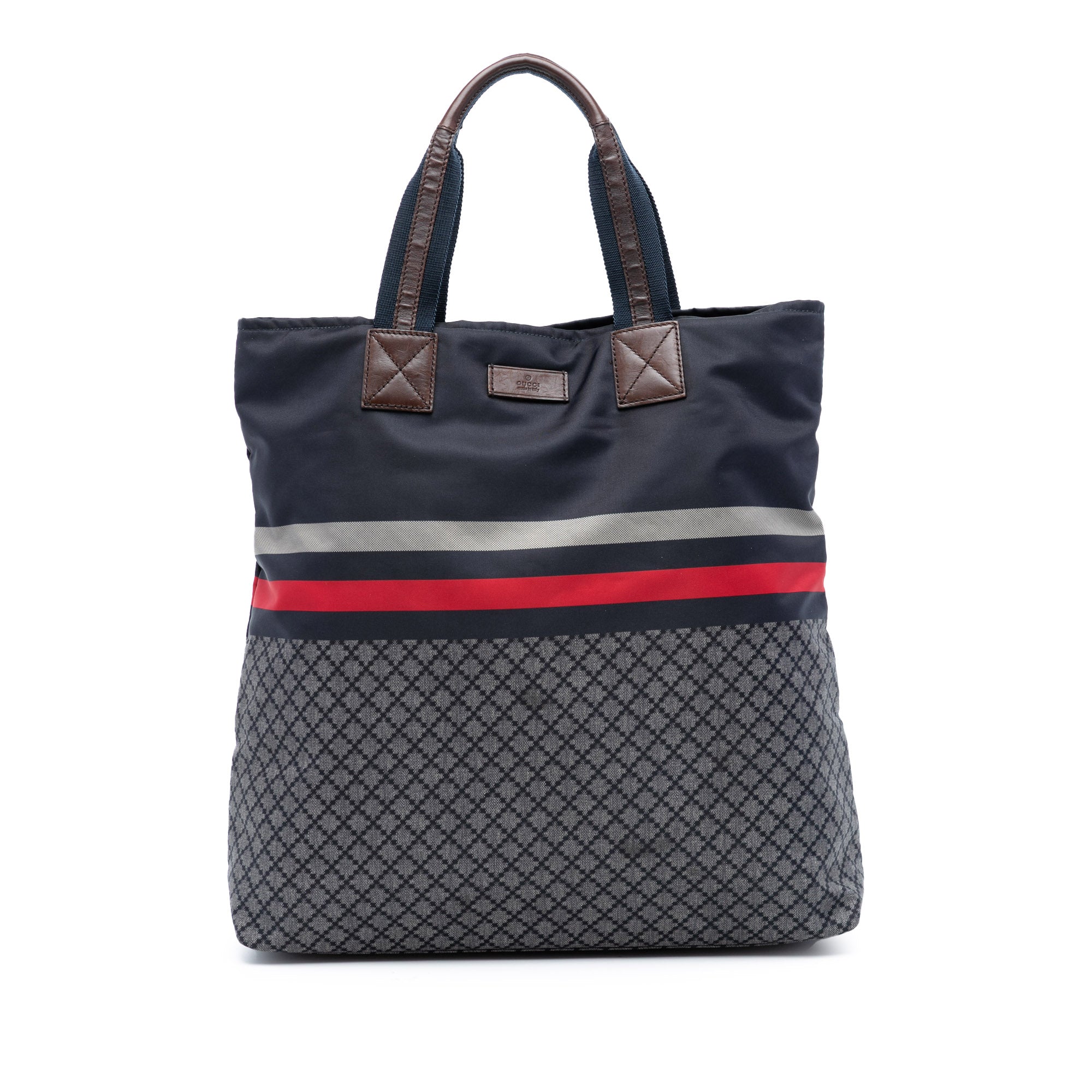This tote bag features a printed nylon body, flat handles, a top zip closure, and interior zip and slip pockets. Retail Price: 1050.00