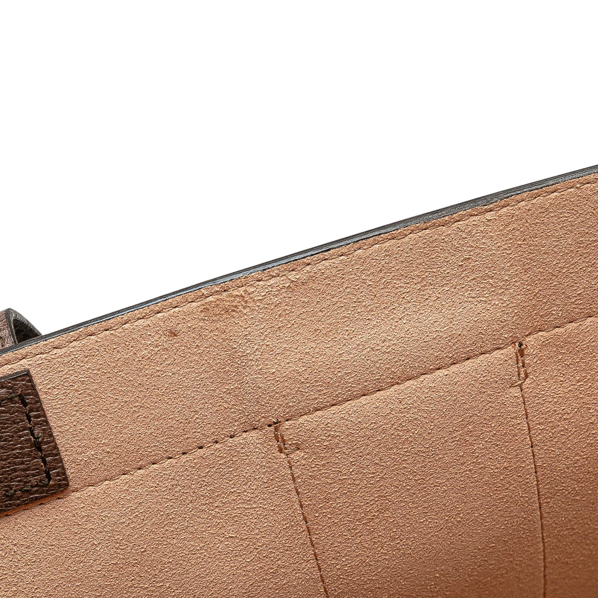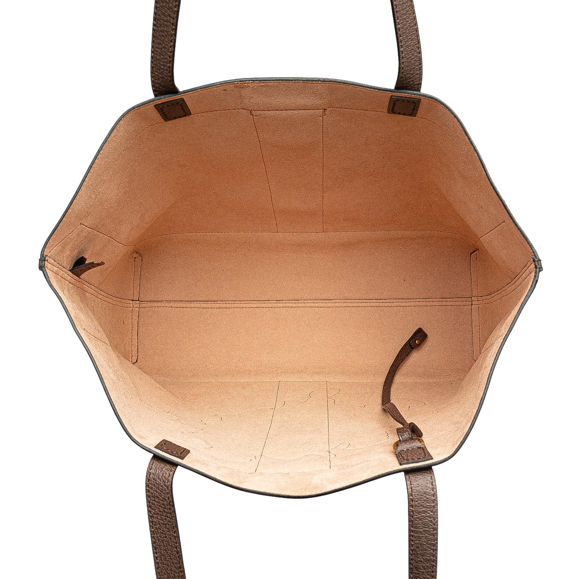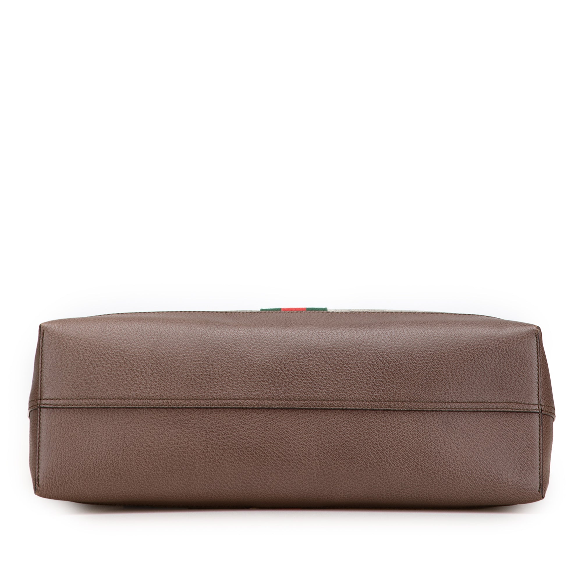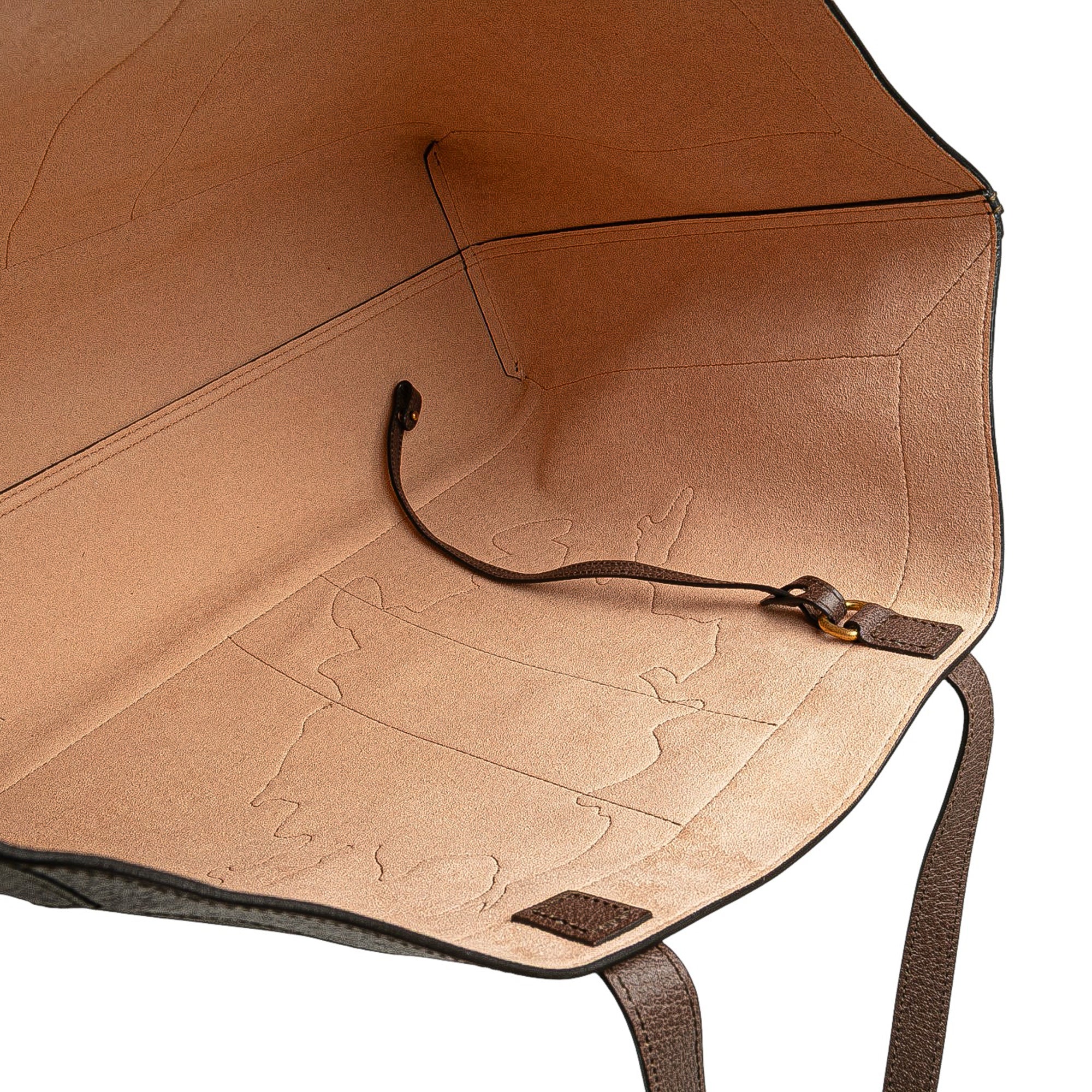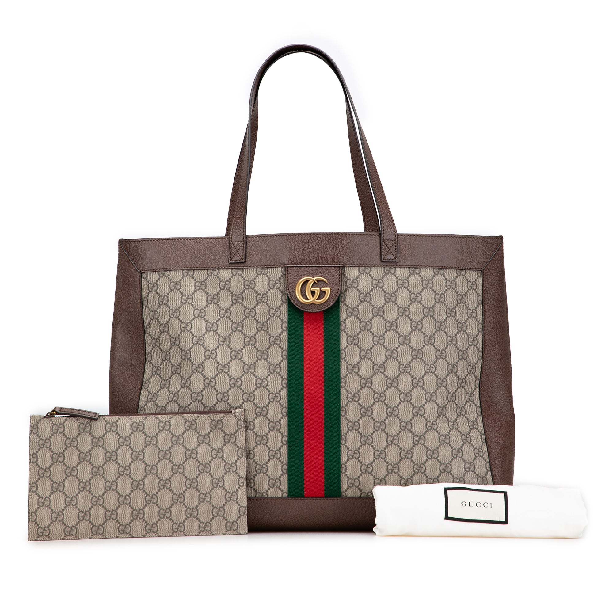 The Ophidia Tote bag features a coated canvas body with leather trim, flat leather handles, an open top, and a pouch inclusion. Inclusion: Dust bag. Retail Price: 2565.00