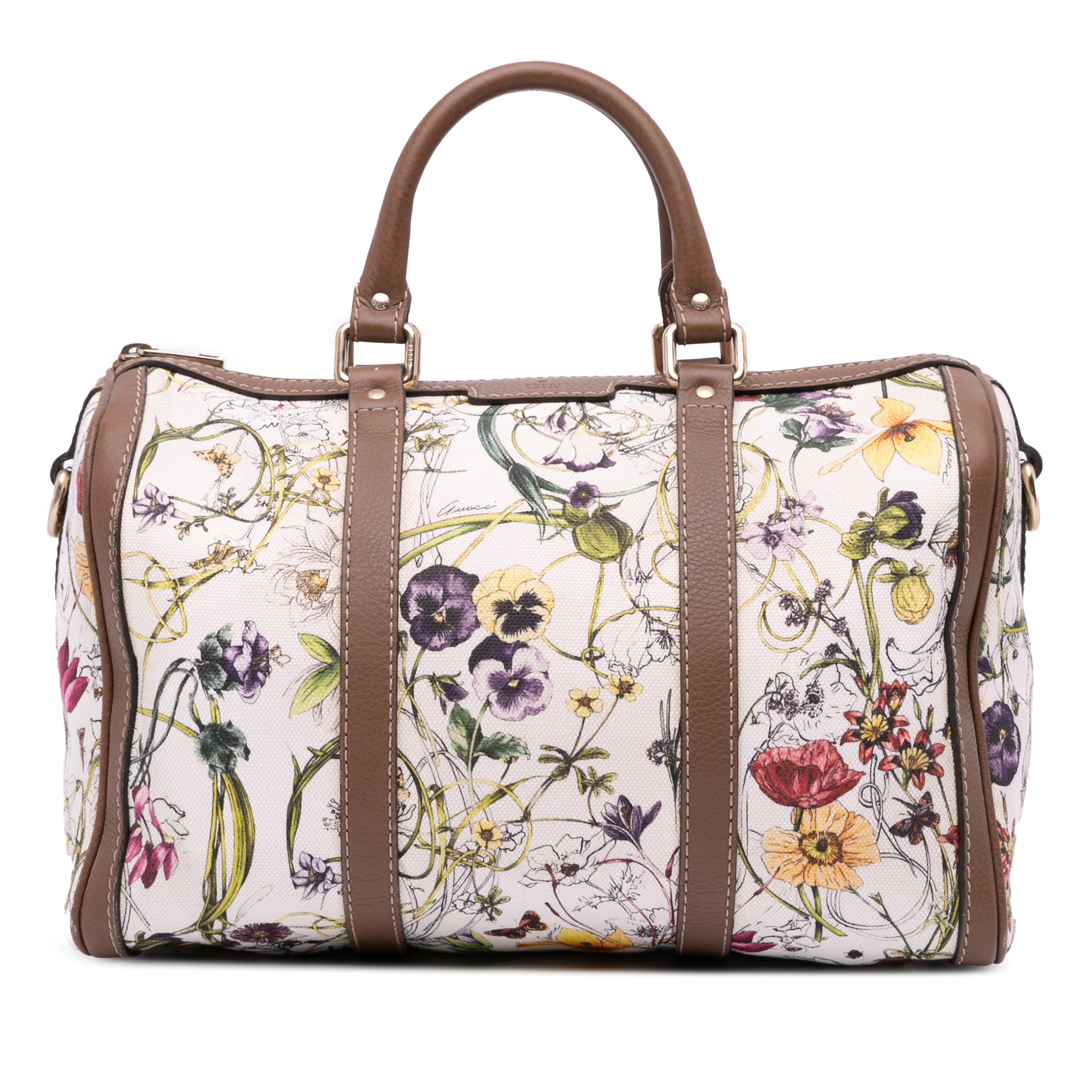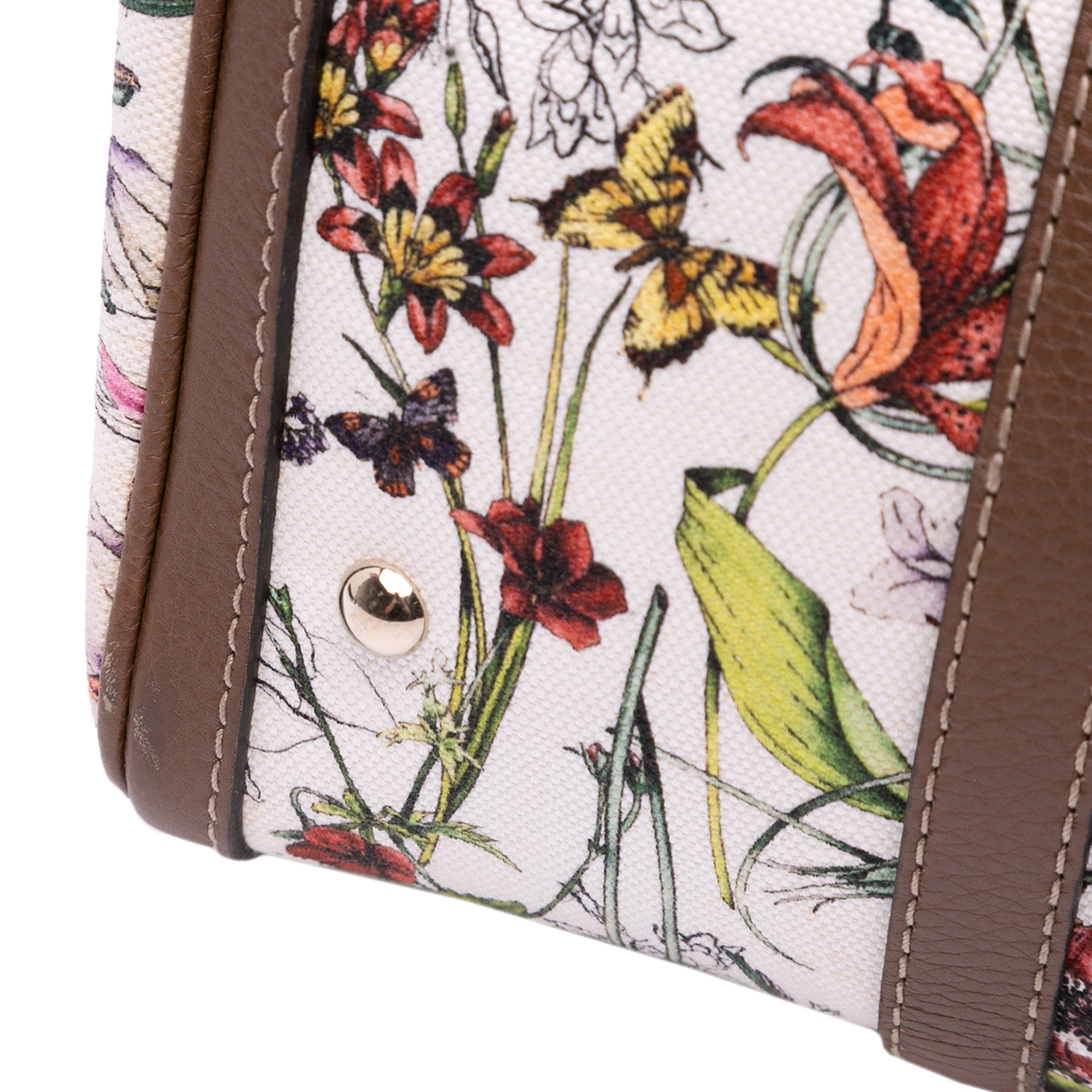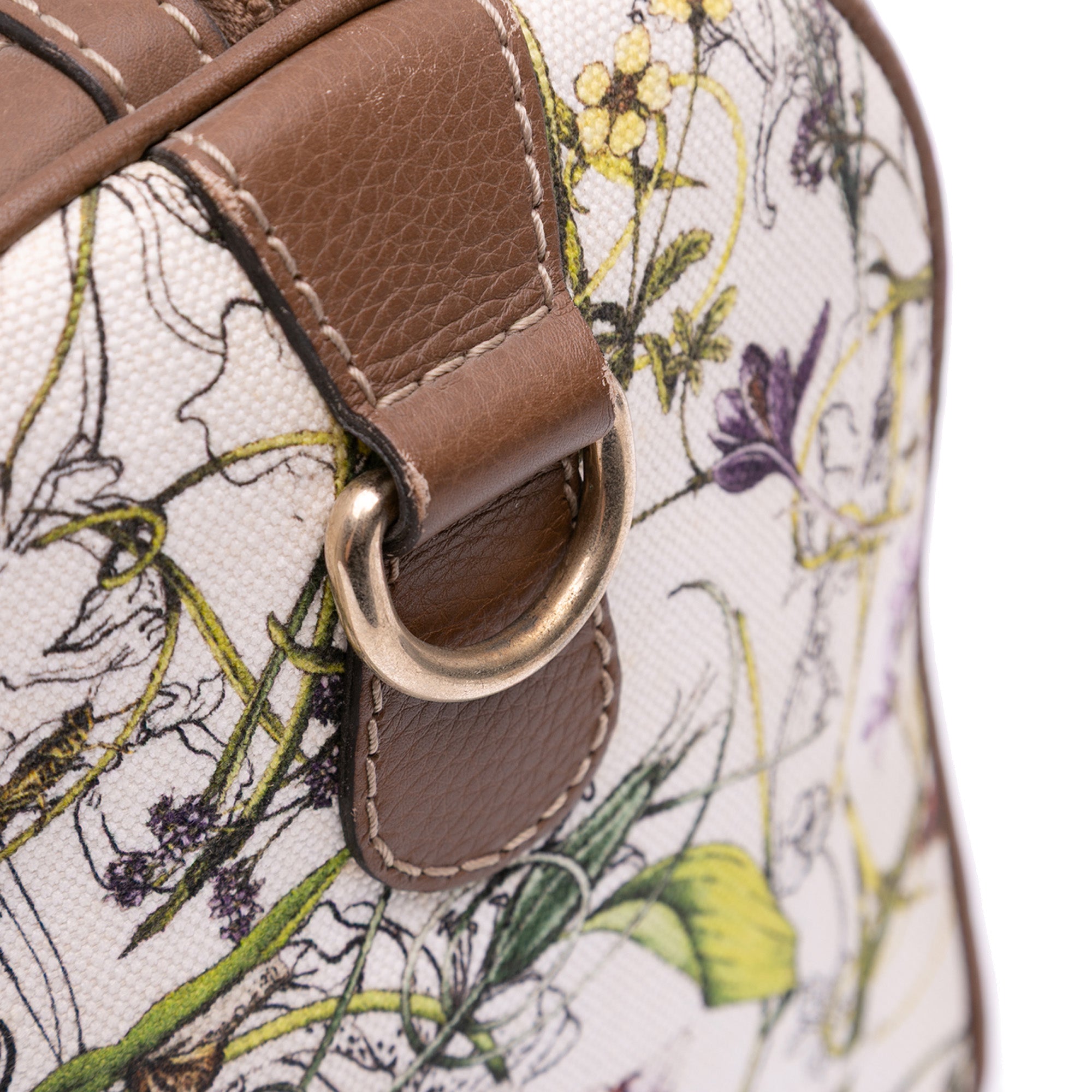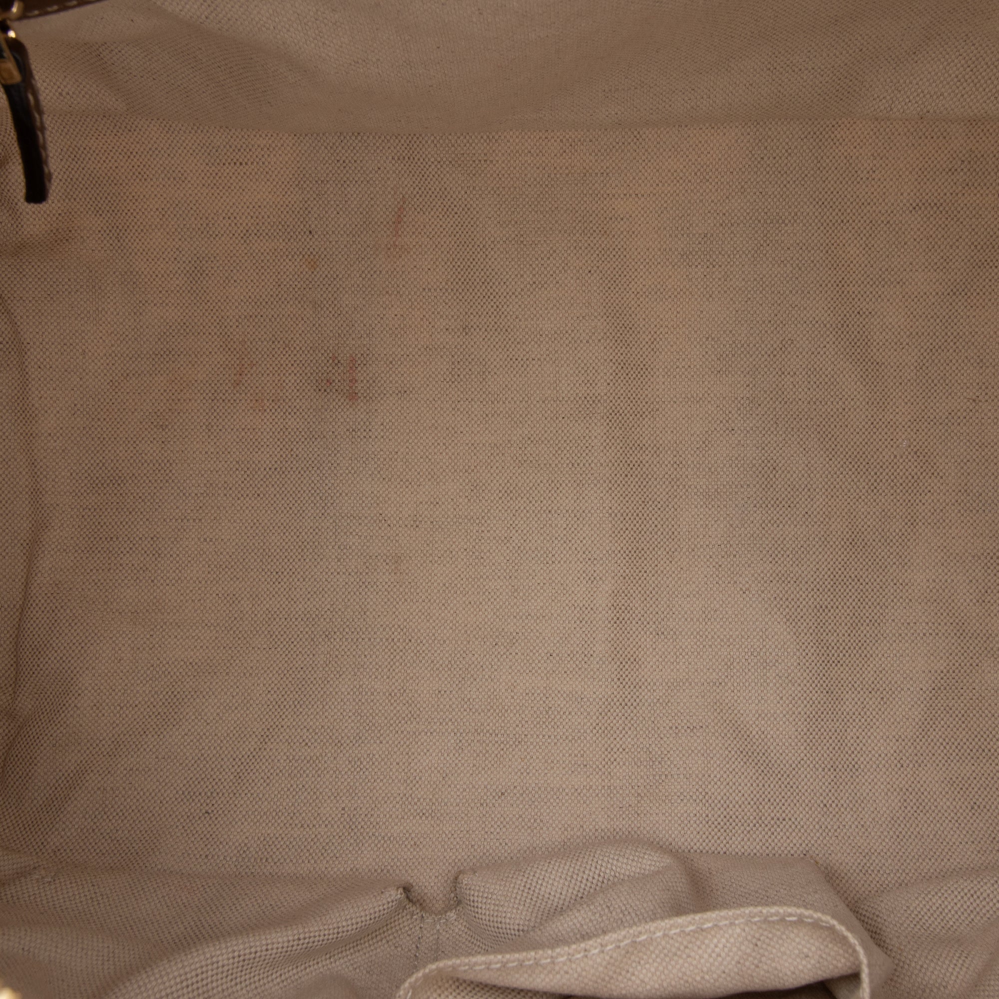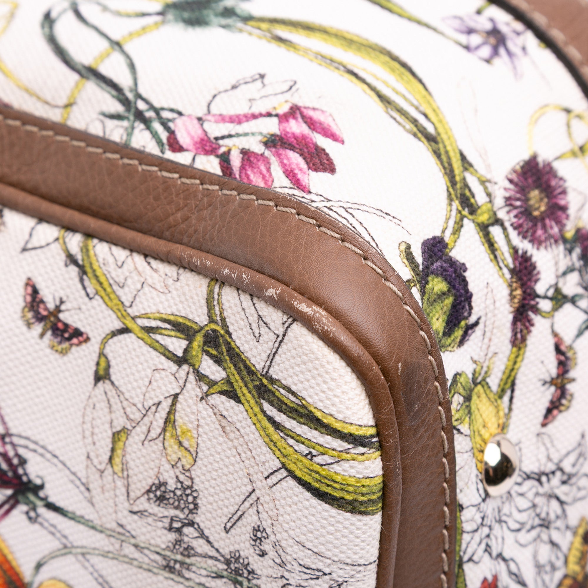This satchel features a printed canvas body with leather trim, rolled leather handles, a top zip closure, and interior zip and slip pockets. Retail Price: 1540.00