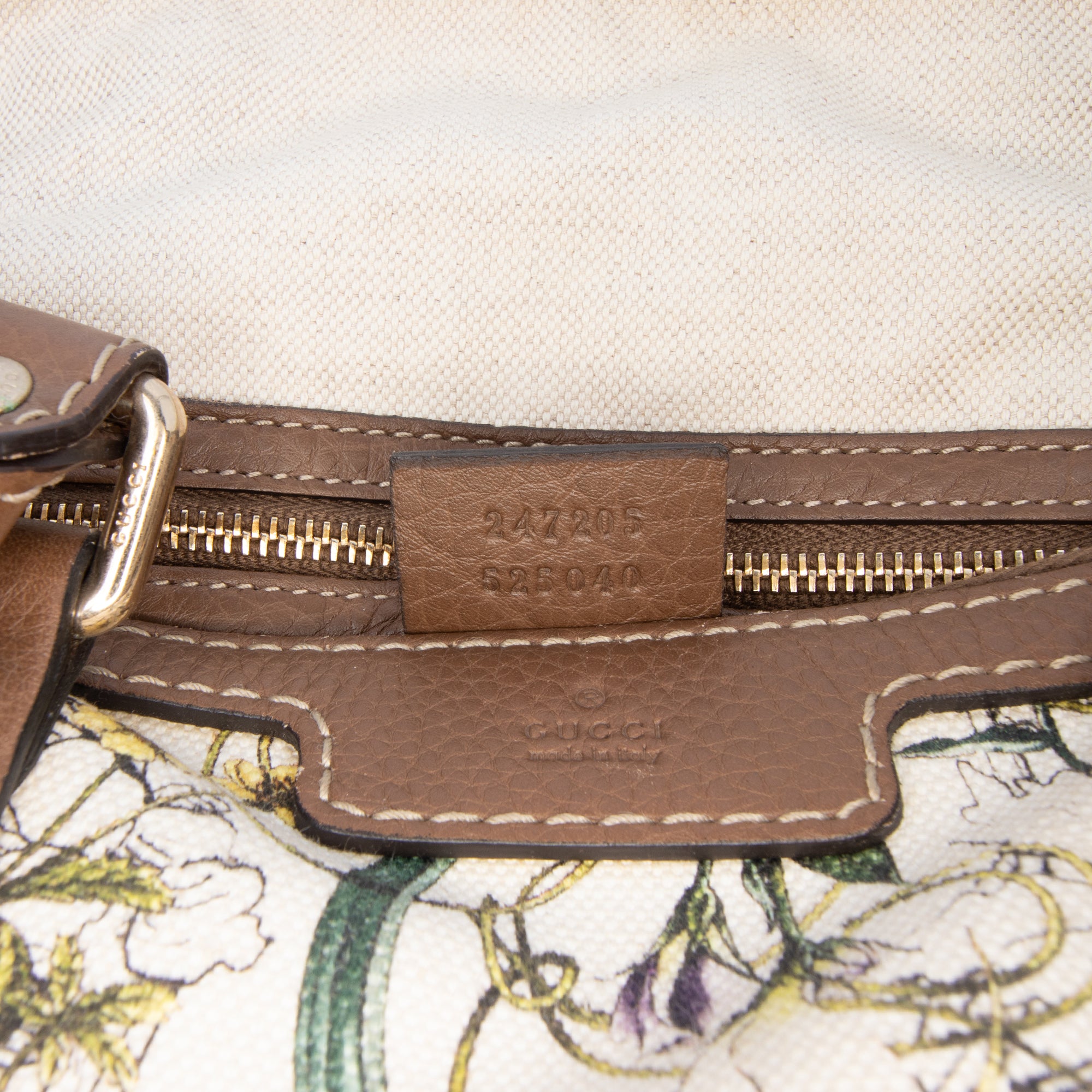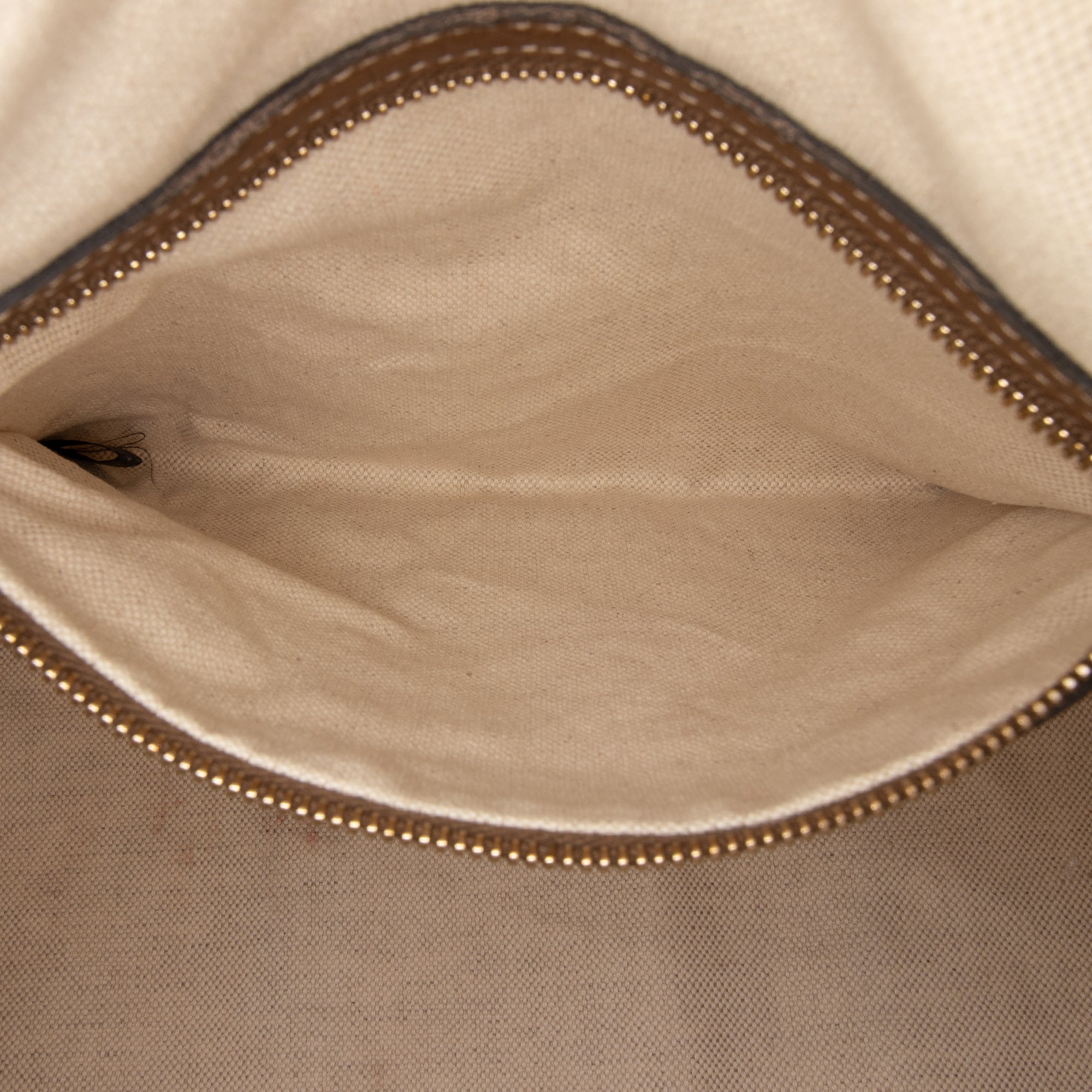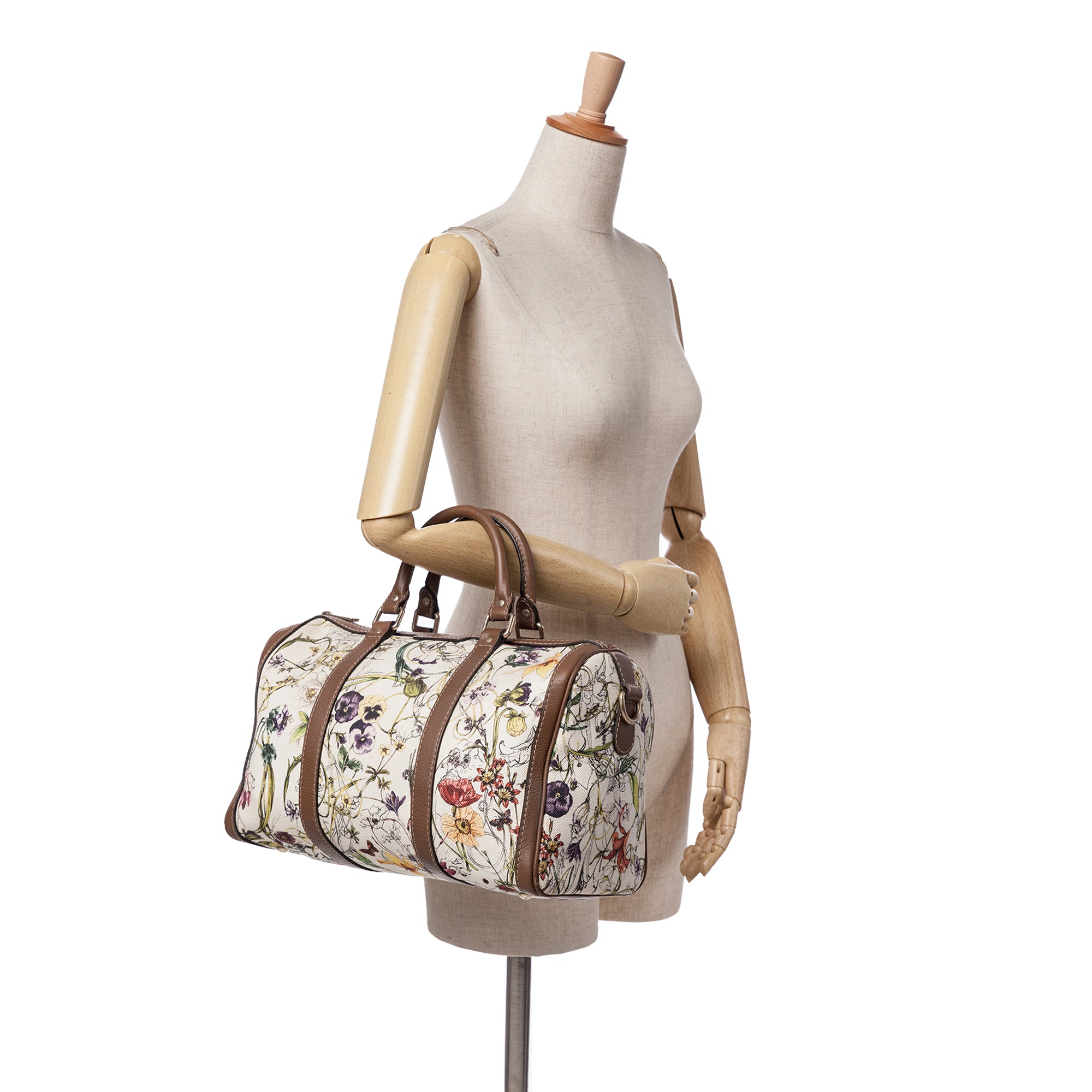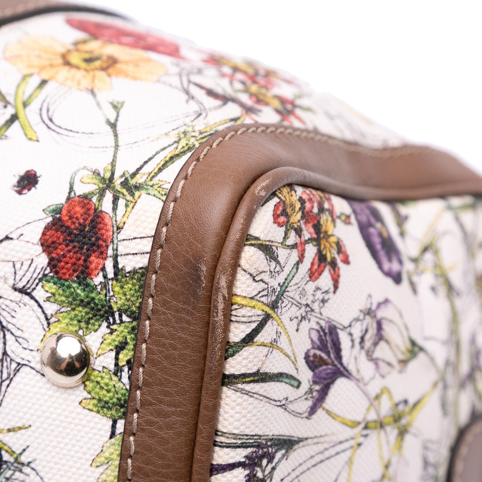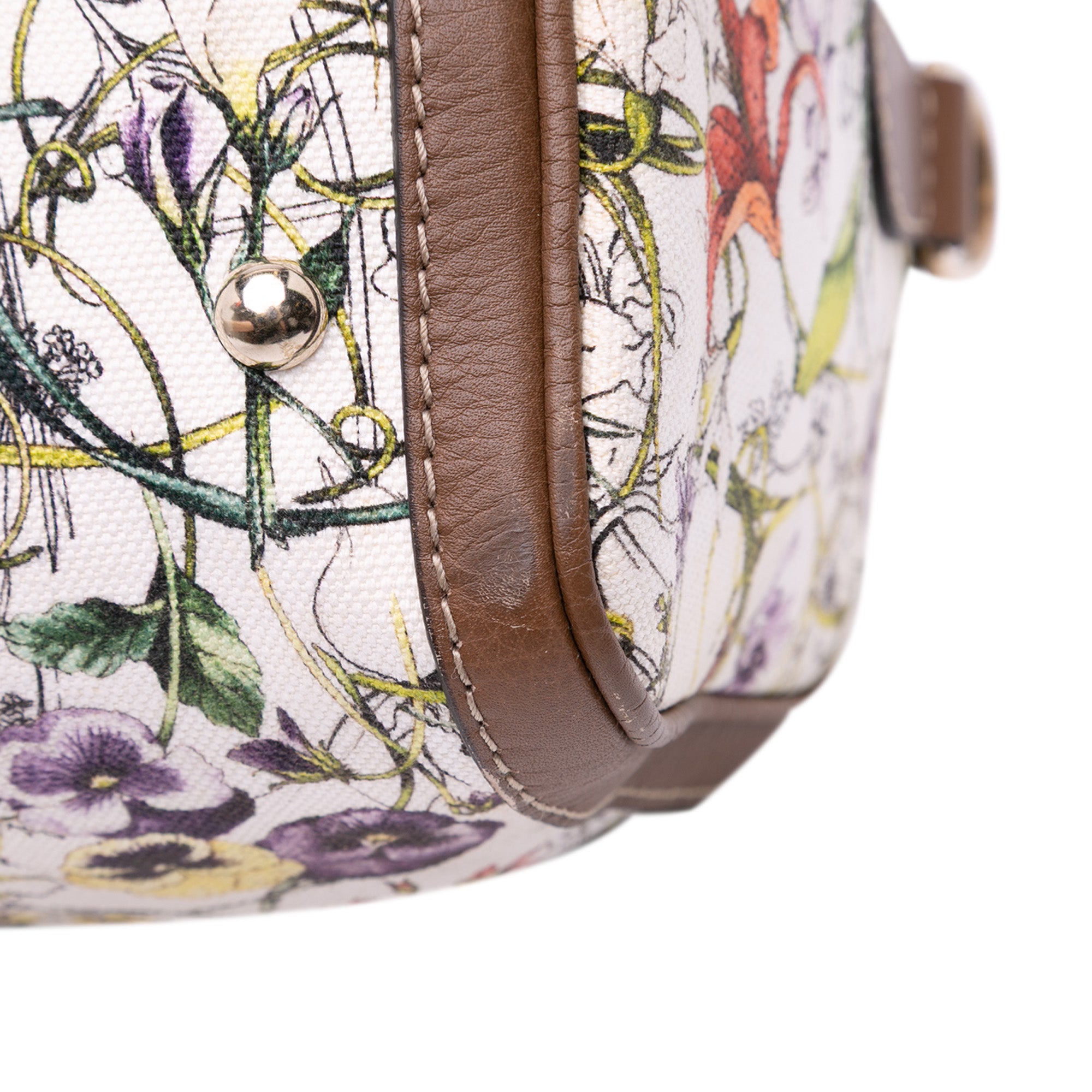 This satchel features a printed canvas body with leather trim, rolled leather handles, a top zip closure, and interior zip and slip pockets. Retail Price: 1540.00