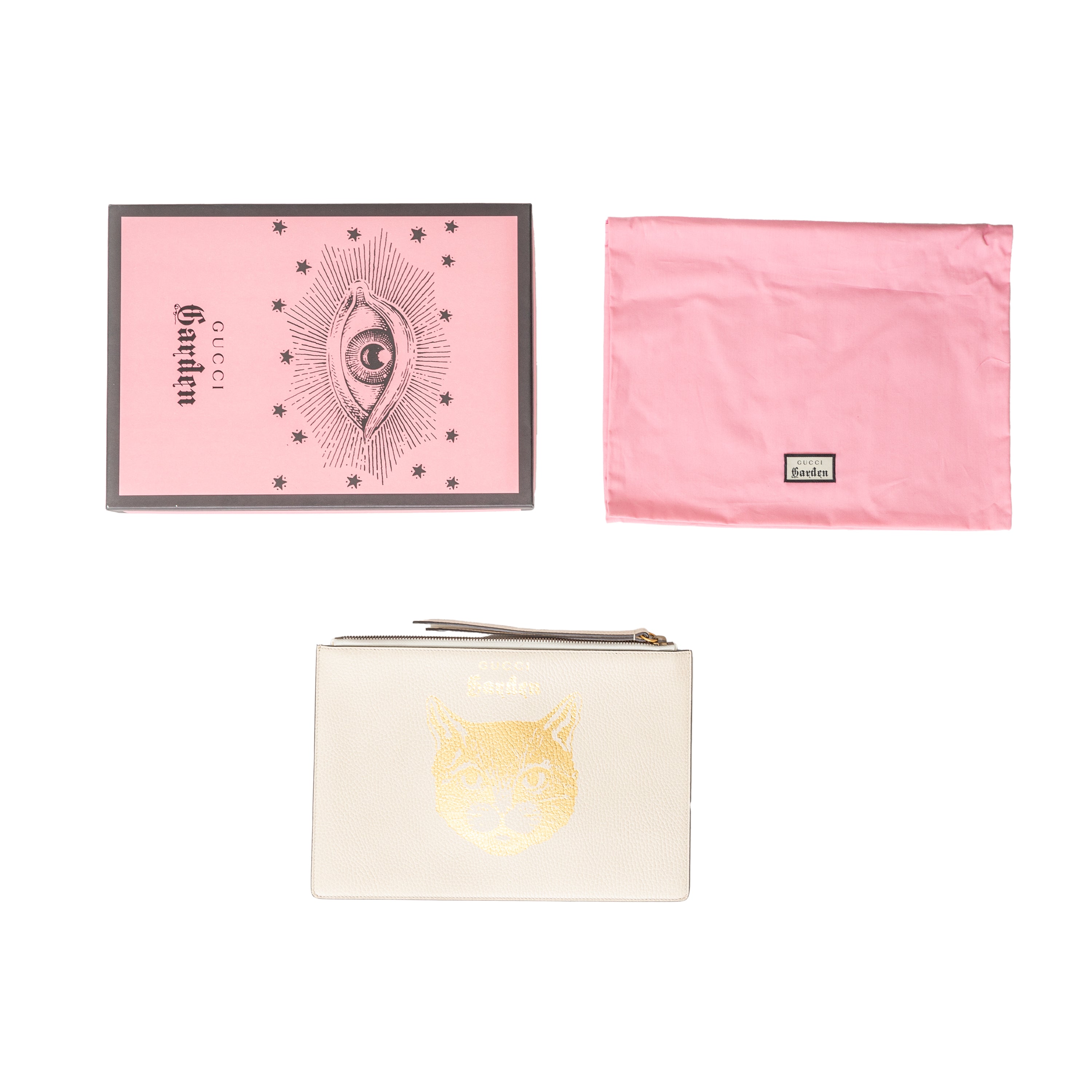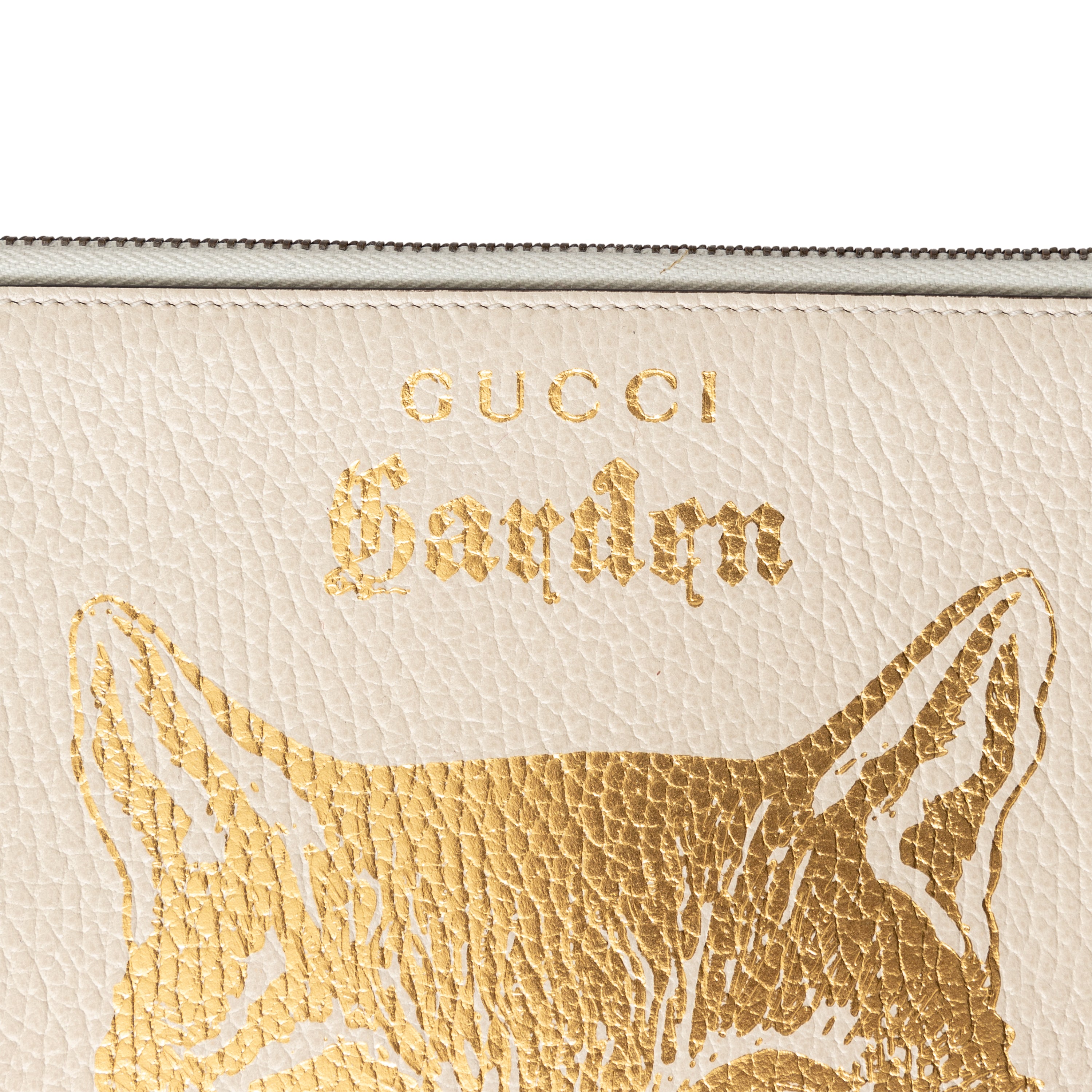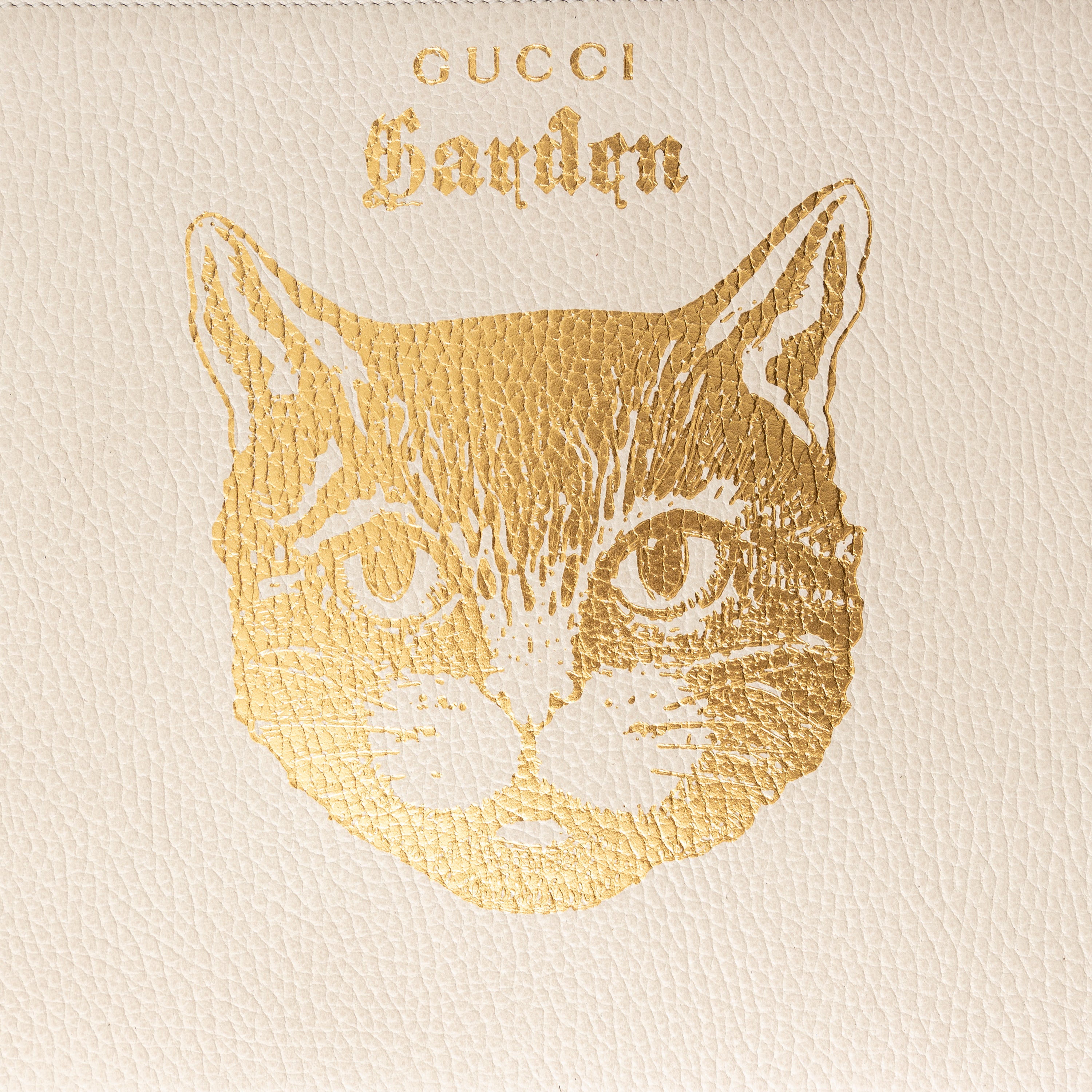 This off-white leather clutch from the Gucci Garden collection features a metallic gold cat graphic print, antiqued gold-tone hardware, nylon lining, and a zip closure.