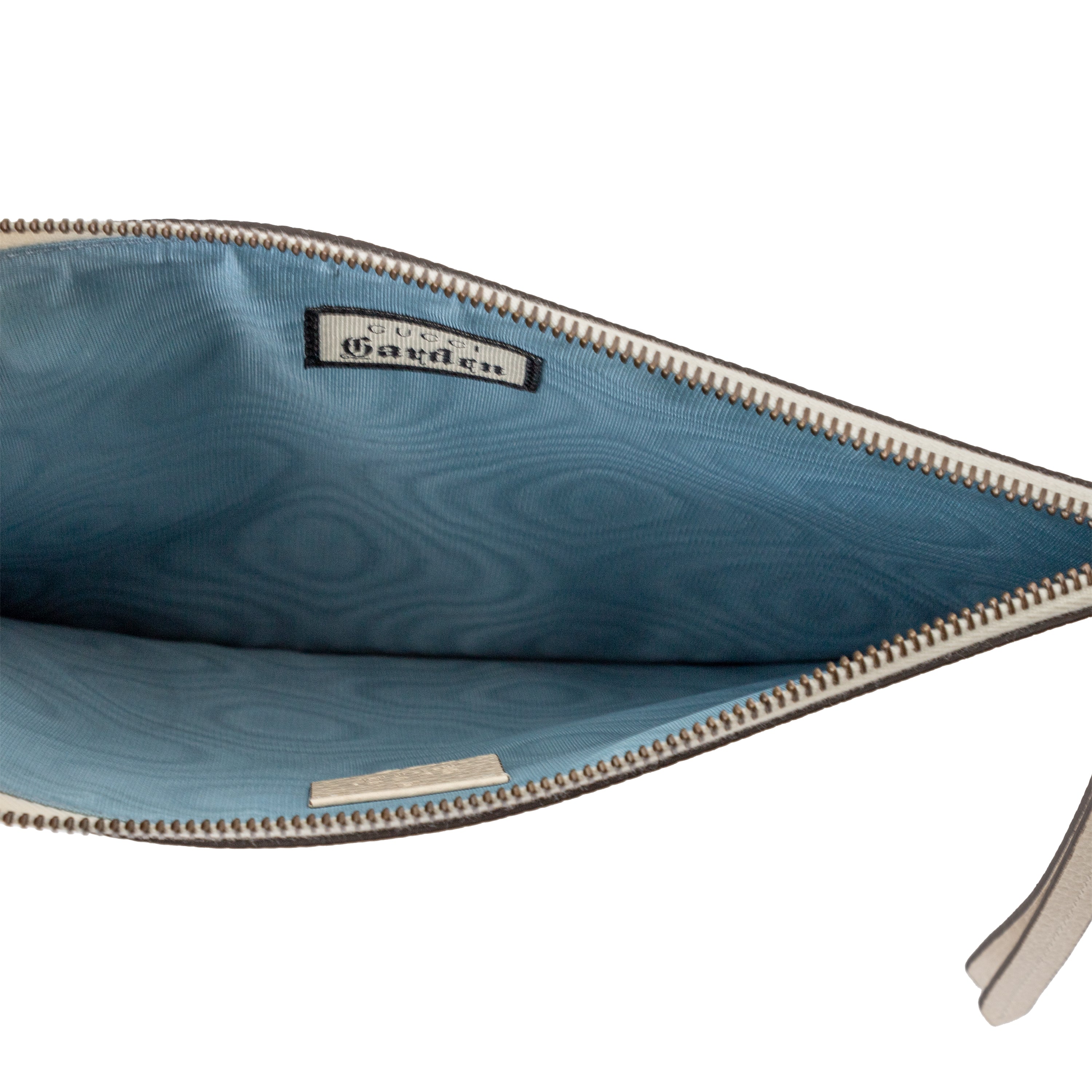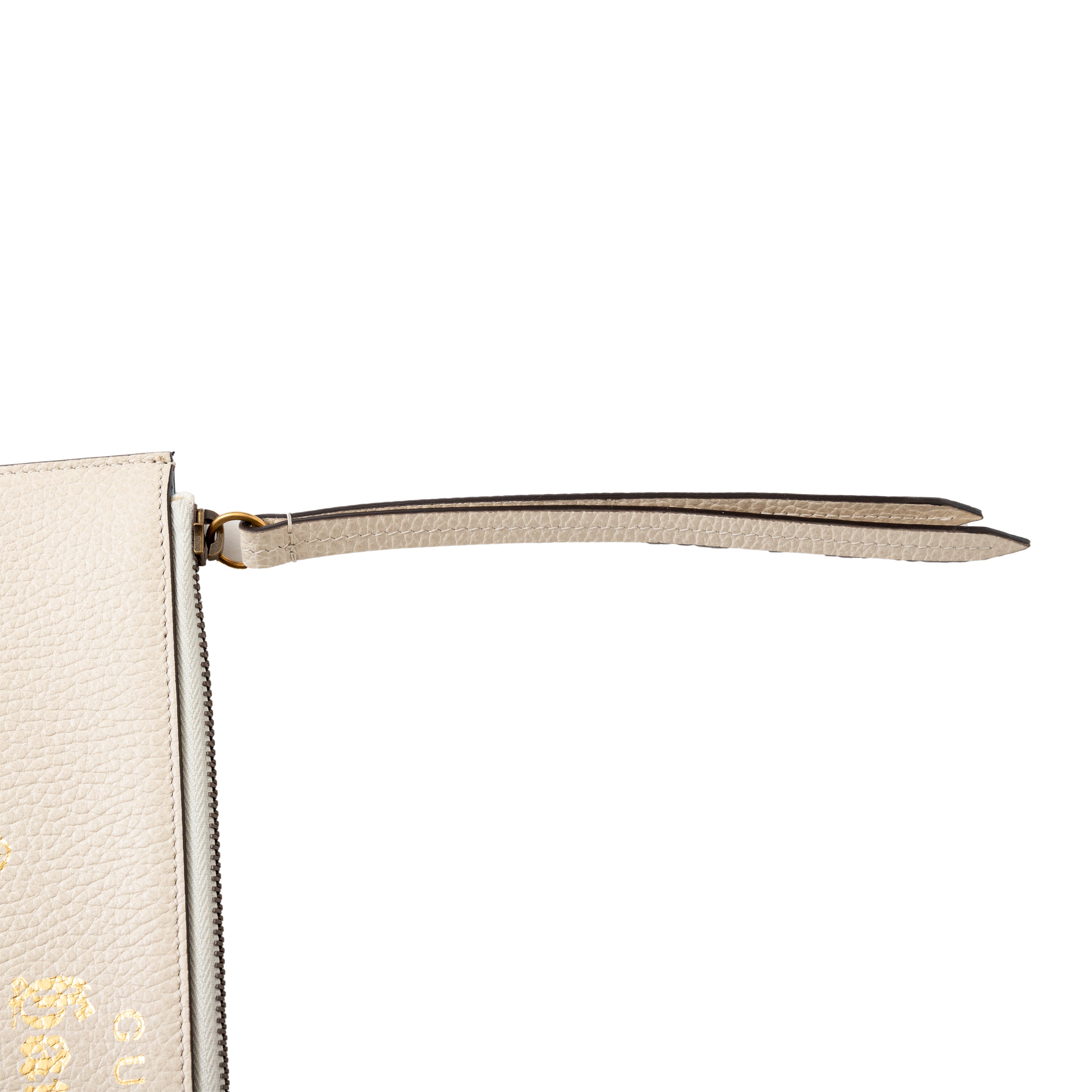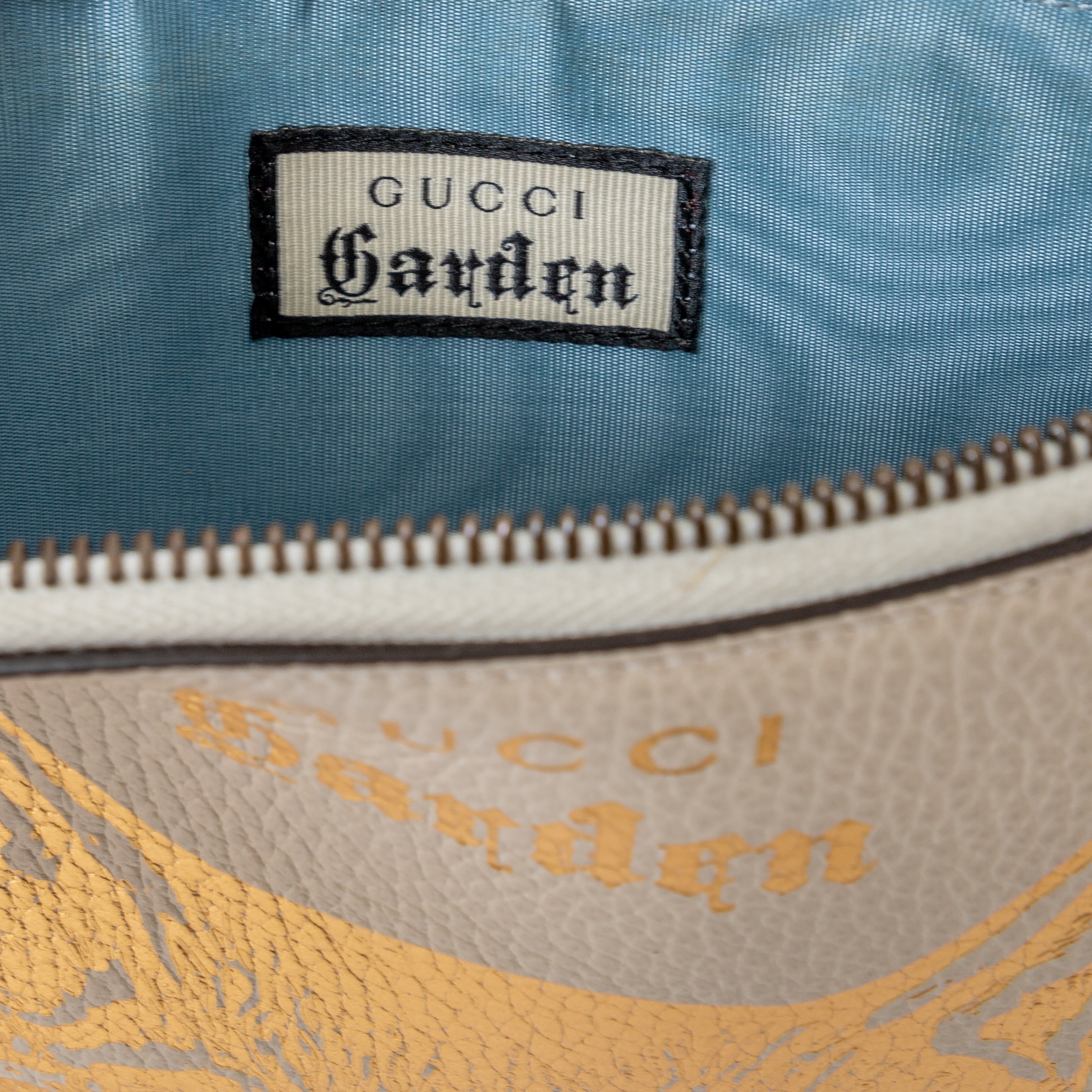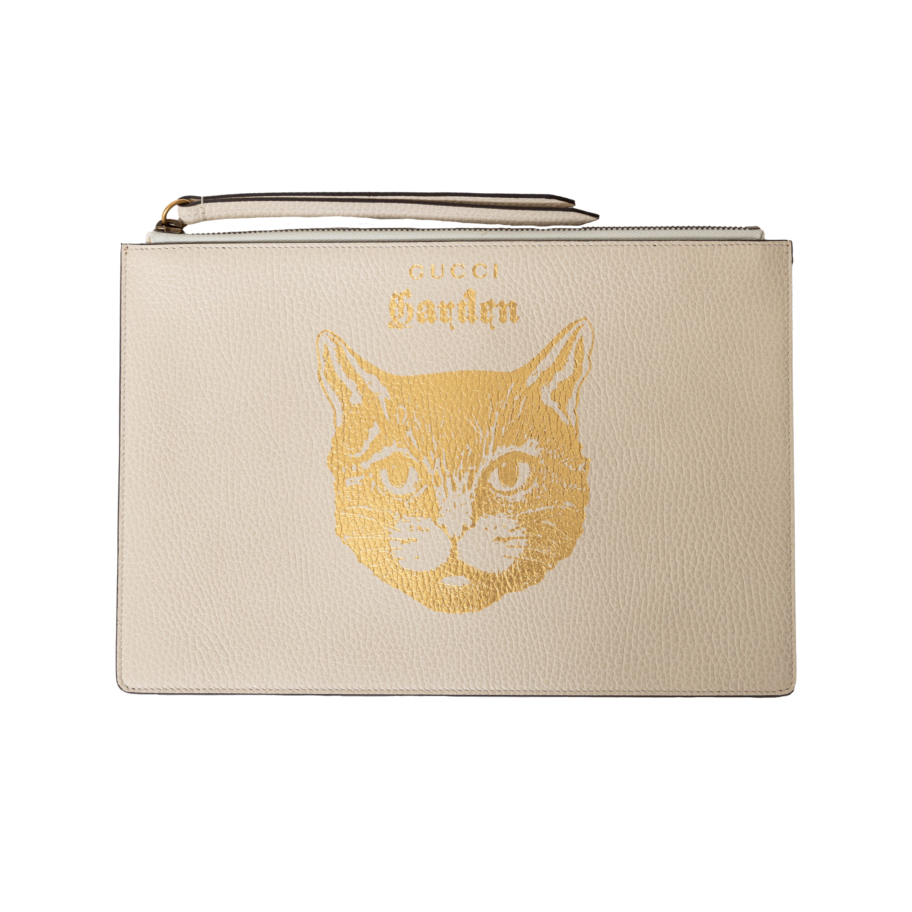 This off-white leather clutch from the Gucci Garden collection features a metallic gold cat graphic print, antiqued gold-tone hardware, nylon lining, and a zip closure.