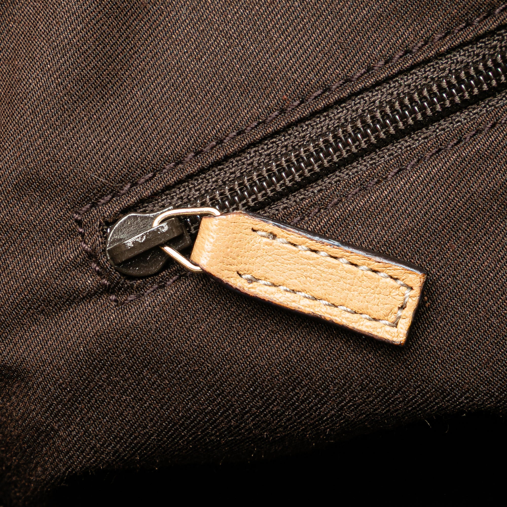 This crossbody bag features a canvas body with leather trim, a flat leather shoulder strap, a top zip closure, and interior zip and slip pockets. Retail Price: 925.00