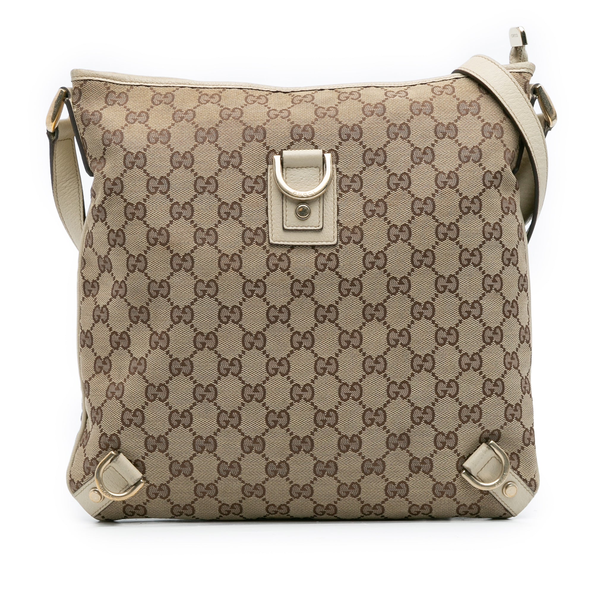 The Abbey crossbody bag features a canvas body with leather trim, an adjustable flat leather strap, a top zip closure, and interior zip and slip pockets. Retail Price: 910.00