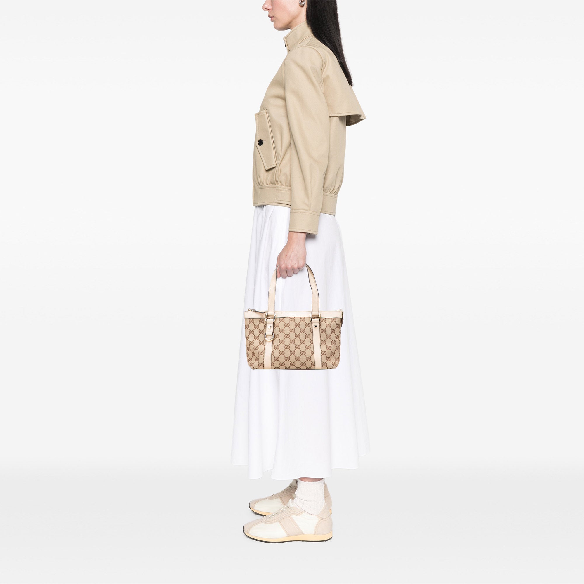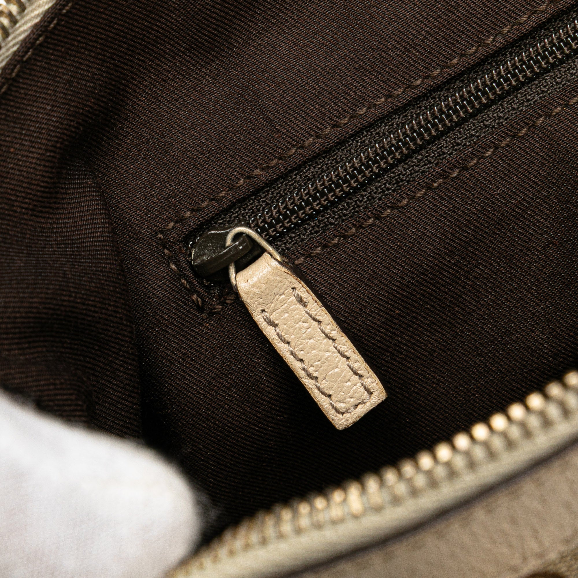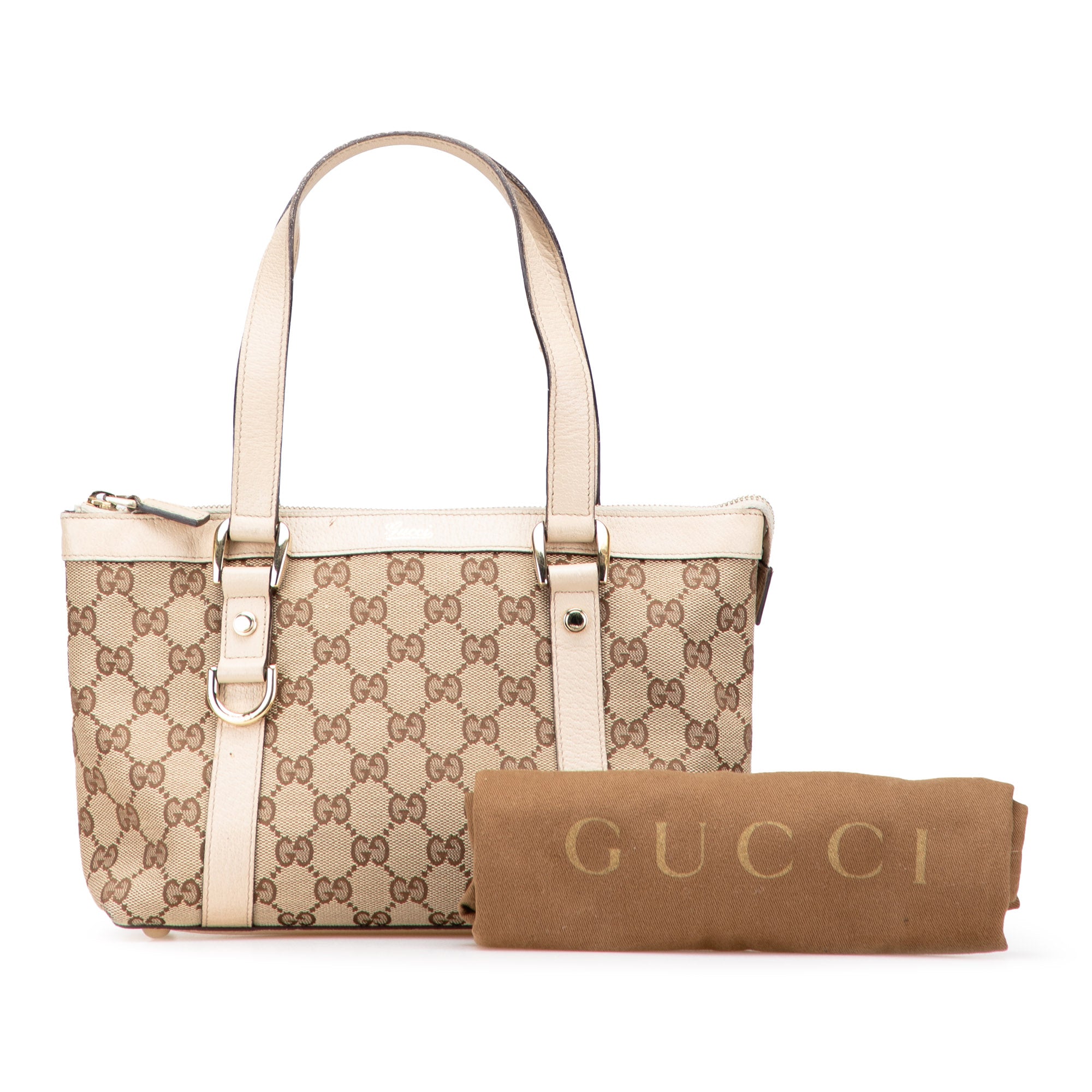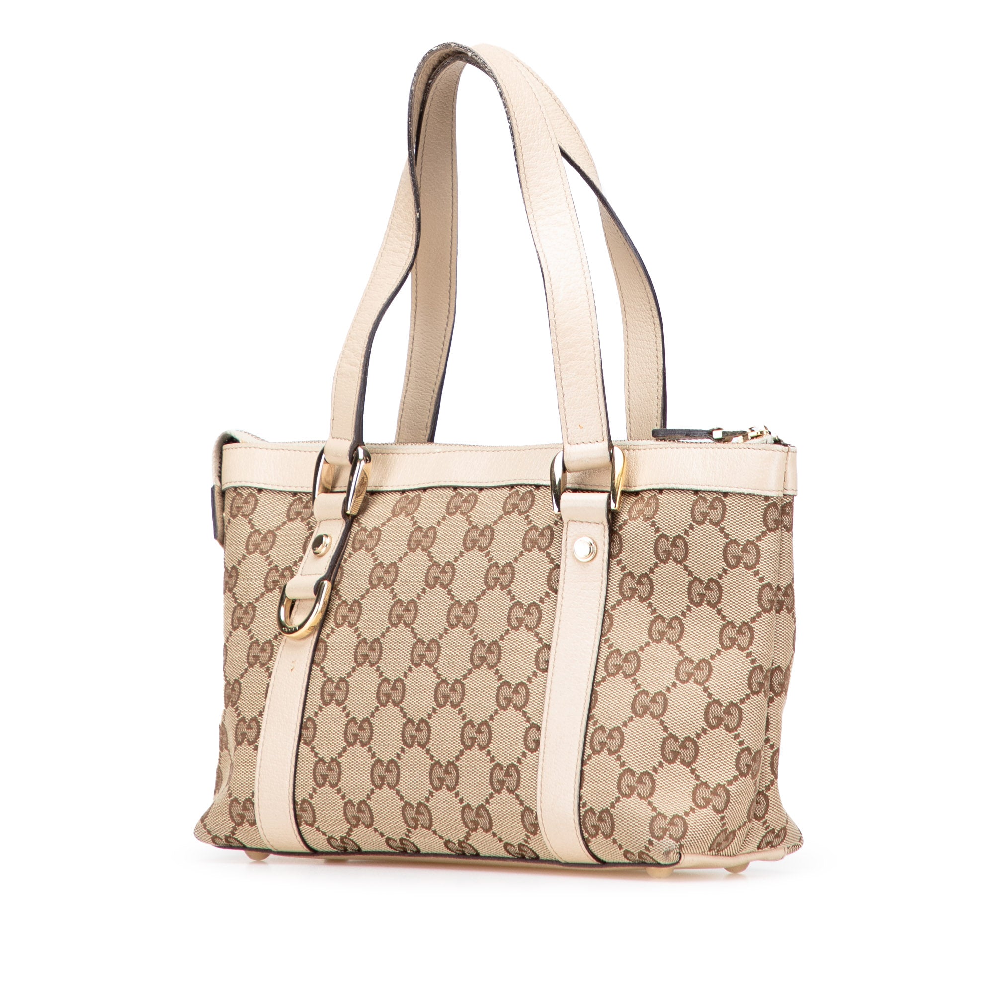 This tote bag features a canvas body with leather trim, flat leather straps, top zip closure, and an interior zip and slip pockets. Inclusion: Dust bag. Retail Price: 850.00