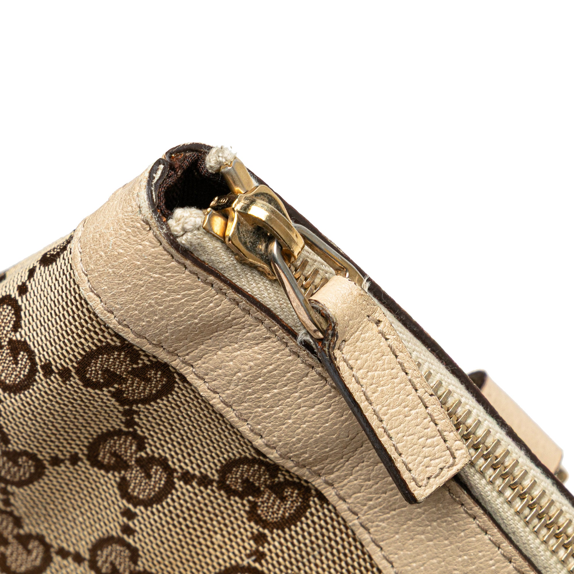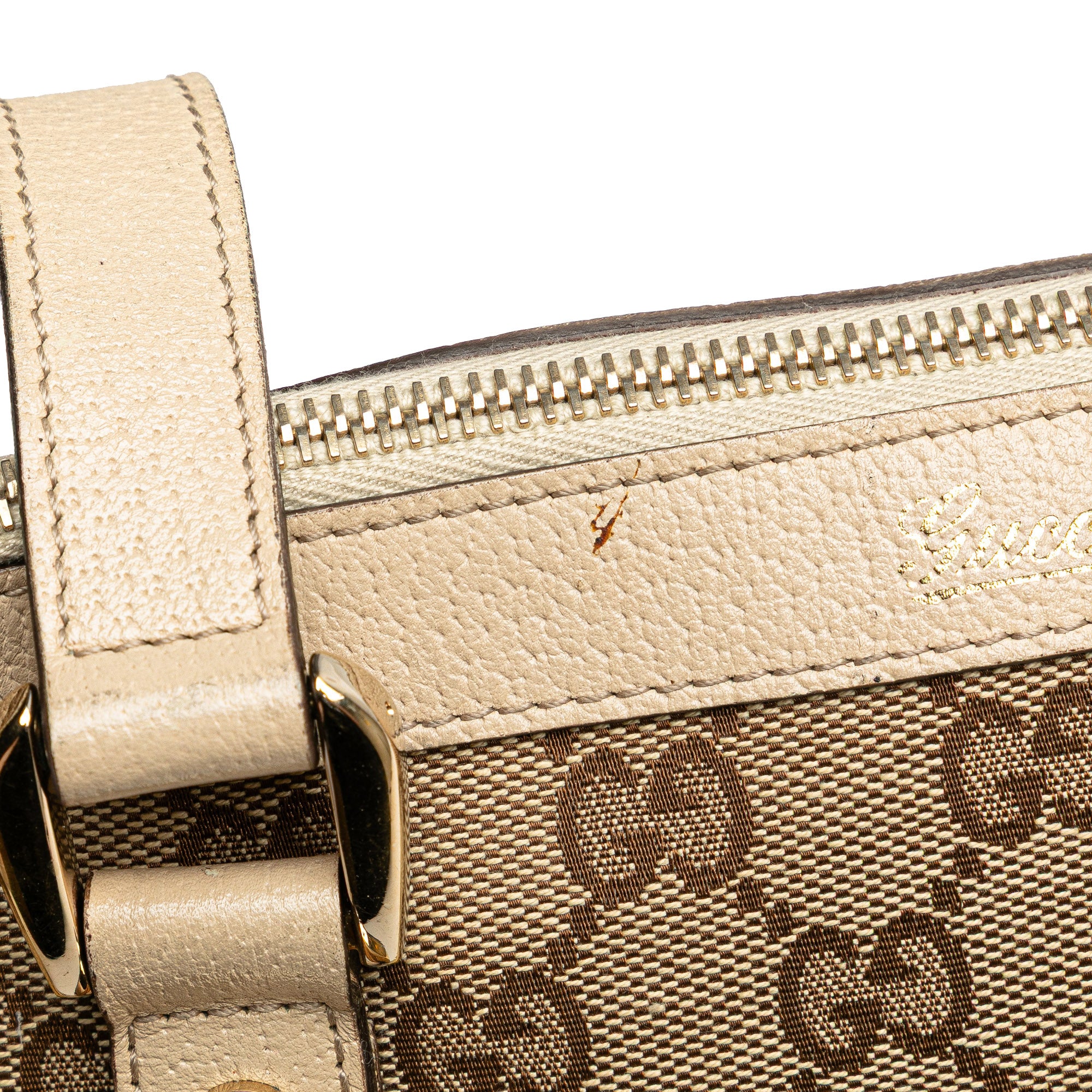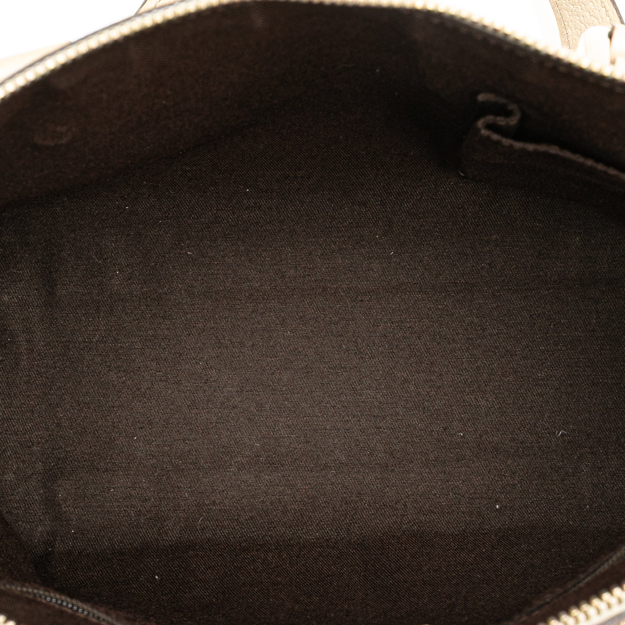 This tote bag features a canvas body with leather trim, flat leather straps, top zip closure, and an interior zip and slip pockets. Inclusion: Dust bag. Retail Price: 850.00
