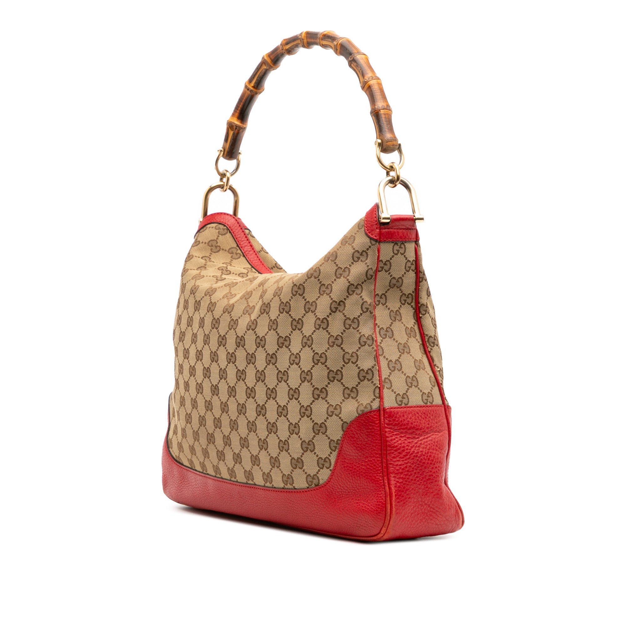 The Diana satchel features a canvas body with leather trim, a bamboo handle, a detachable flat leather strap, an open top, and interior zip and slip pockets. Retail Price: 795.00