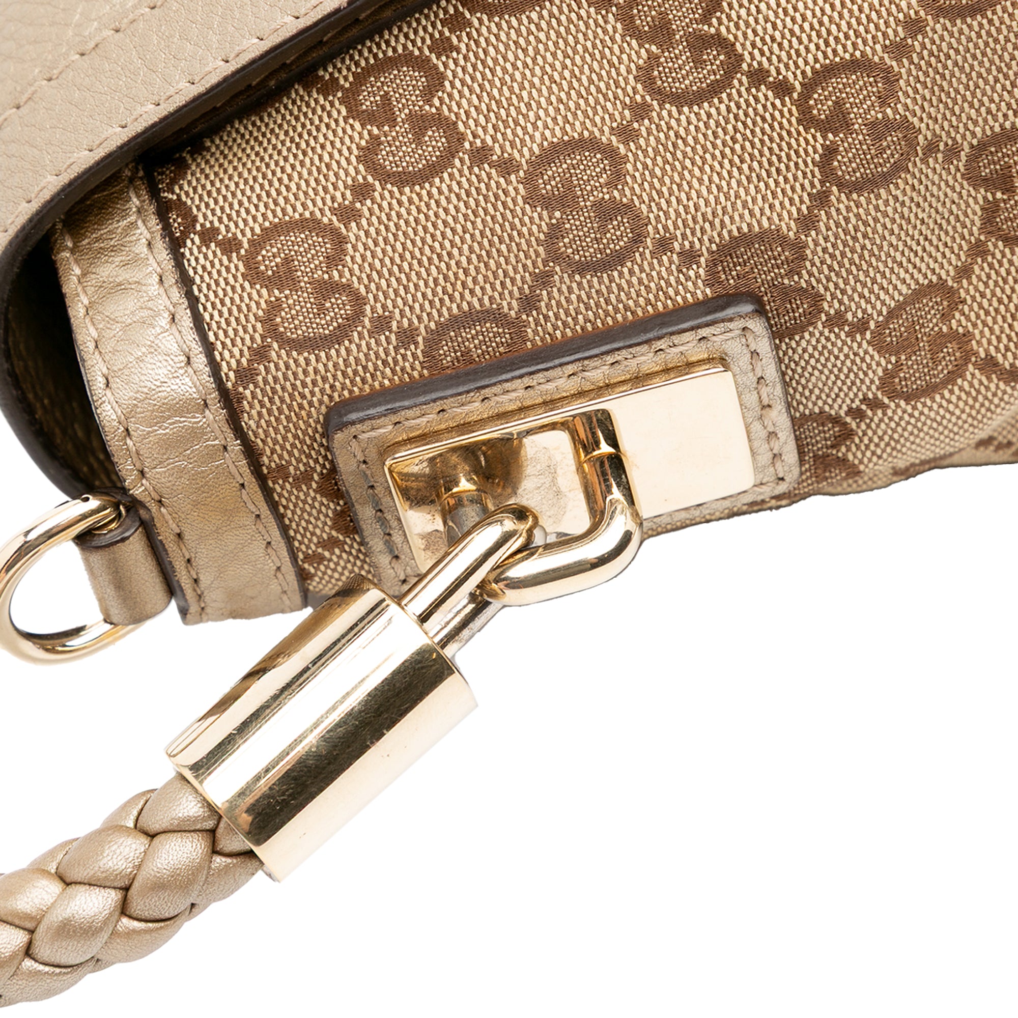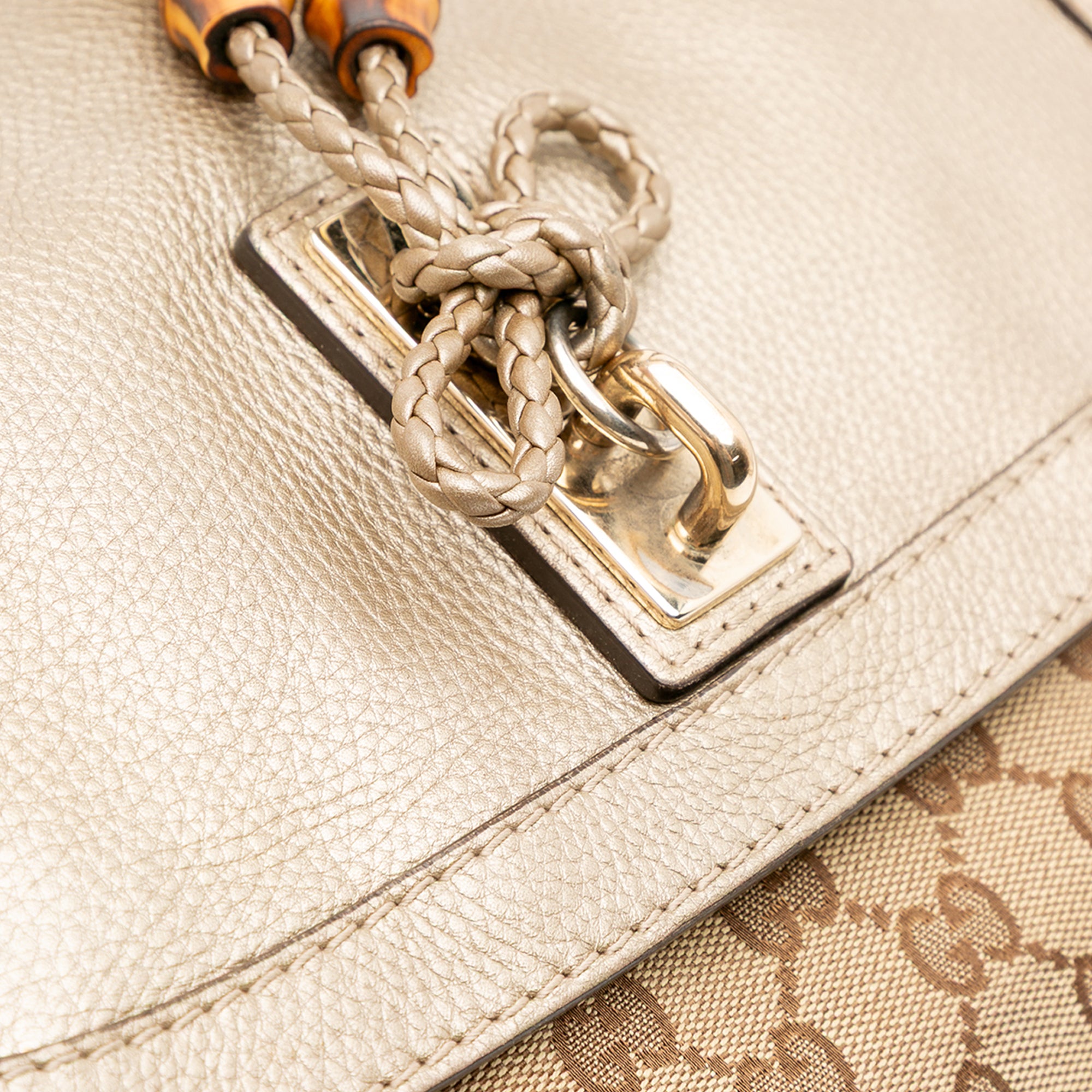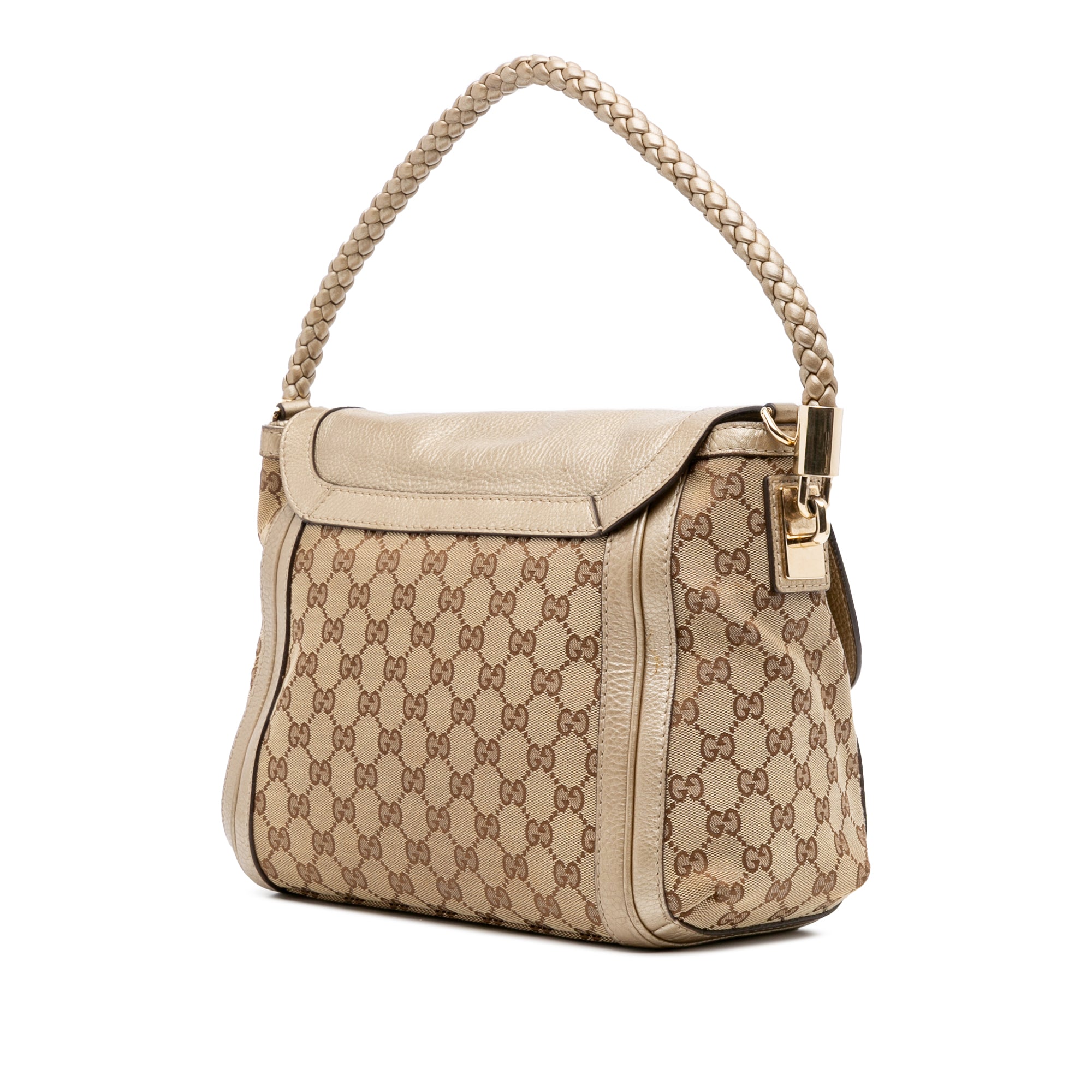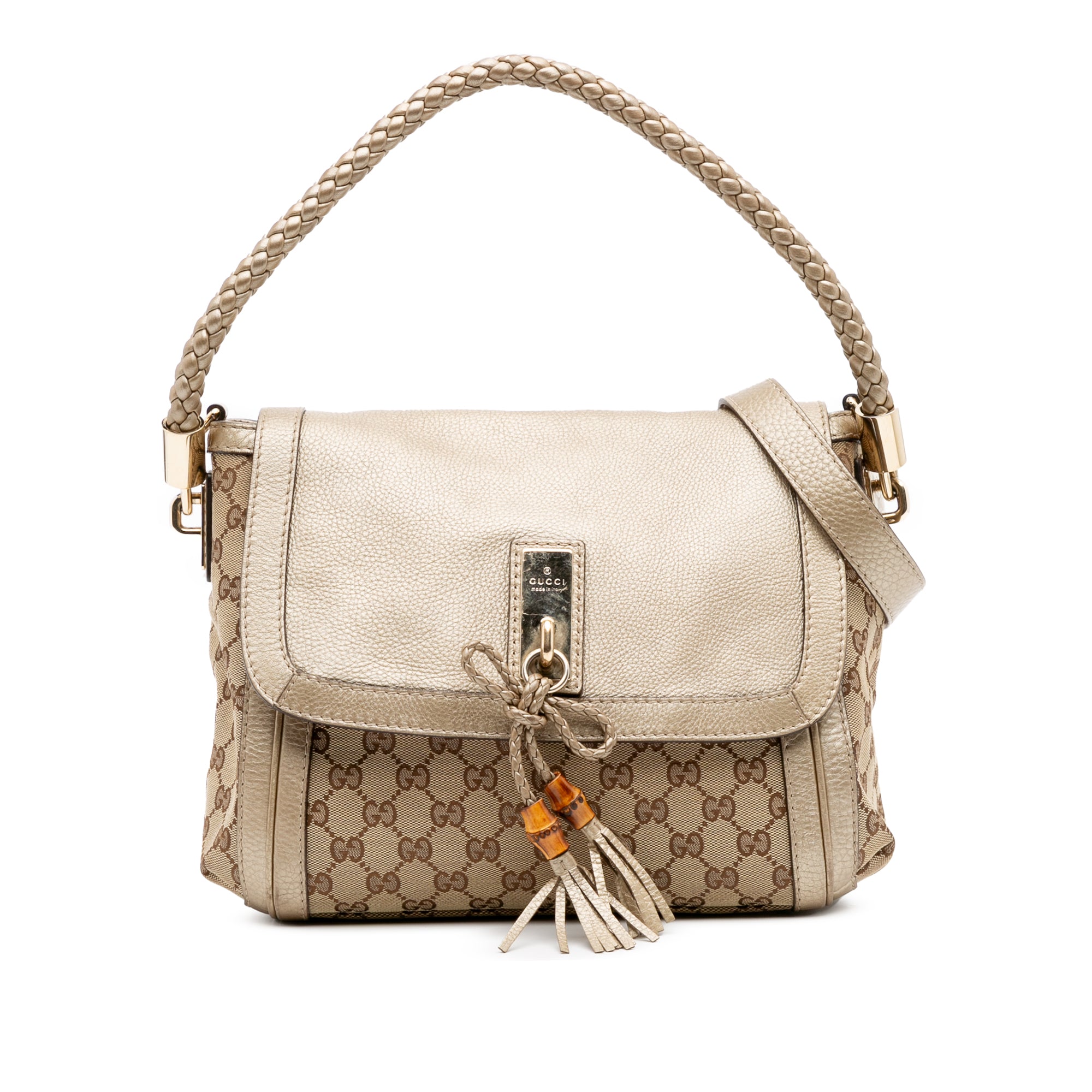 The Bella features a canvas body with leather trim, a braided leather handle, a detachable flat leather shoulder strap, a top flap with magnetic snap button closure, and interior zip and slip pockets. Retail Price: 1500.00