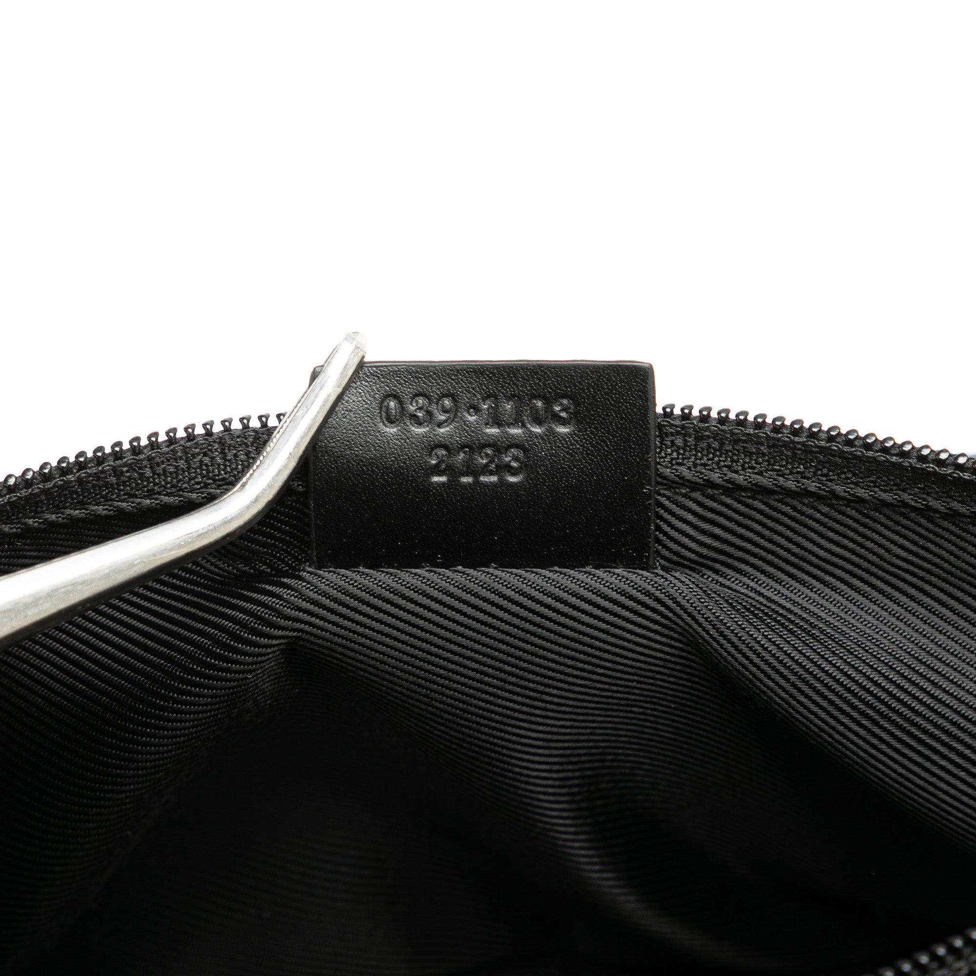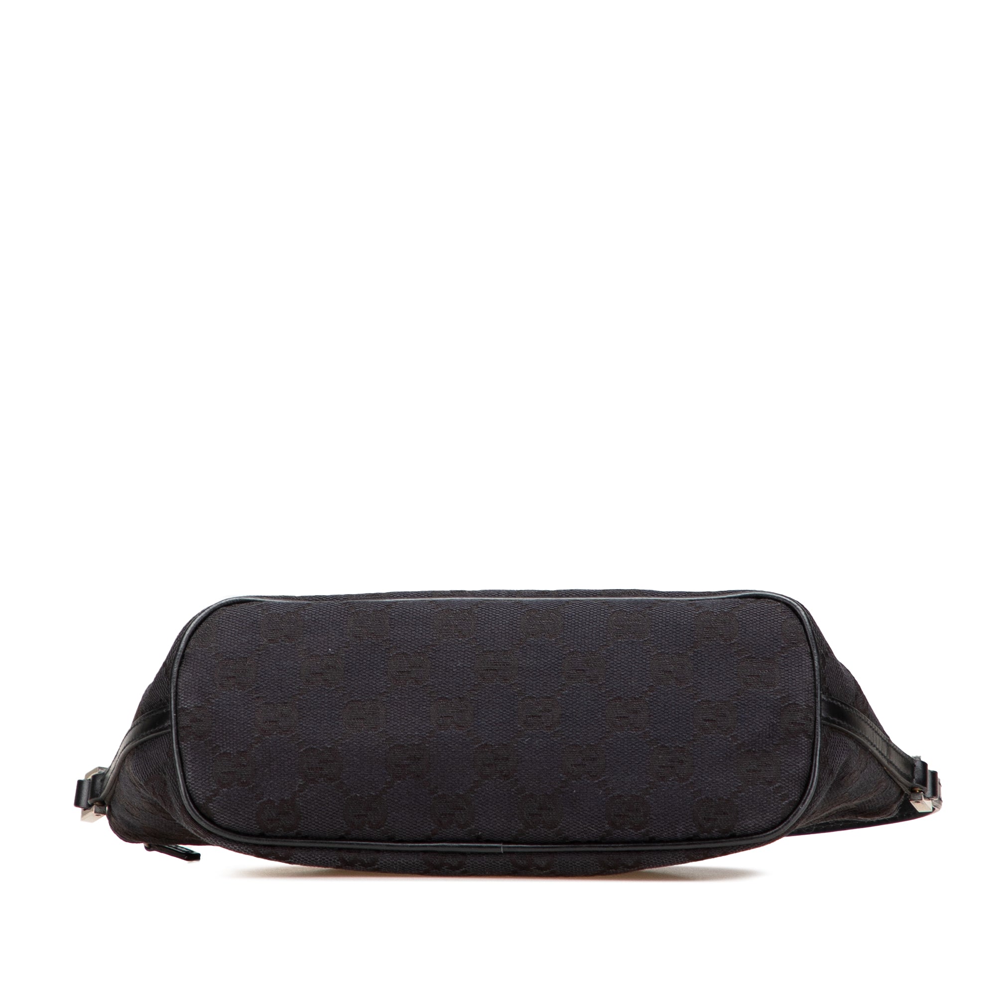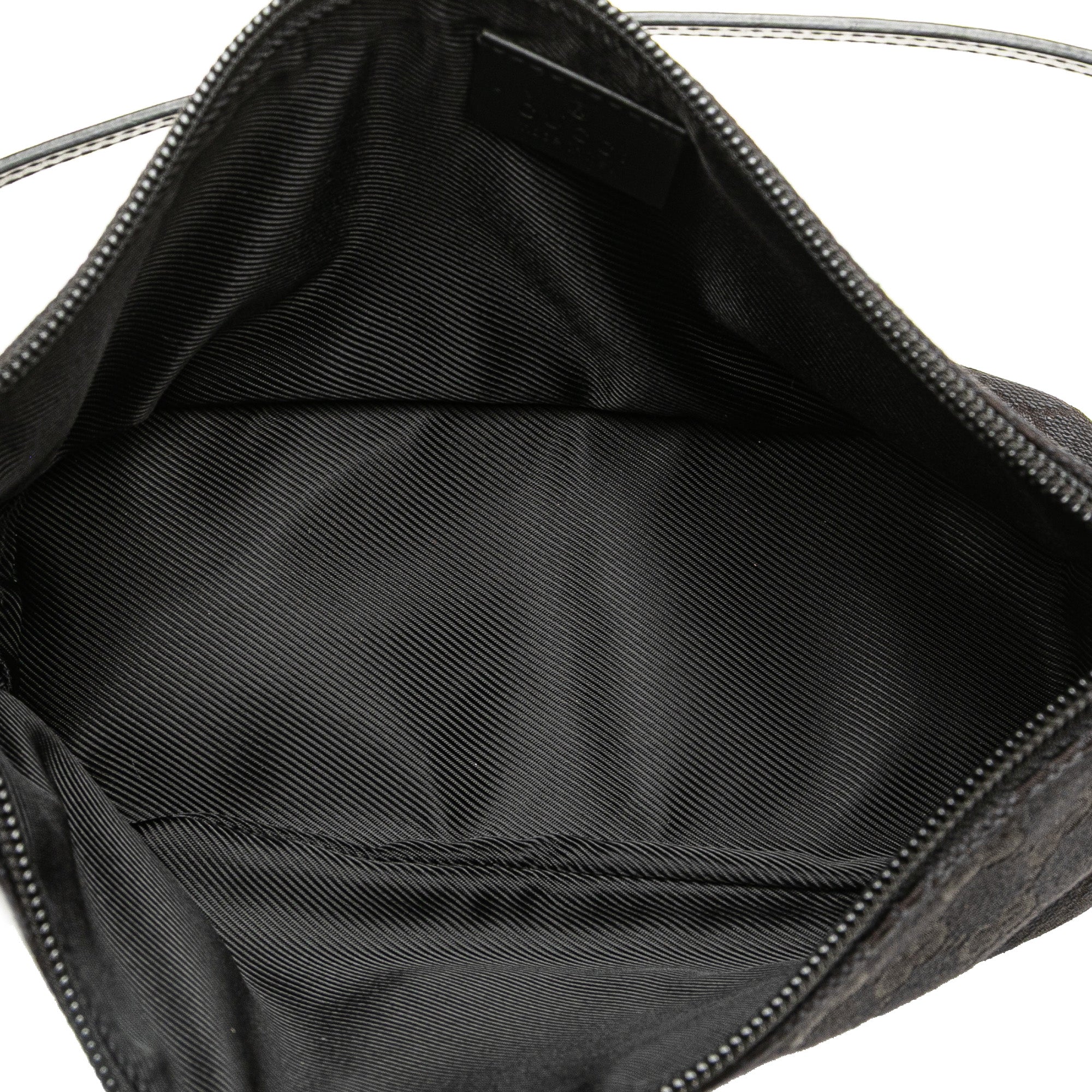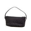 This shoulder bag features a canvas body with leather trim, a flat leather strap, and a top zip closure. Retail Price: 675.00