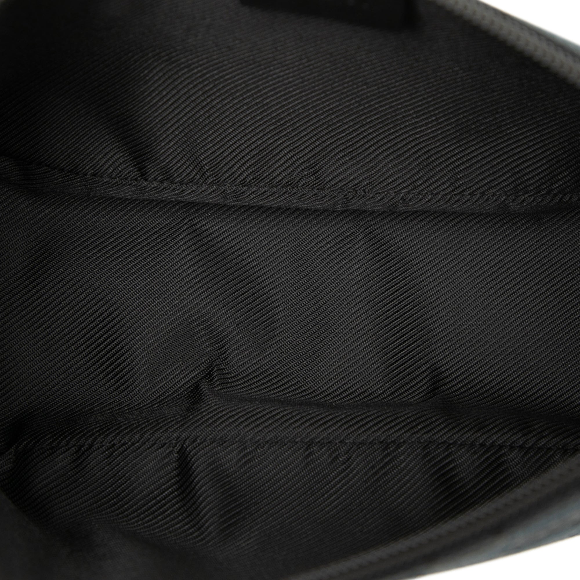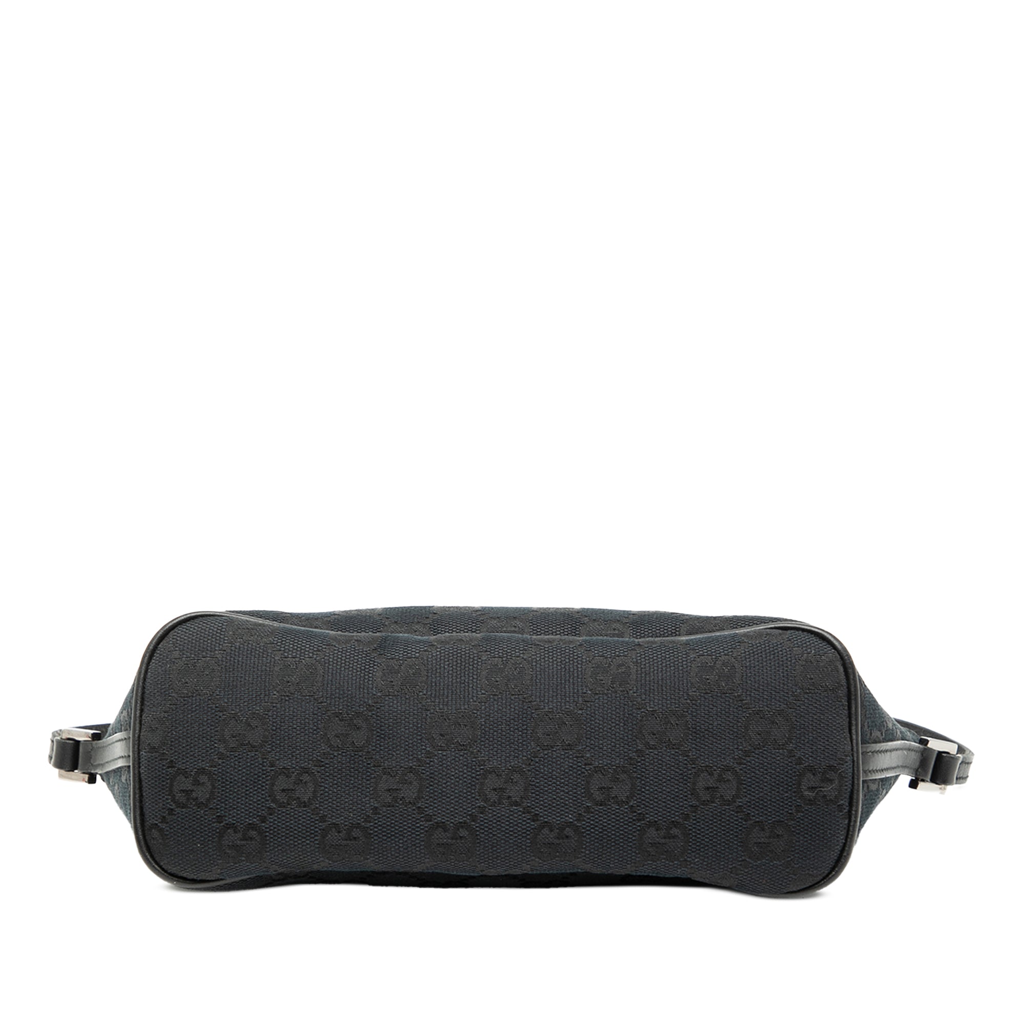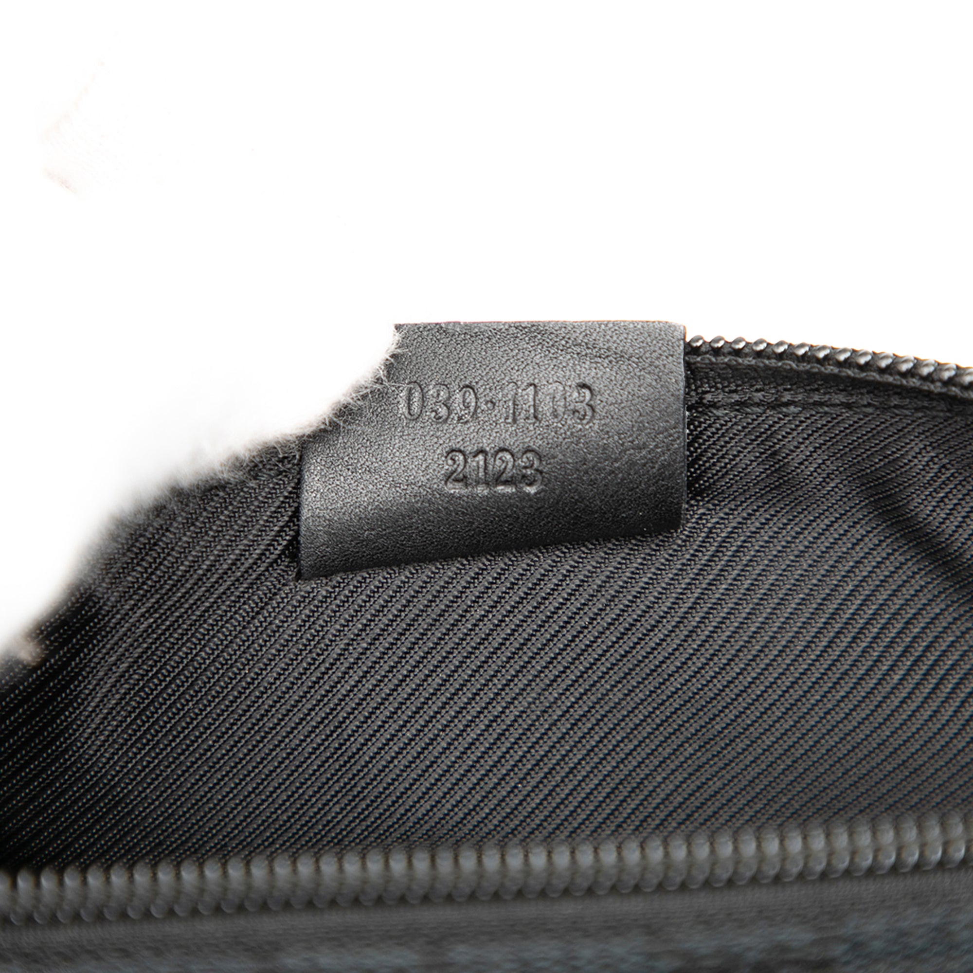 This shoulder bag features a canvas body with leather trim, a flat leather strap, and a top zip closure. Retail Price: 675.00