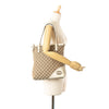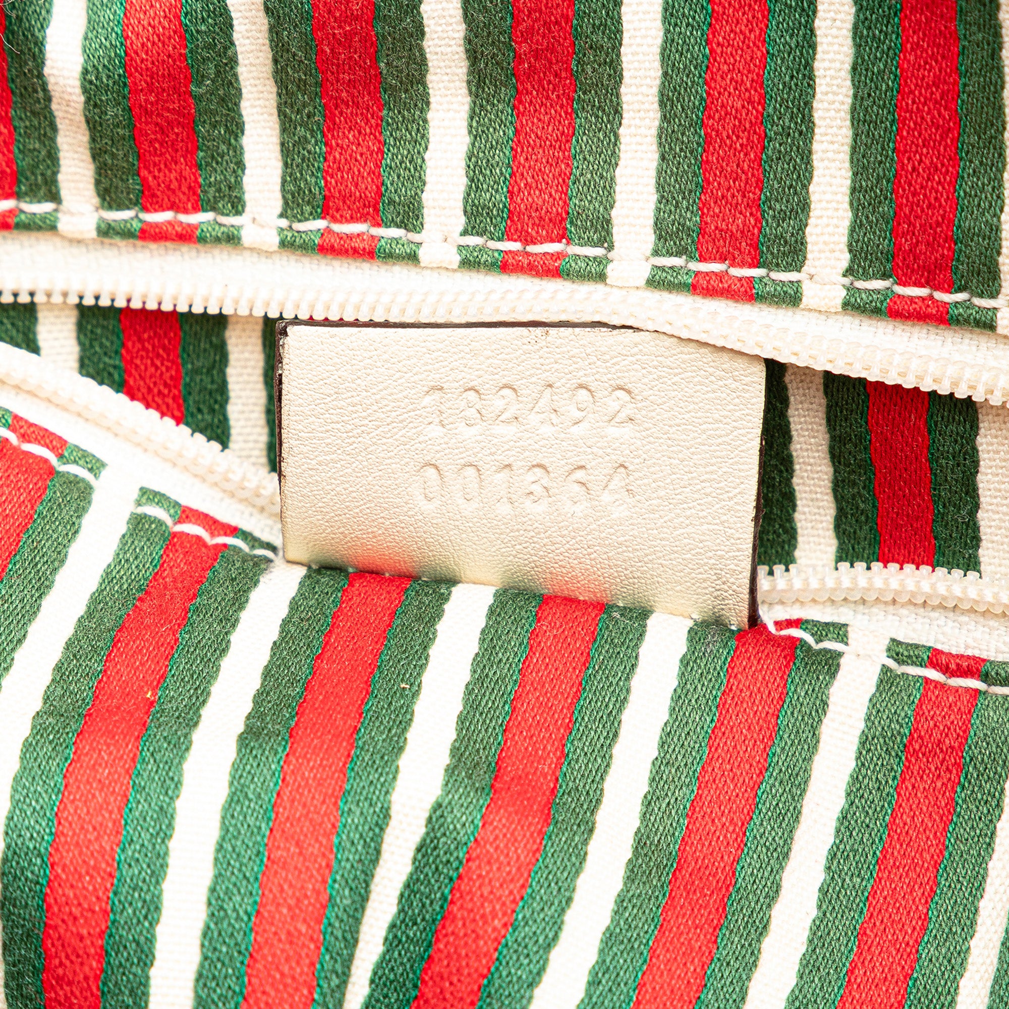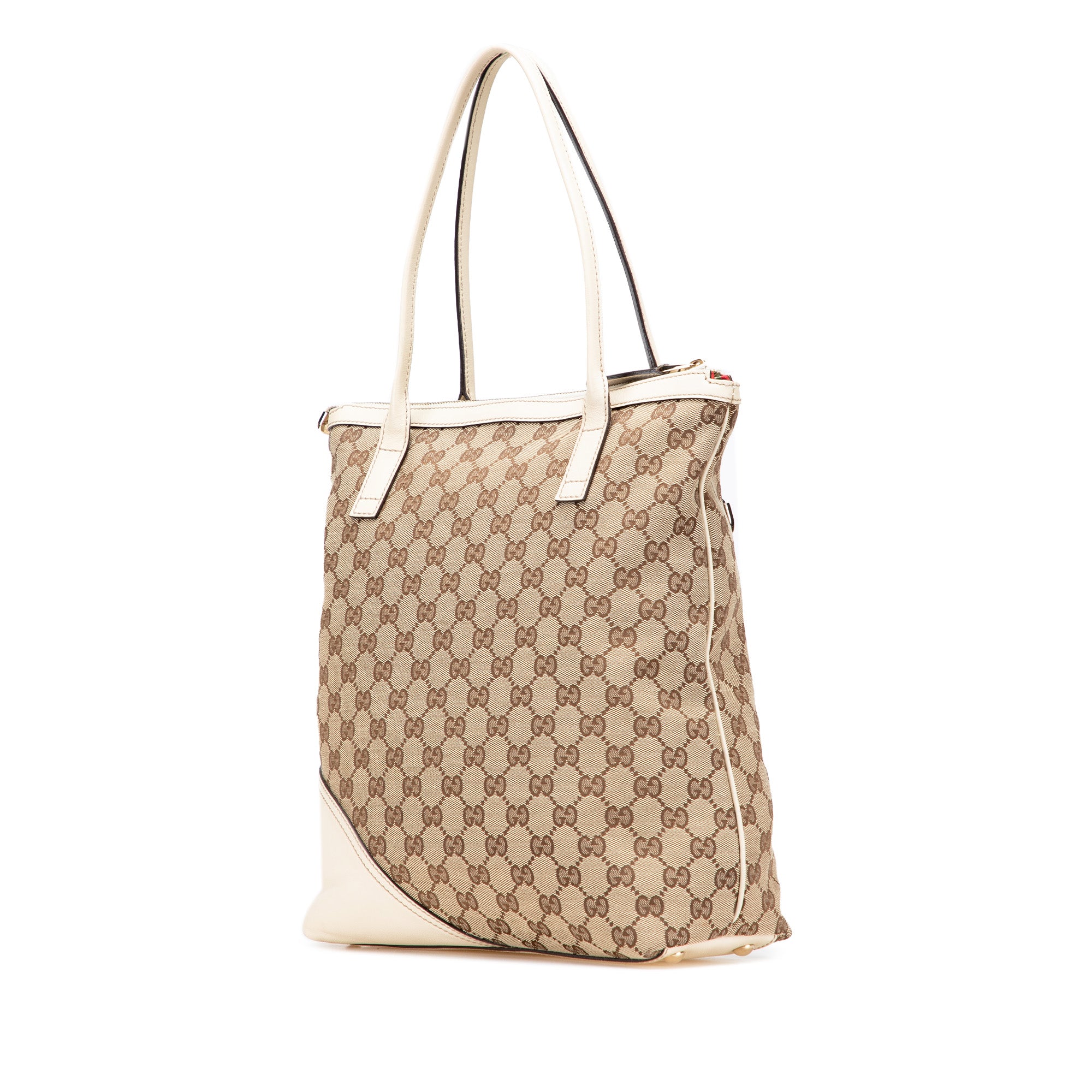 This tote bag features a canvas body with leather trim, flat leather handles, a top zip closure, and interior zip and slip pockets. Retail Price: 800.00