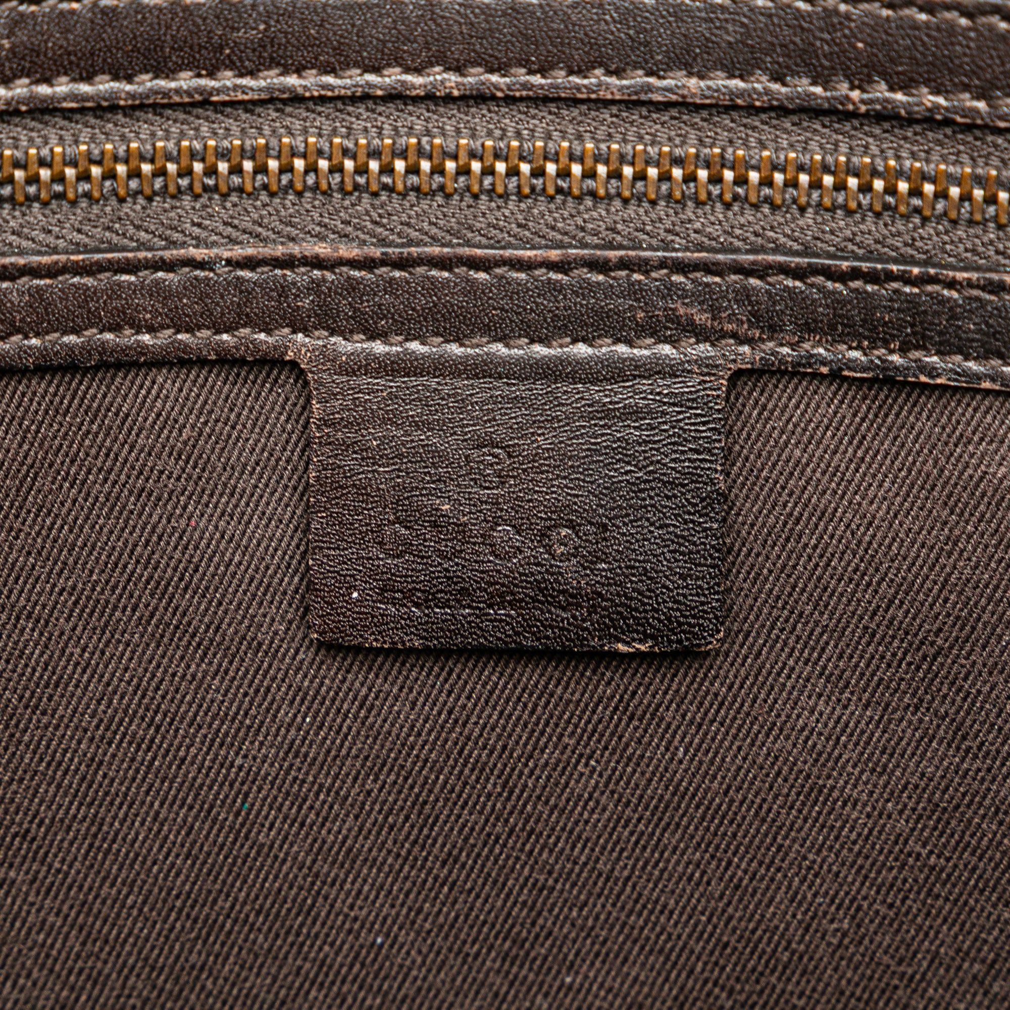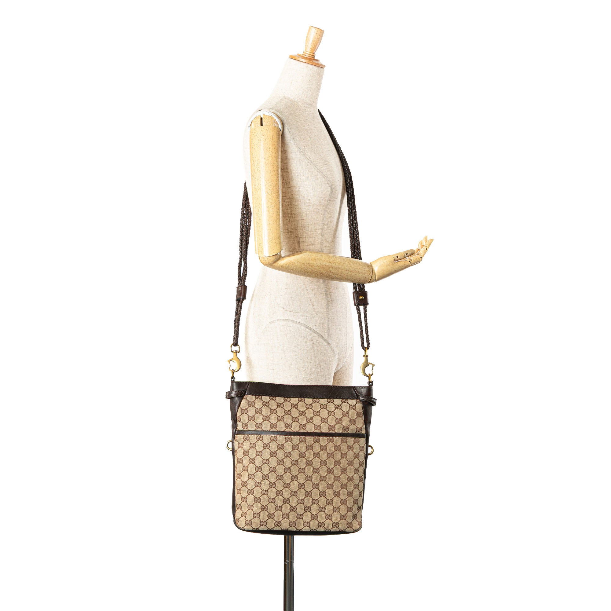 This crossbody bag features a canvas body with leather trim, a detachable braided leather strap, an open top with magnetic snap closure, an exterior front slip pocket, and an interior zip pocket. Inclusion: Dust bag. Retail Price: 990.00