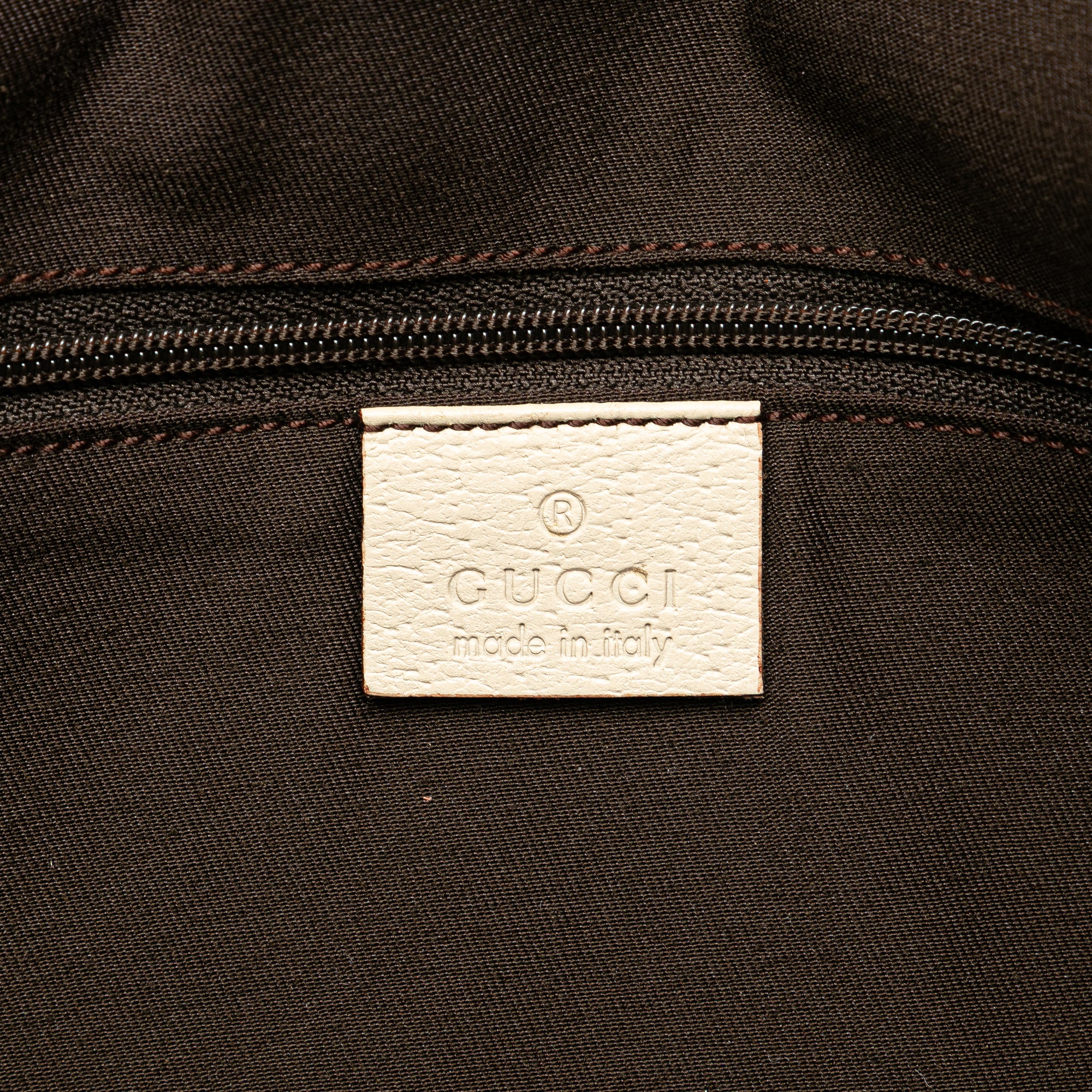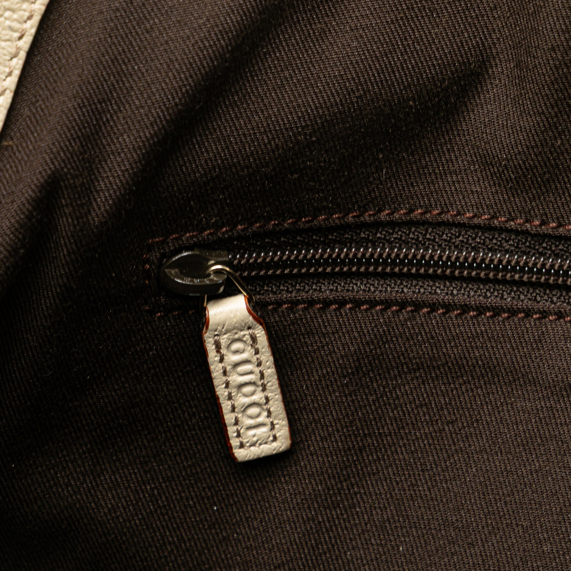 This shoulder bag features a canvas body with leather trim, flat leather straps, an open top with a magnetic closure, an exterior front slip pocket, and interior zip and slip pockets. Retail Price: 750.00