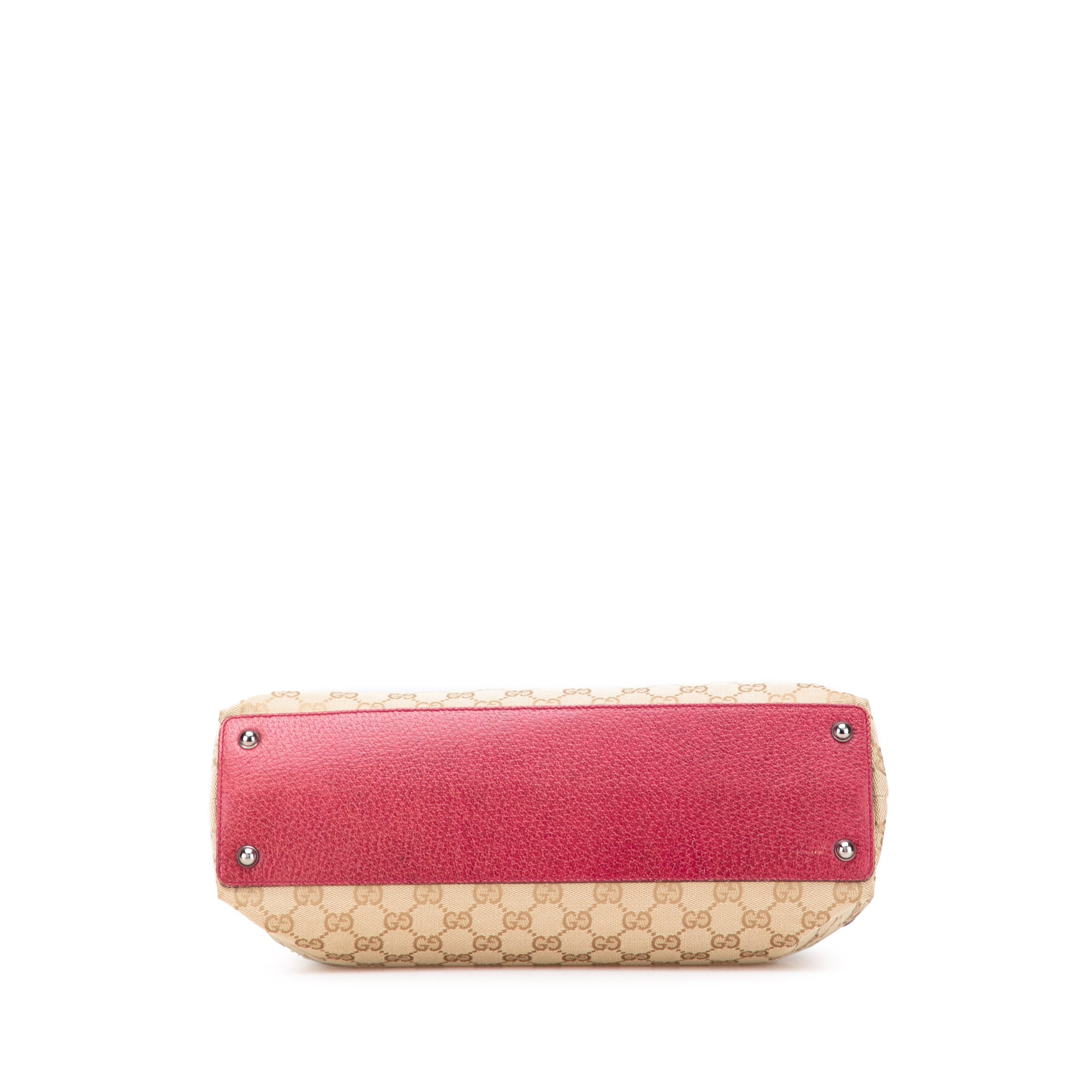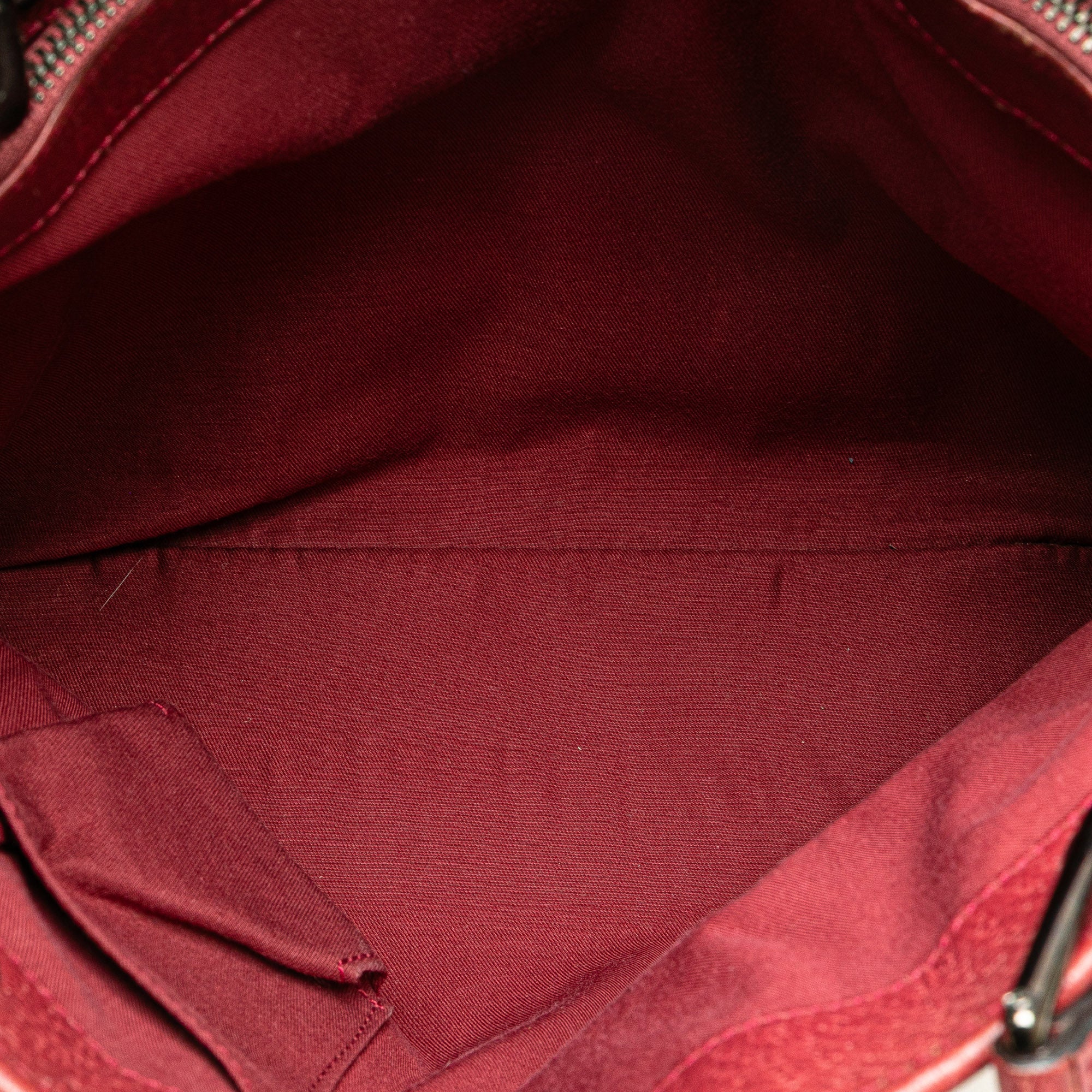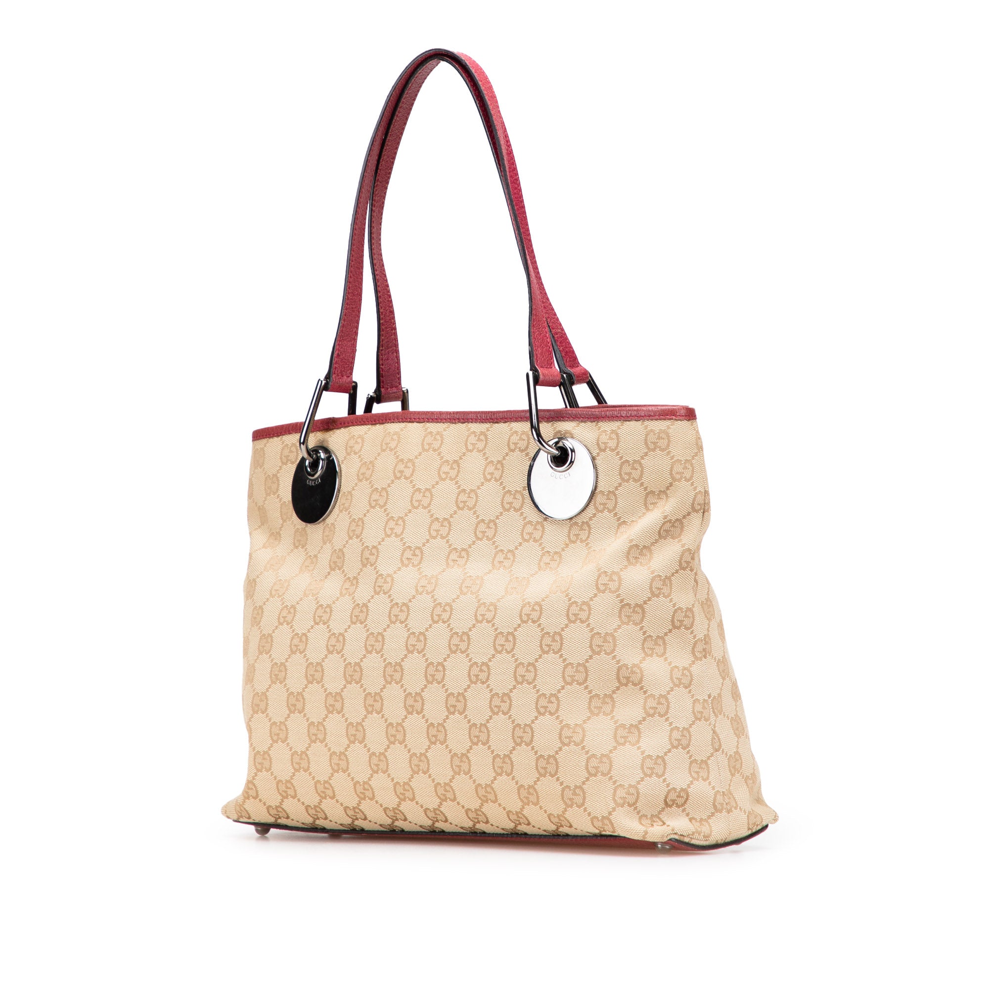The Eclipse features a canvas body with leather trim, flat leather shoulder straps, an open top, an interior center zip compartment, and interior zip and slip pockets. Retail Price: 500.00