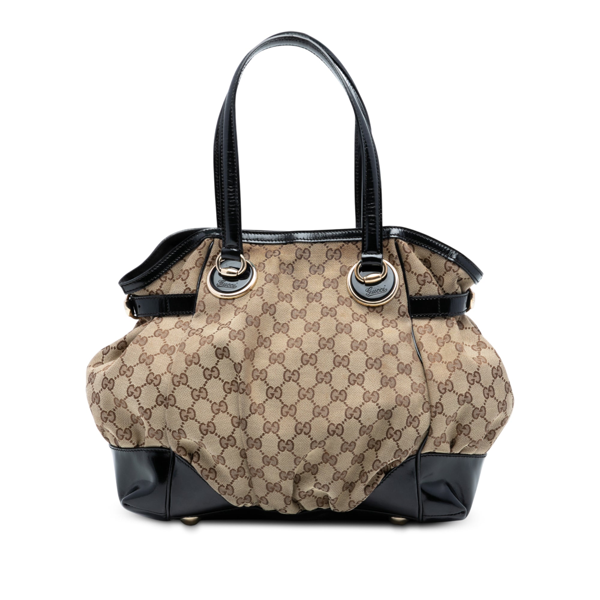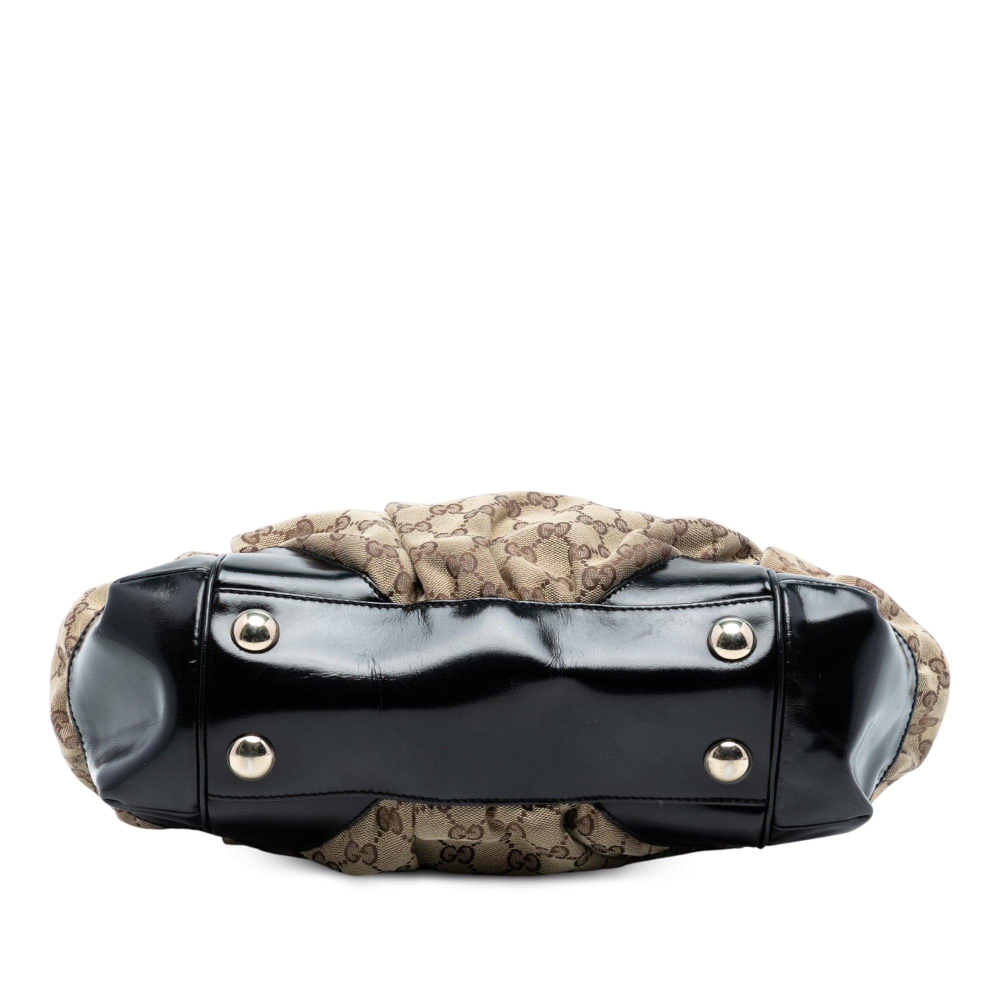 The Full Moon tote bag features a canvas body with patent leather trim, flat leather straps, an open top with a magnetic snap button closure, and interior zip and slip pockets. Retail Price: 810.00