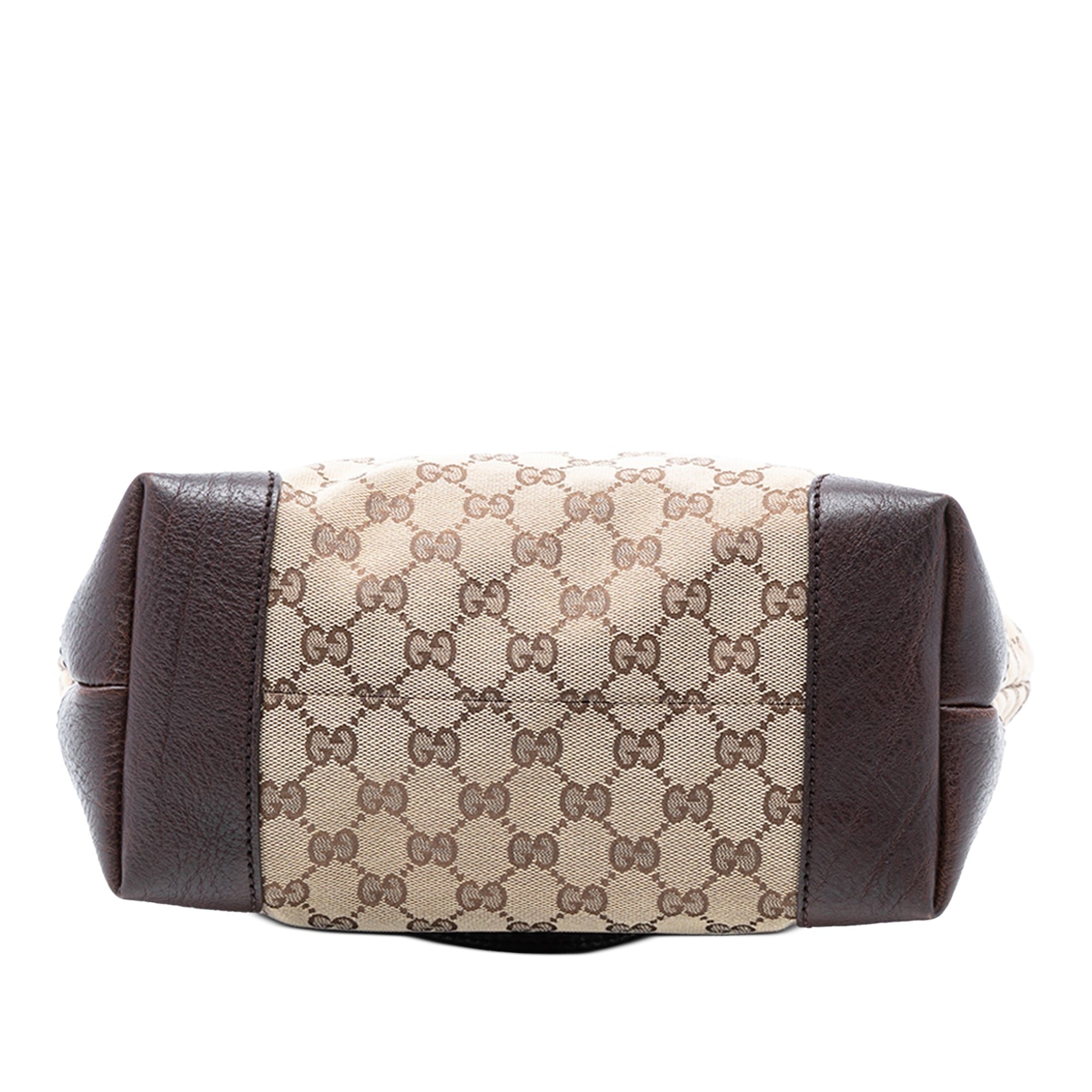 This tote bag features a canvas body with leather trim and a GG charm, flat leather handles, an open top with a magnetic snap closure, and interior zip and slip pockets. Retail Price: 1630.00