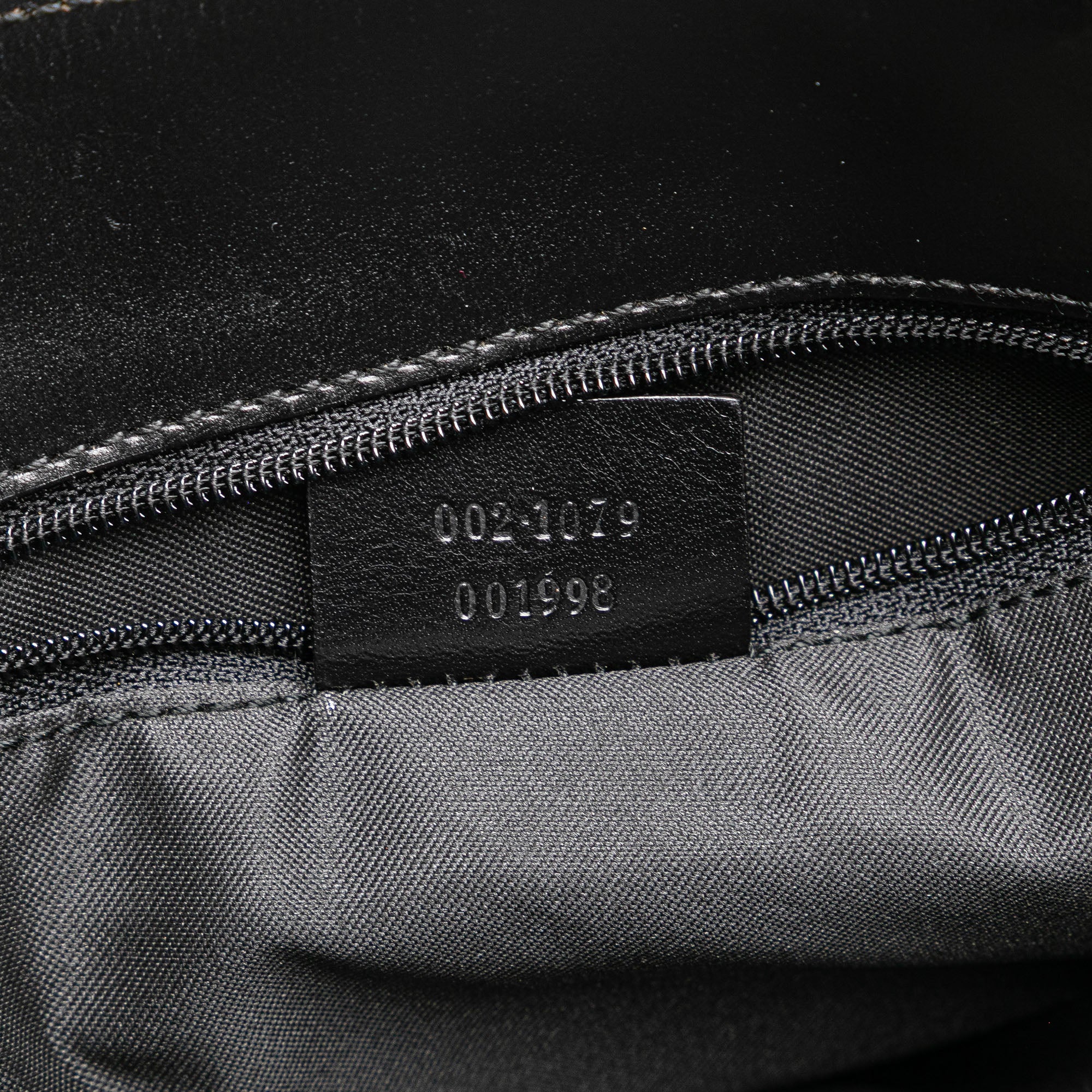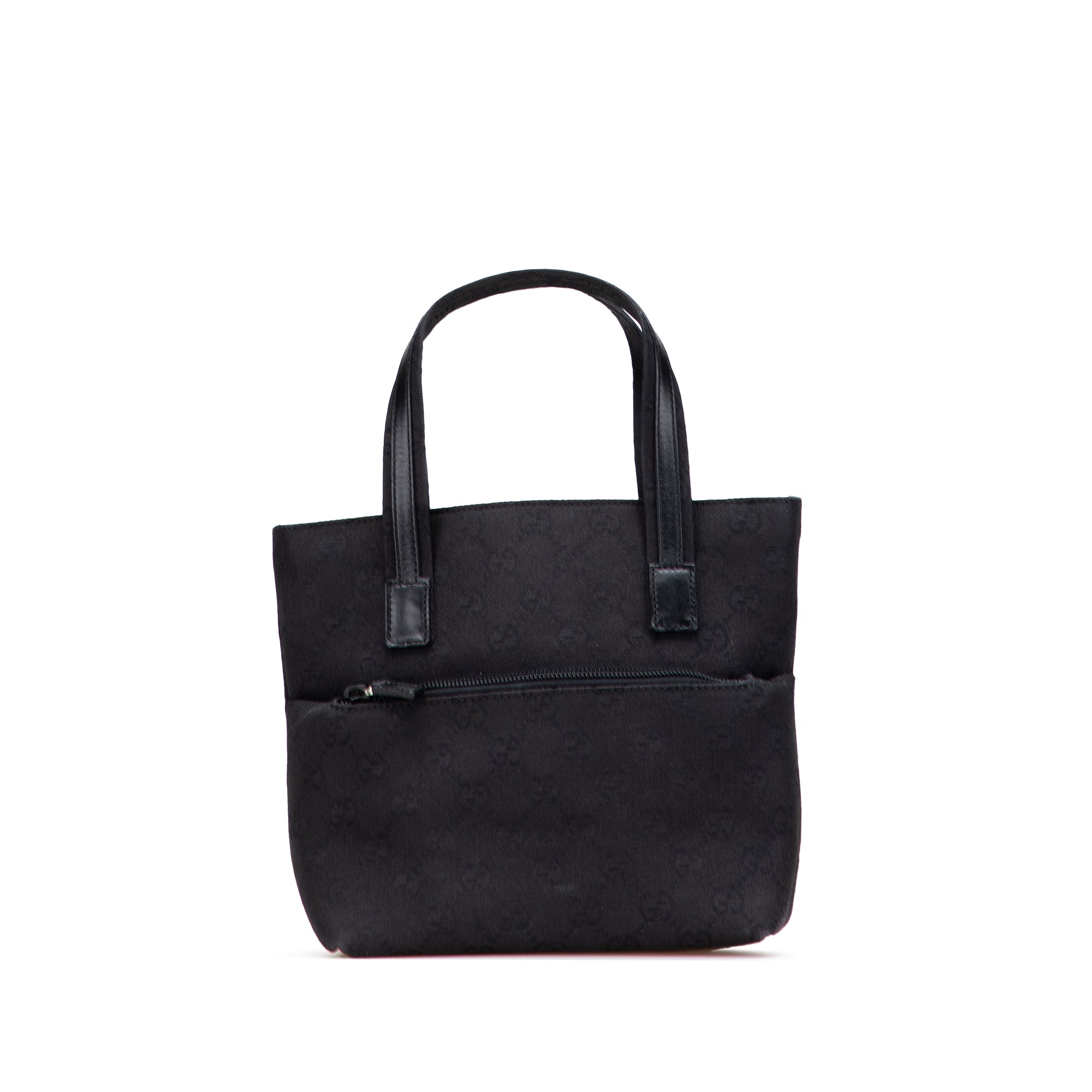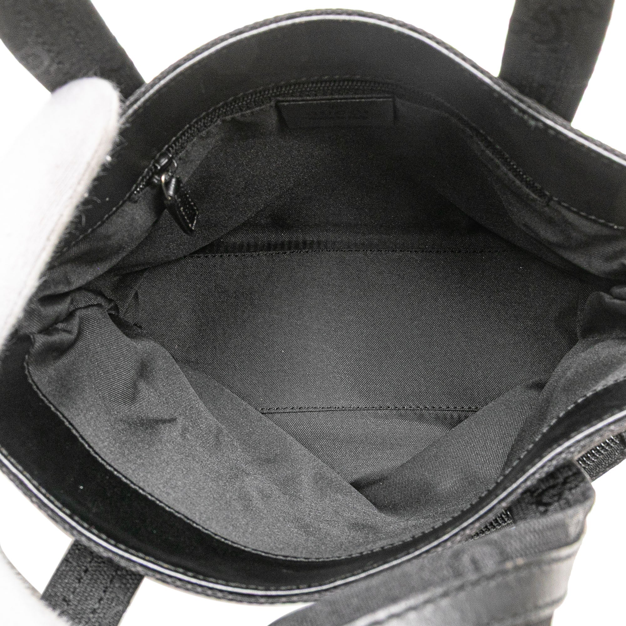 This handbag features a canvas body, flat leather handles, an open top, an exterior front zip pocket, and an interior zip pocket. Retail Price: 895.00