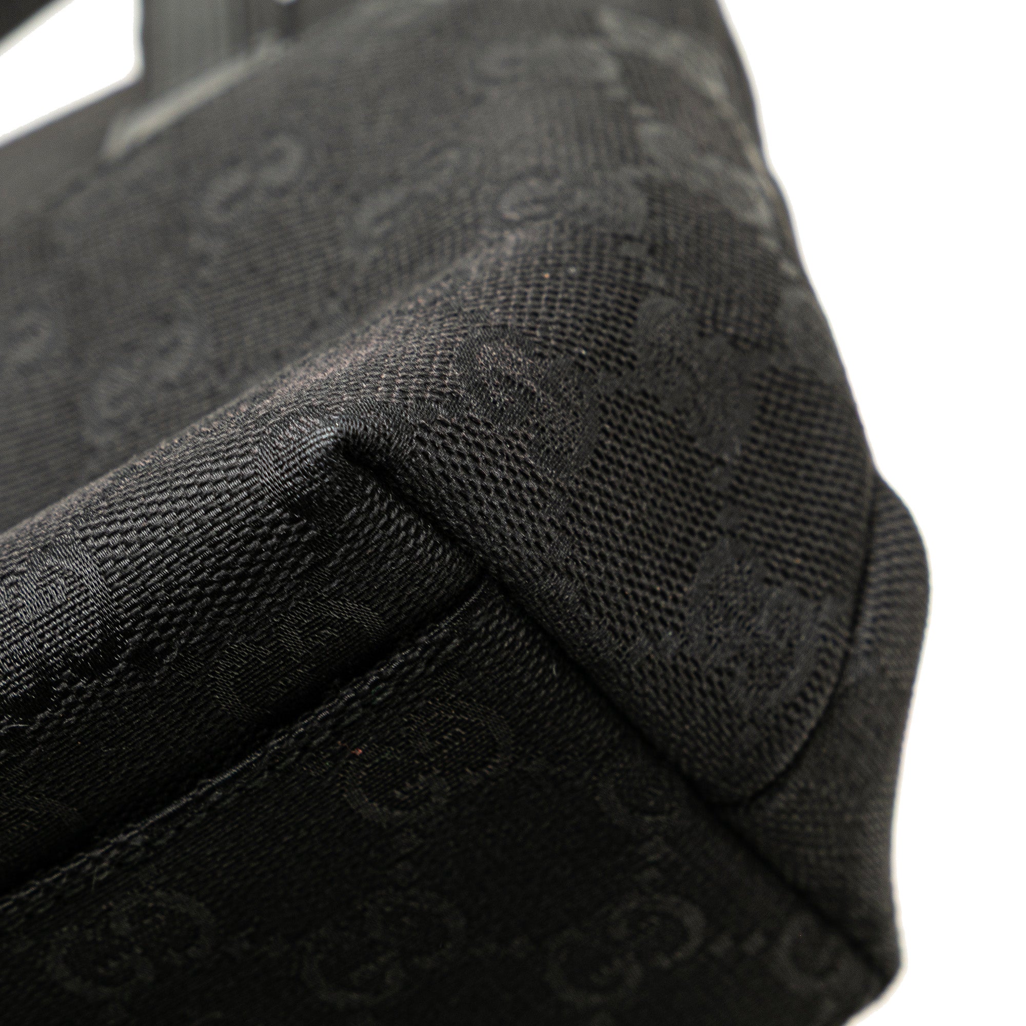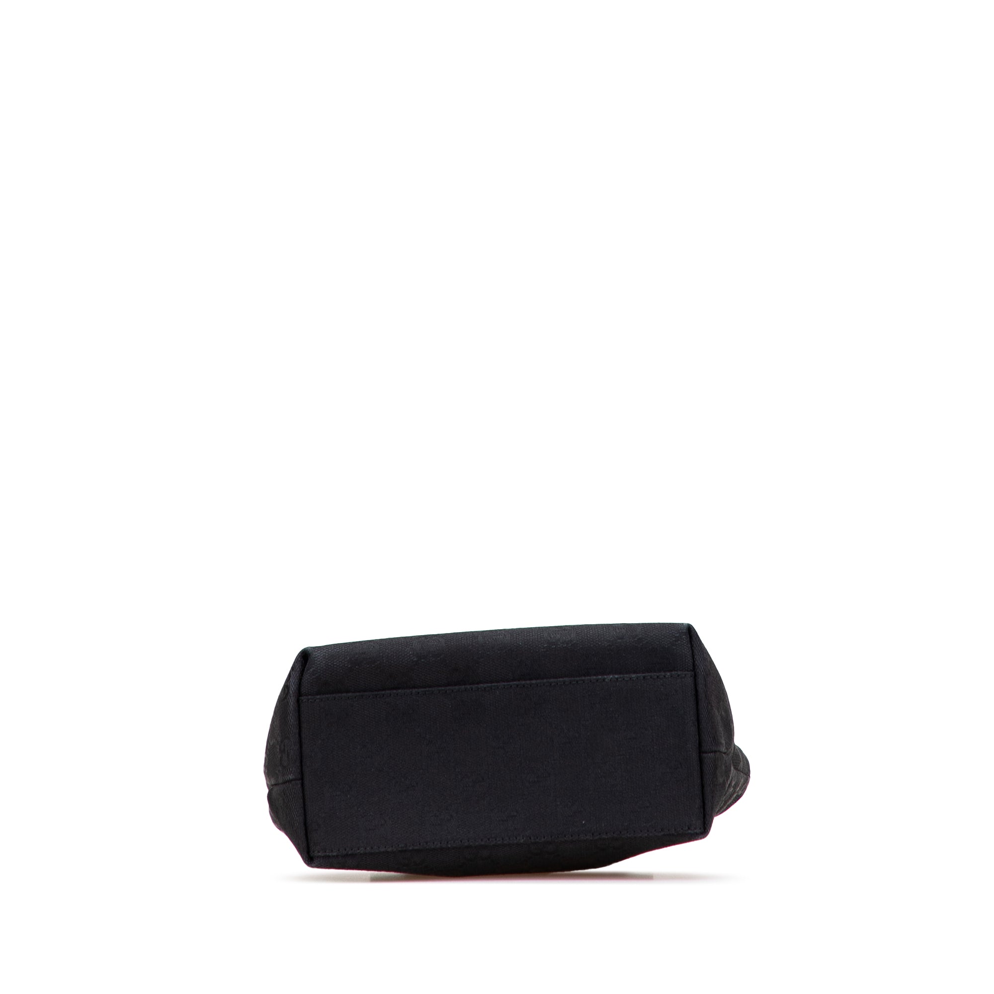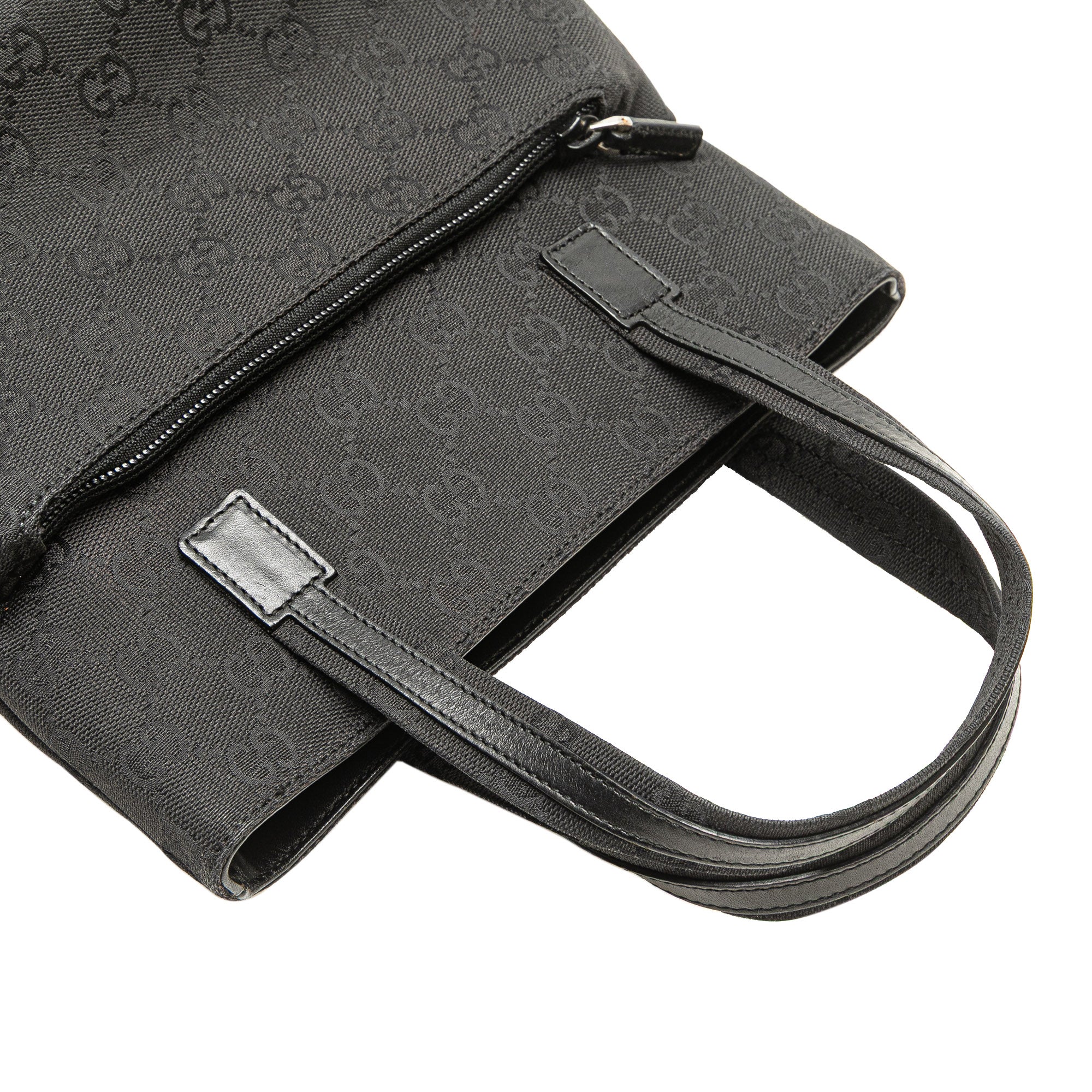 This handbag features a canvas body, flat leather handles, an open top, an exterior front zip pocket, and an interior zip pocket. Retail Price: 895.00