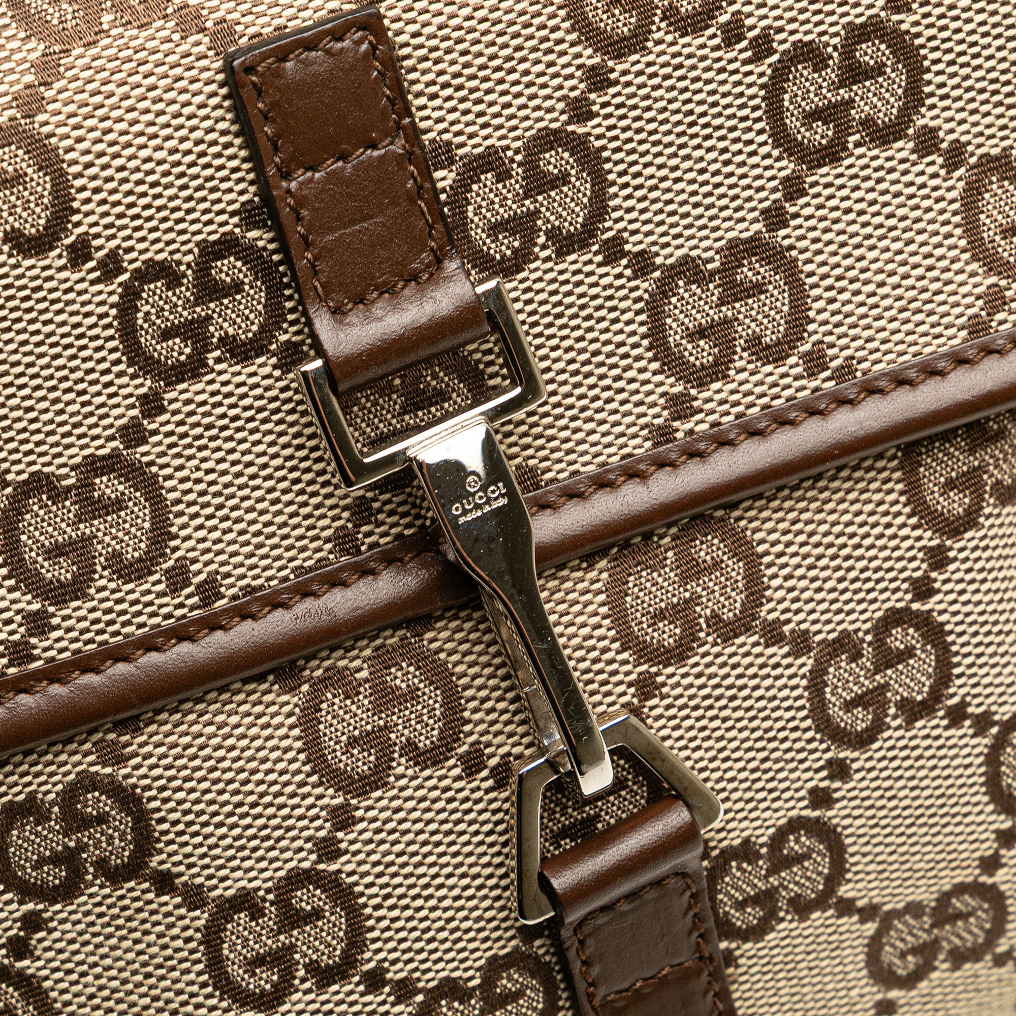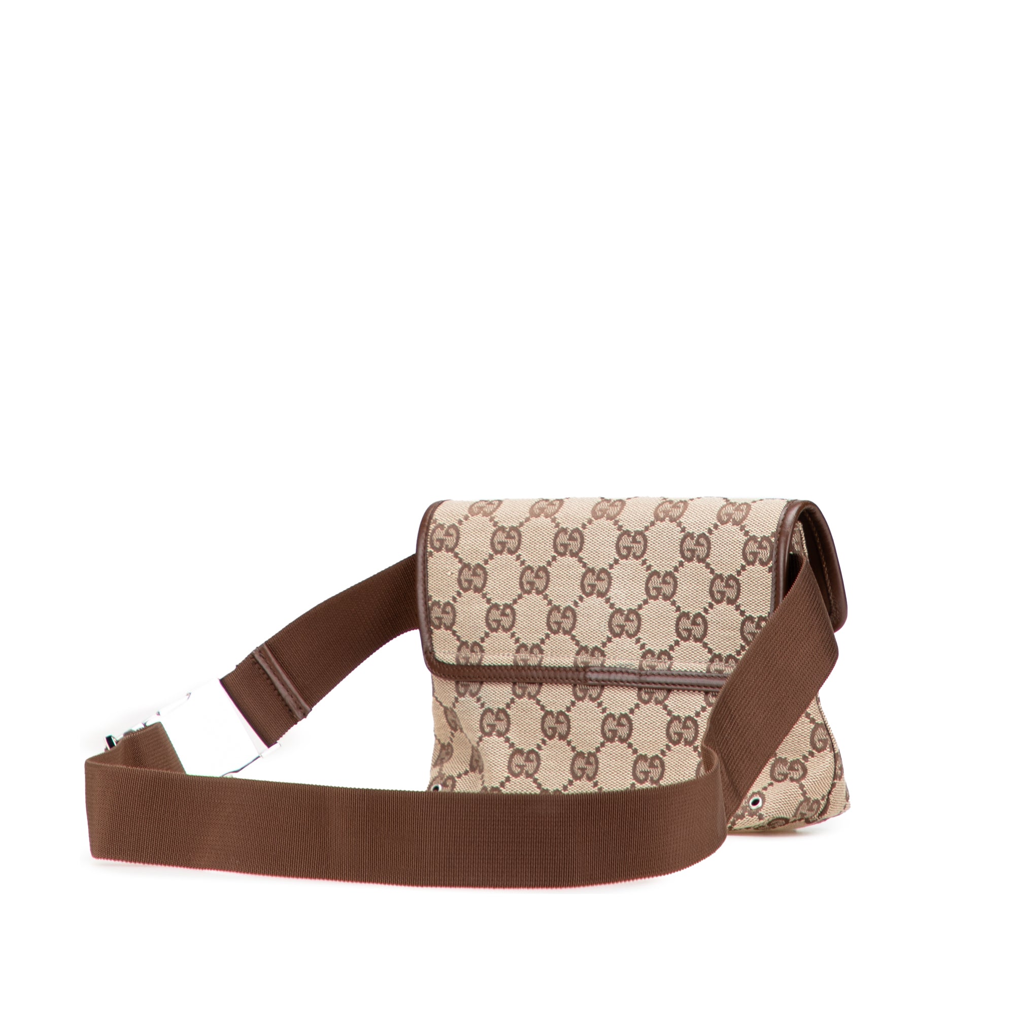 This belt bag features a canvas body with leather trim, an adjustable flat waist strap, a front flap with a lobster clasp closure, and an interior zip pocket. Retail Price: 590.00