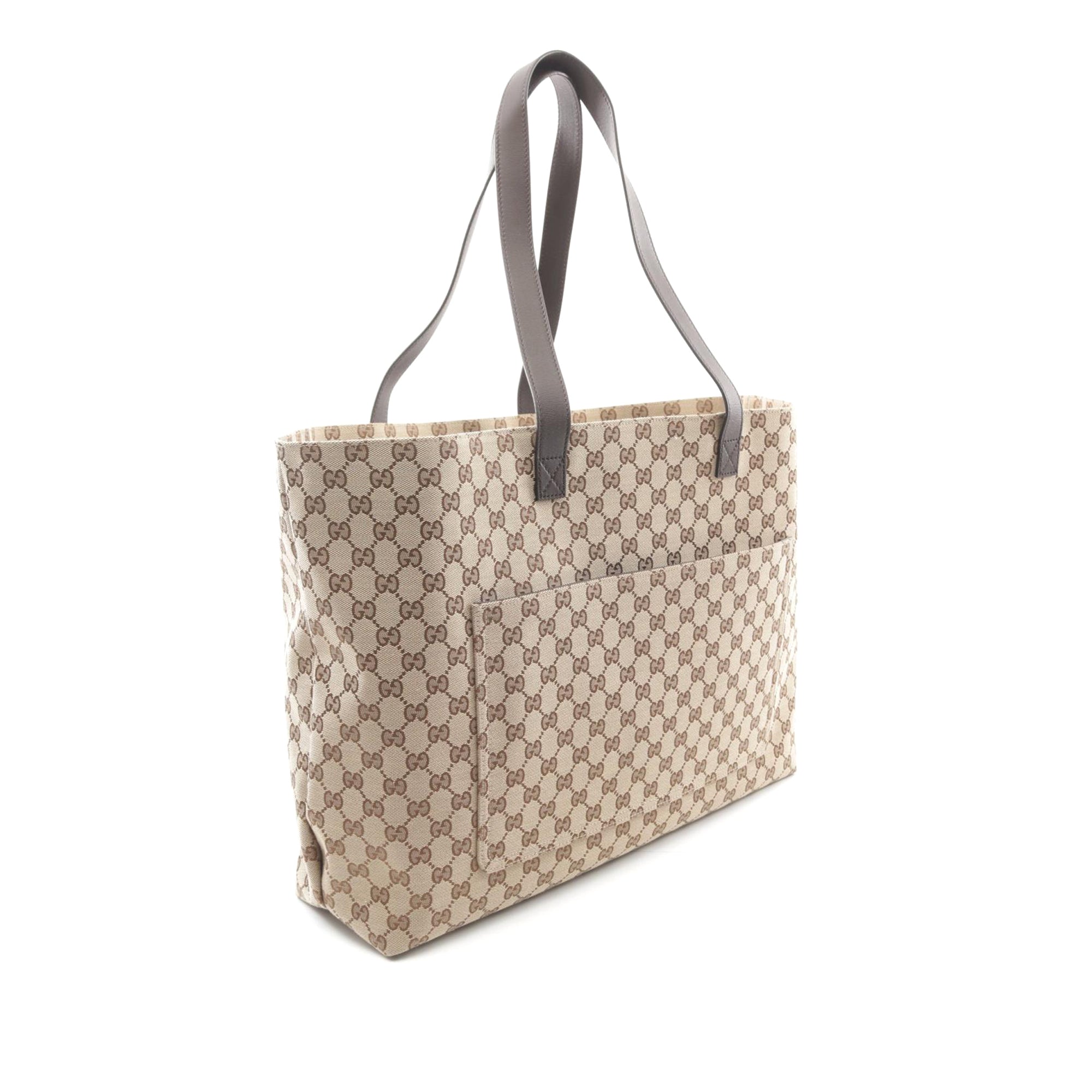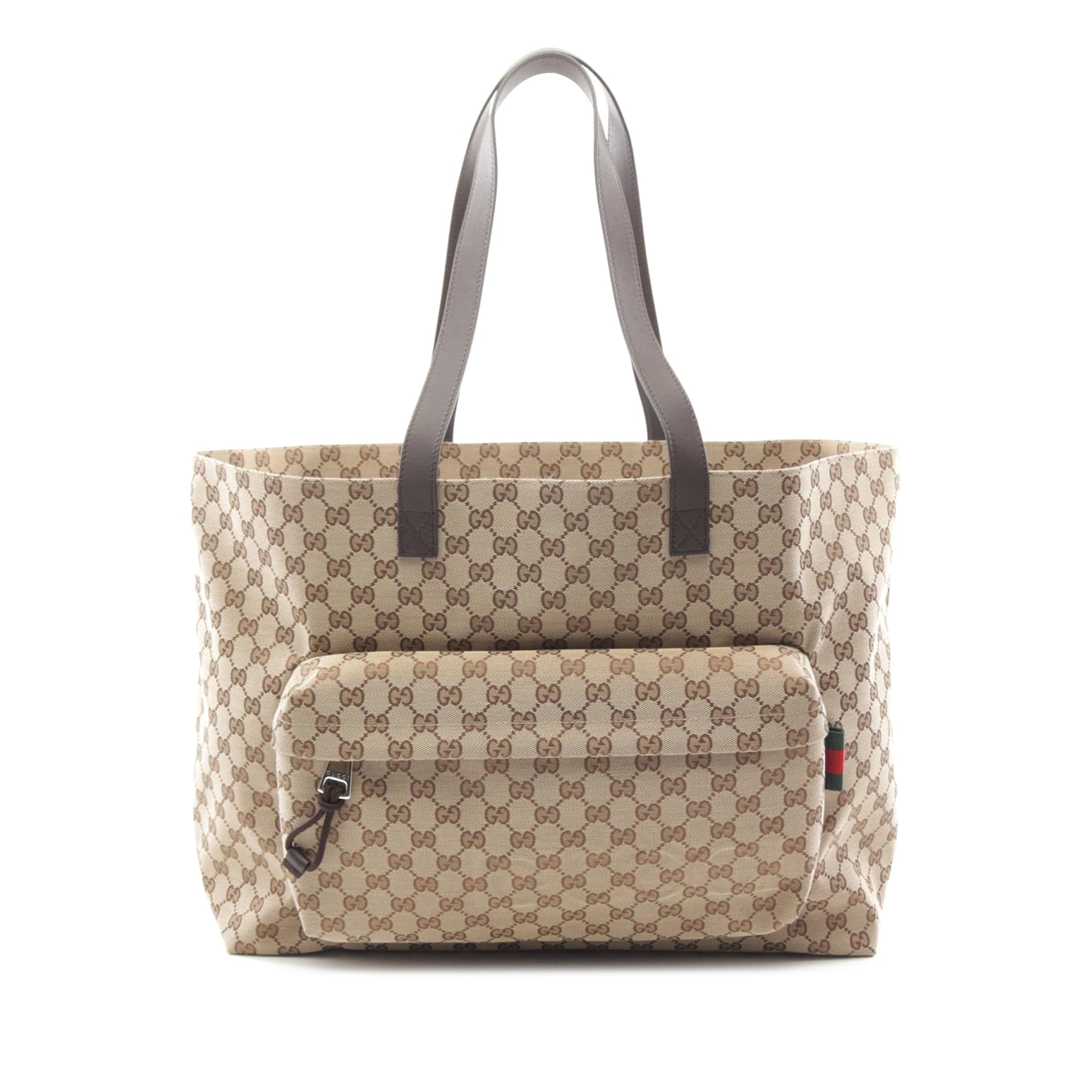 This tote bag features a canvas body, flat leather straps, an open top, exterior front zip and back slip pockets, and an interior zip pocket. Inclusion: Dust bag. Retail Price: 2250.00
