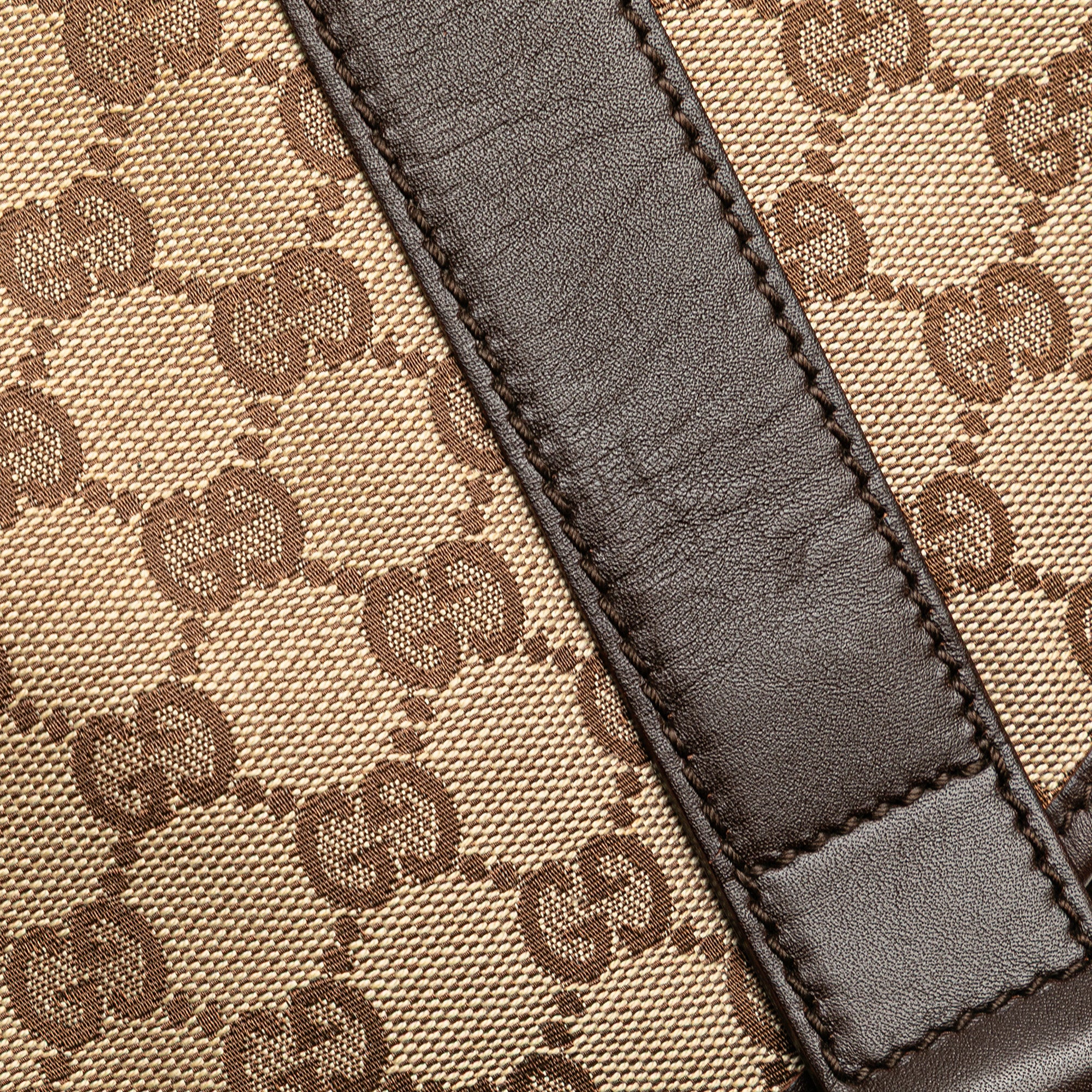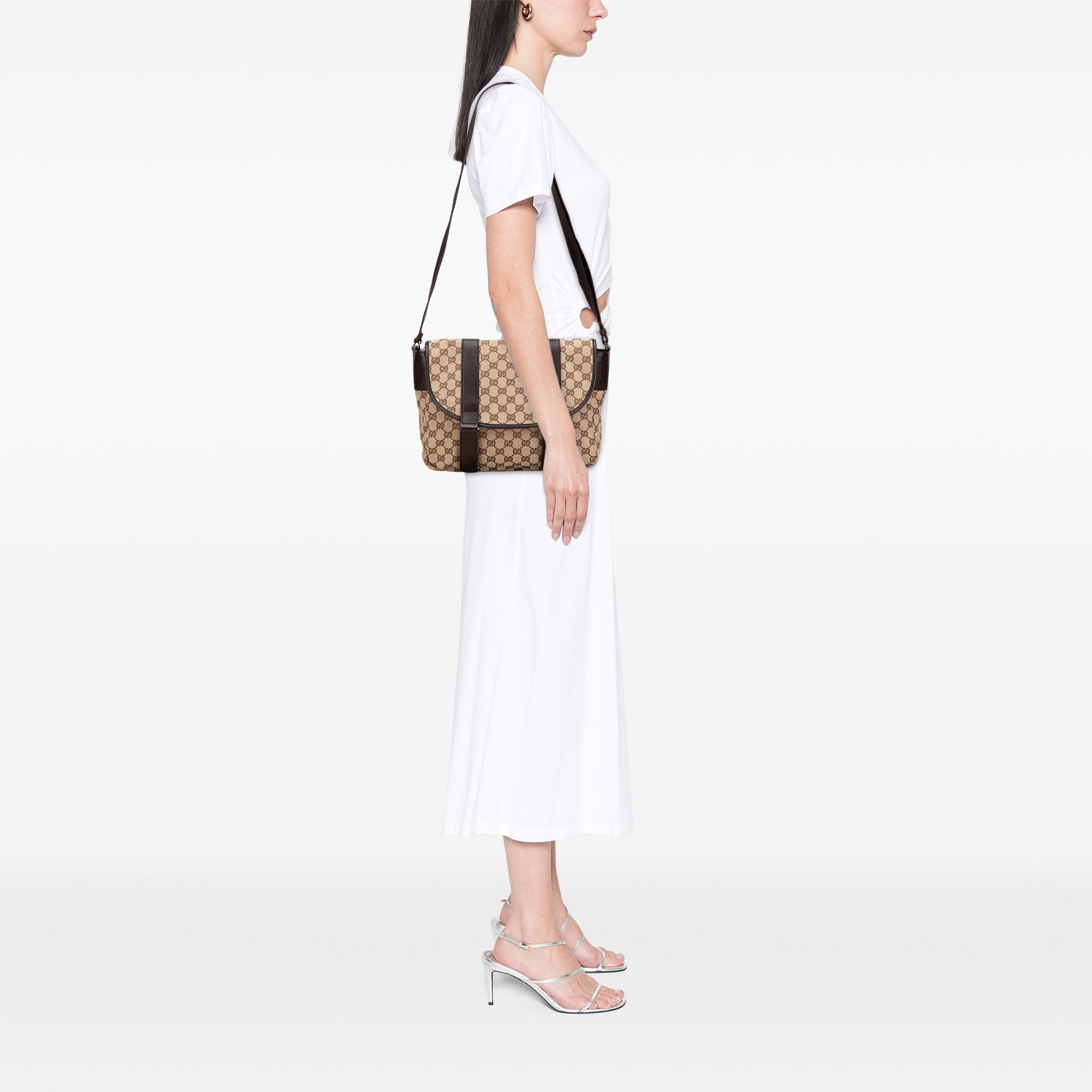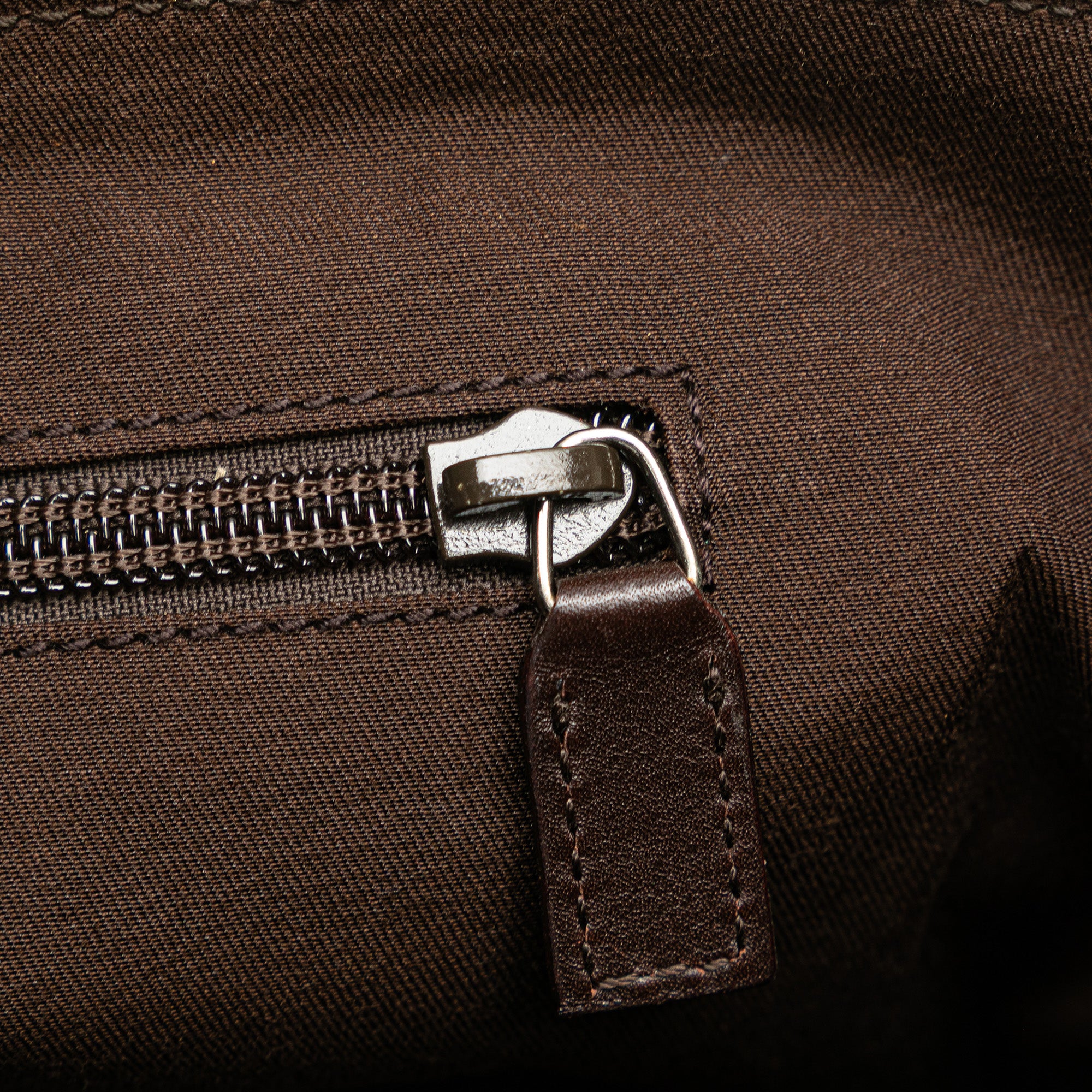 This crossbody bag features a canvas body with leather trim, an adjustable flat strap, a front flap with touch fastener closures, exterior slip pockets, and interior zip and slip pockets. Retail Price: 900.00