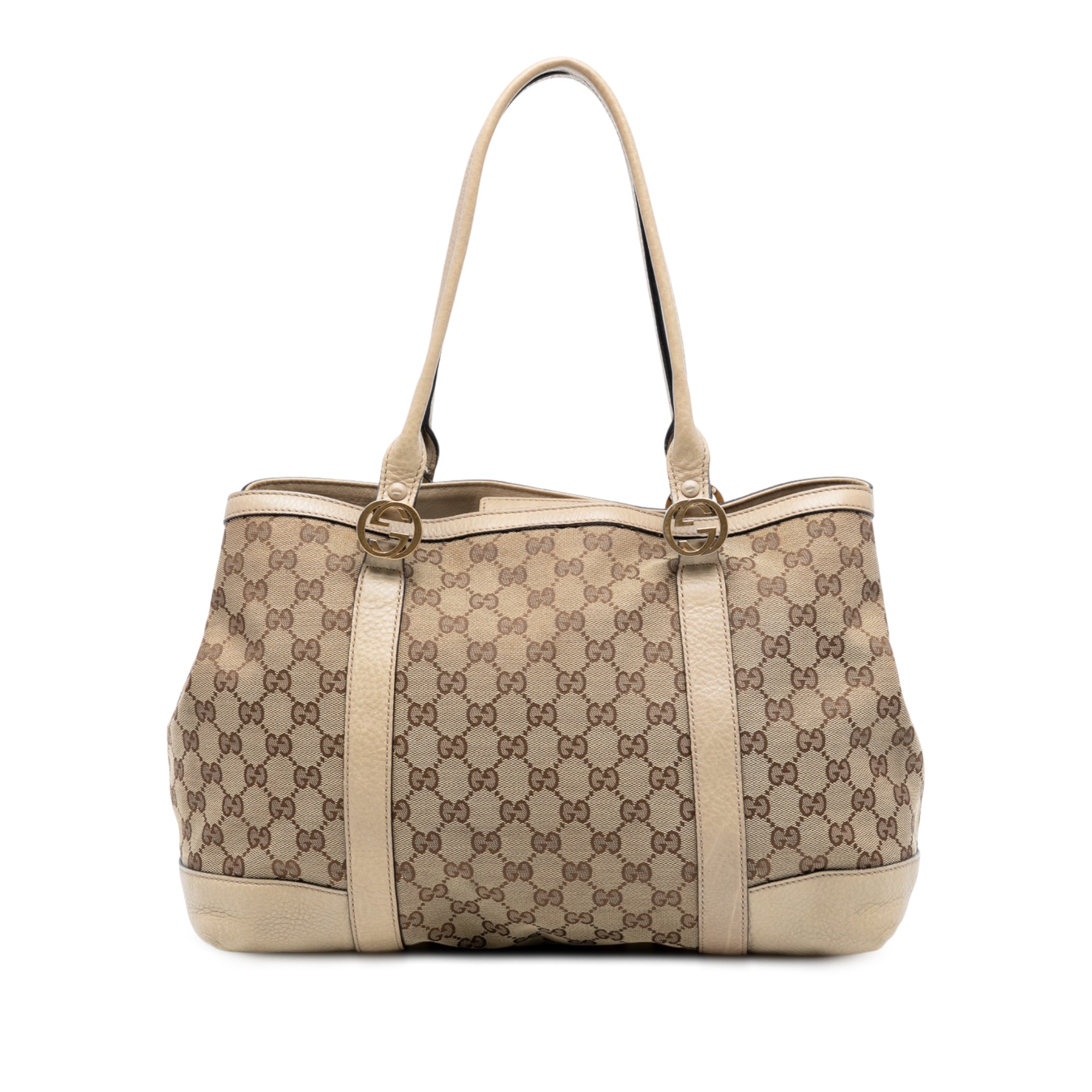 This tote bag features a canvas body with leather trim, rolled leather handles, an open top with magnetic snap closure, and interior zip and slip pockets. Inclusion: Dust bag. Retail Price: 1110.00