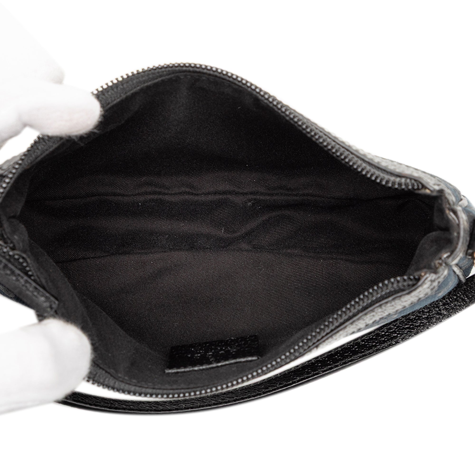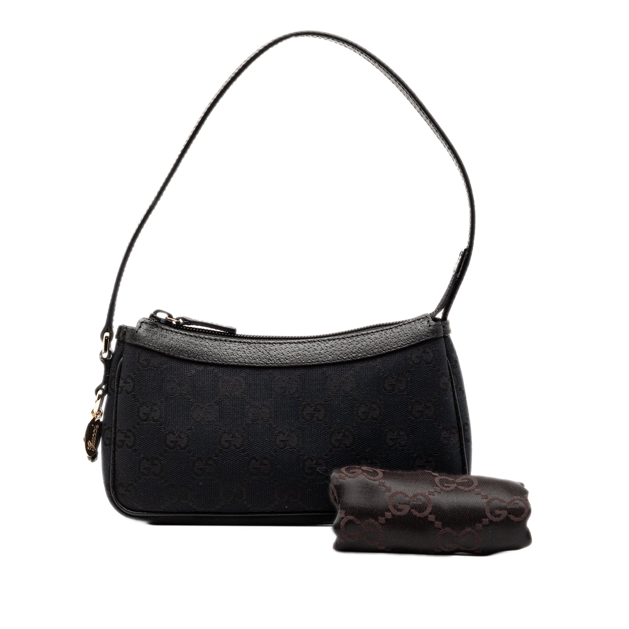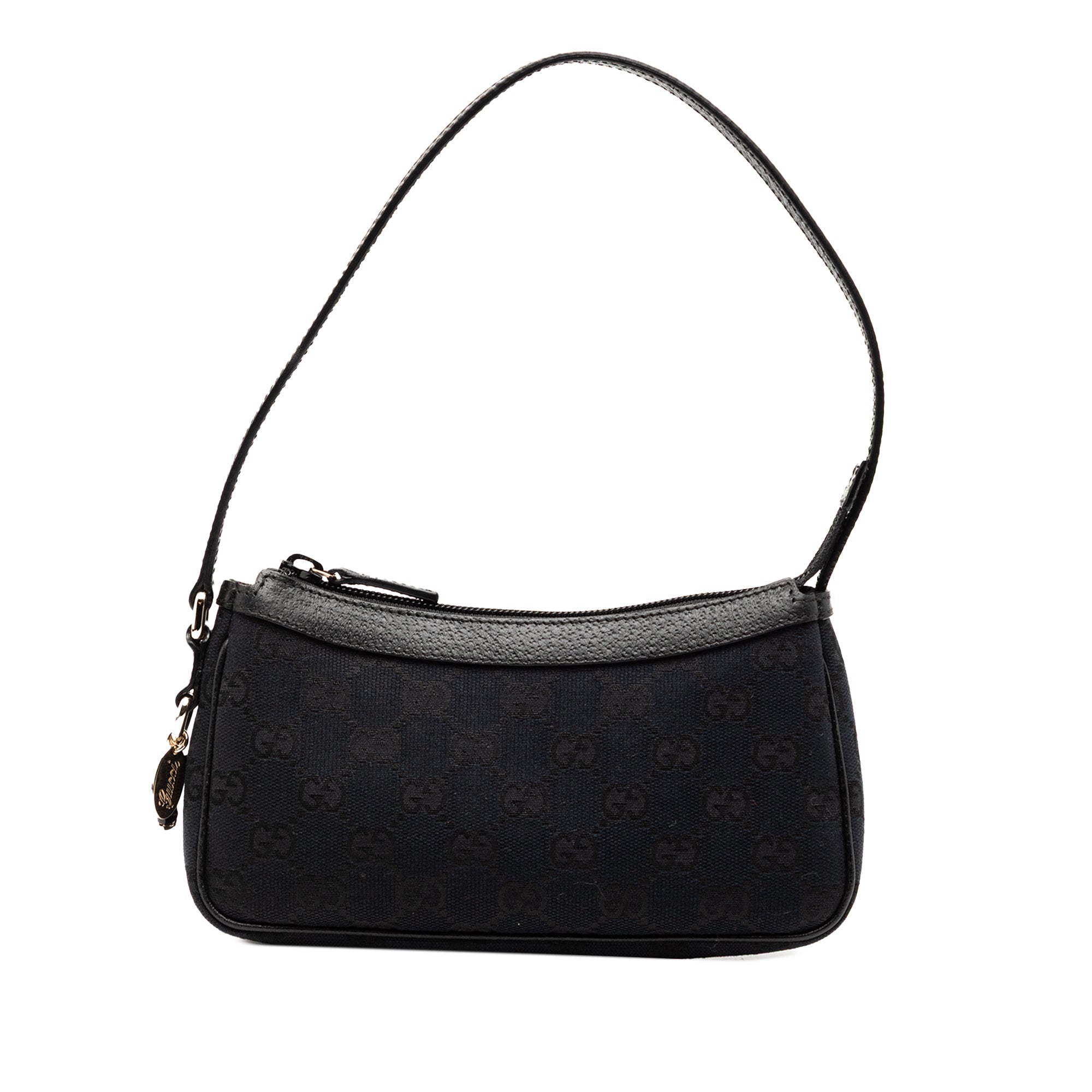 This baguette features a canvas body with leather trim, a flat leather strap, and a top zip closure. Inclusion: Dust bag. Retail Price: 795.00