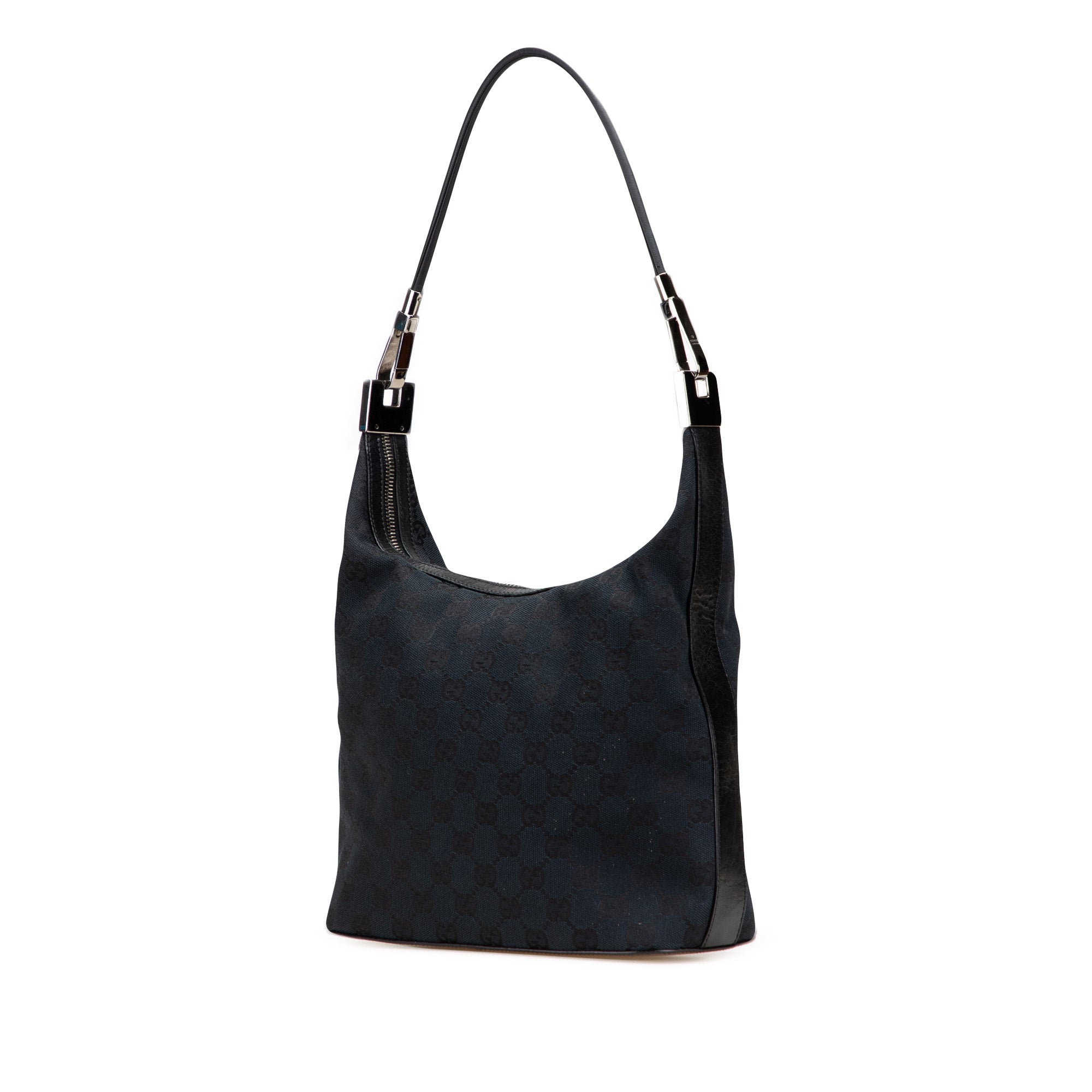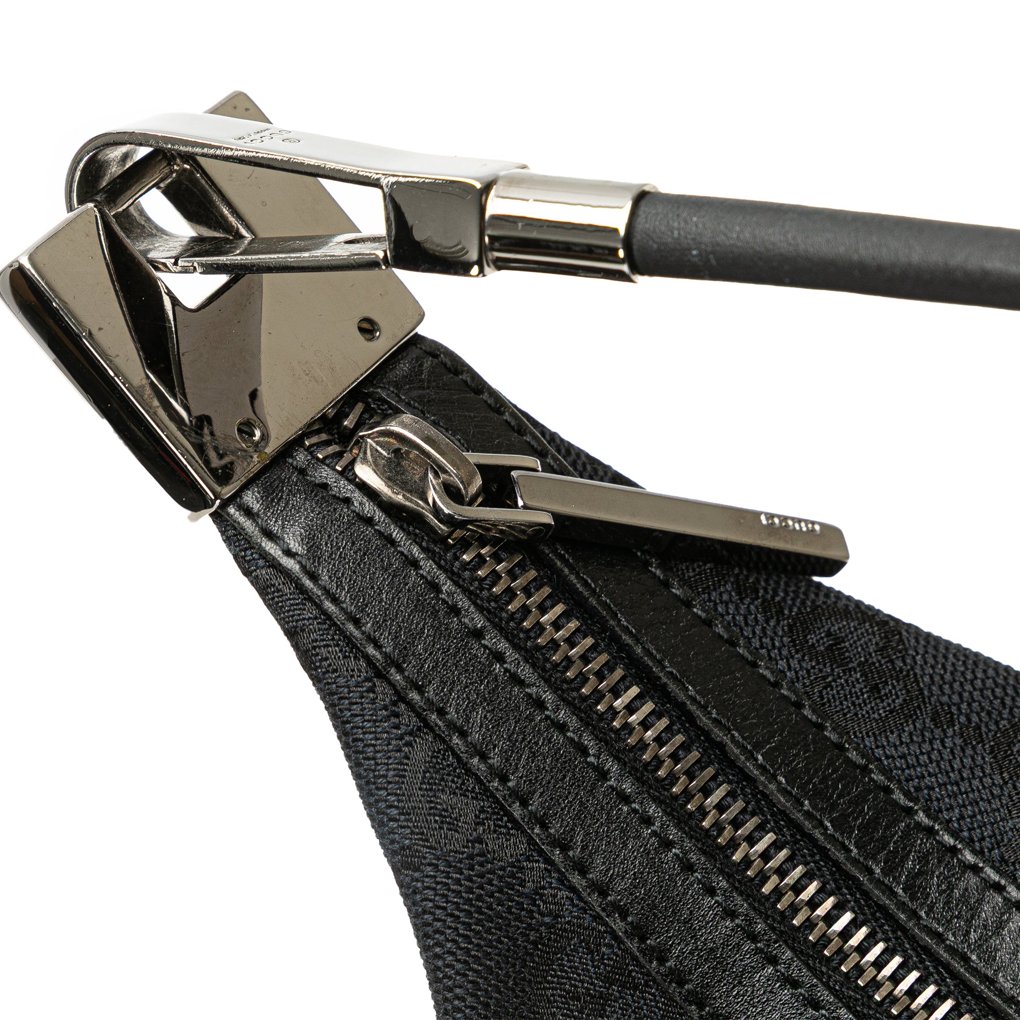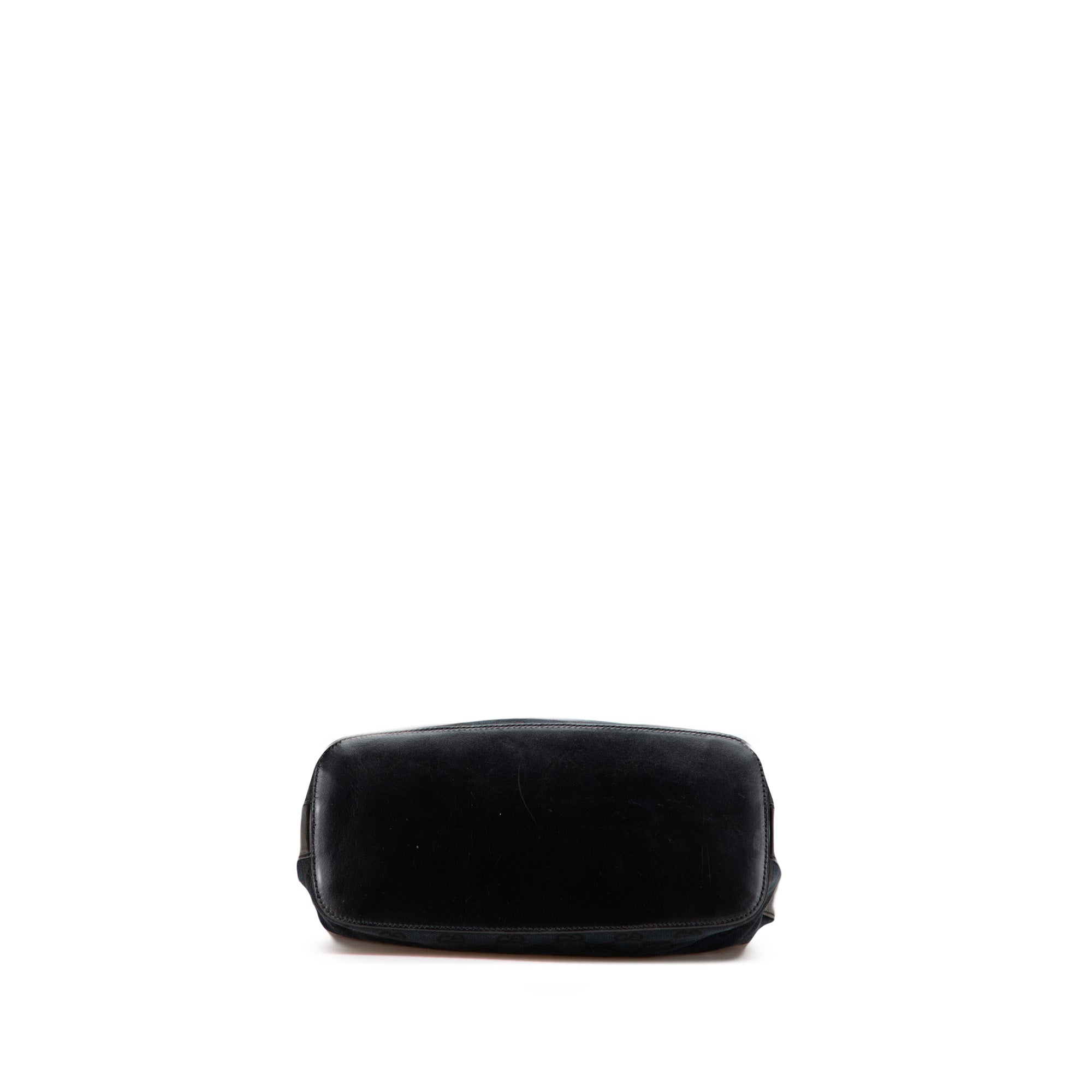 This shoulder bag features a canvas body with leather trim, a flat leather strap, a top zip closure, and an interior zip pocket. Retail Price: 1000.00
