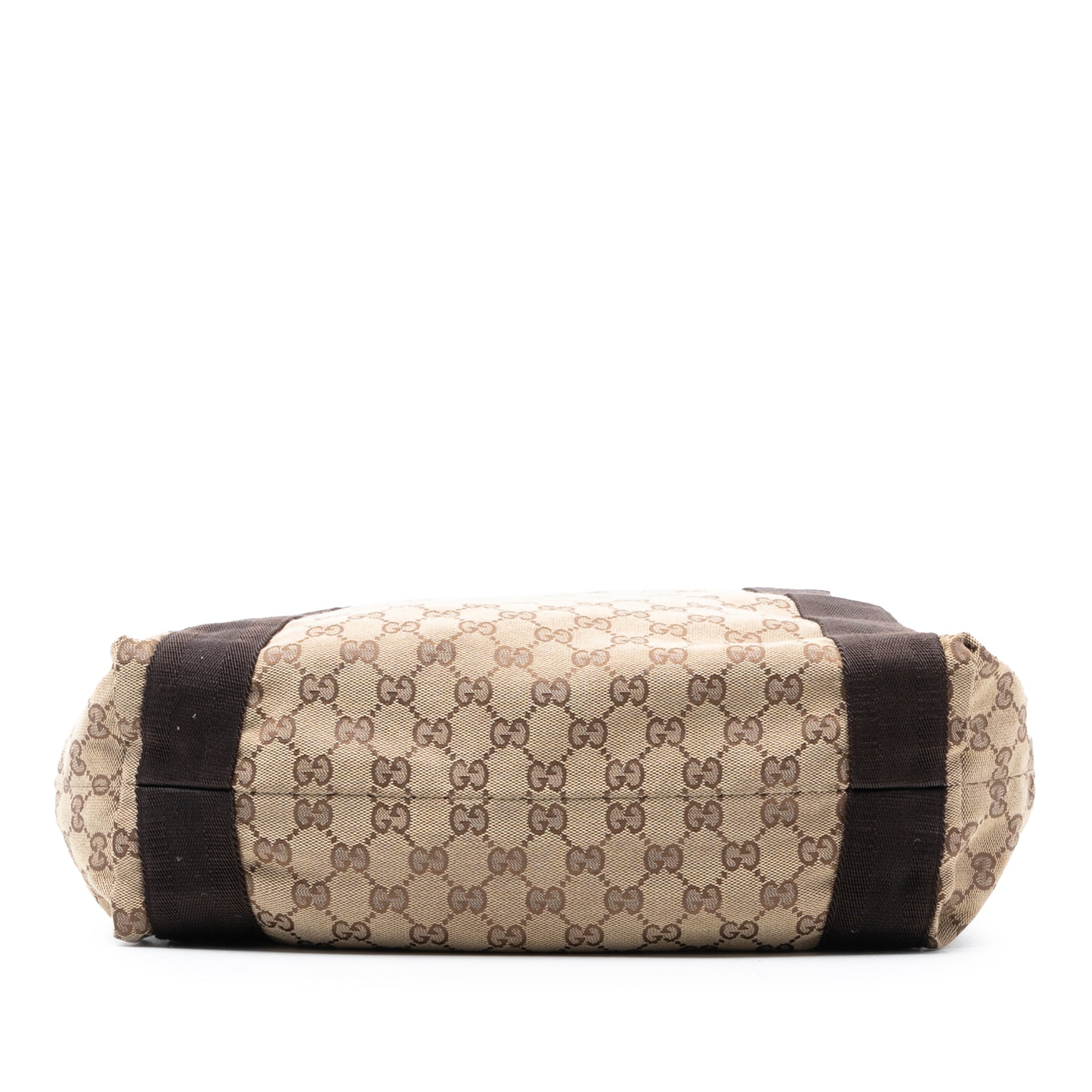This tote bag features a canvas body with leather trim, flat canvas straps, an open top, and interior slip pockets. Retail Price: 800.00