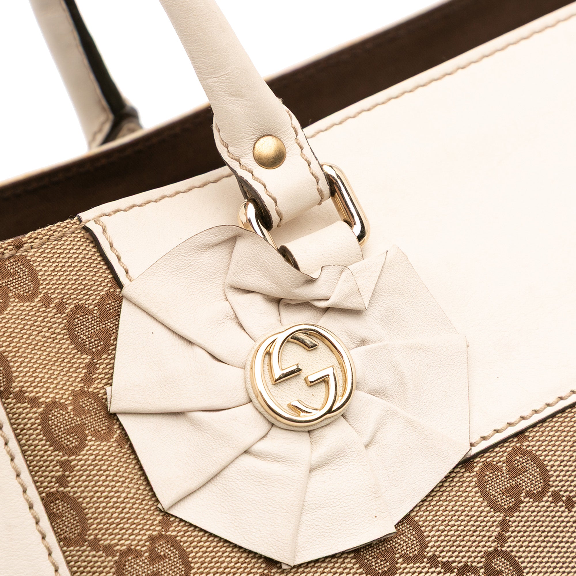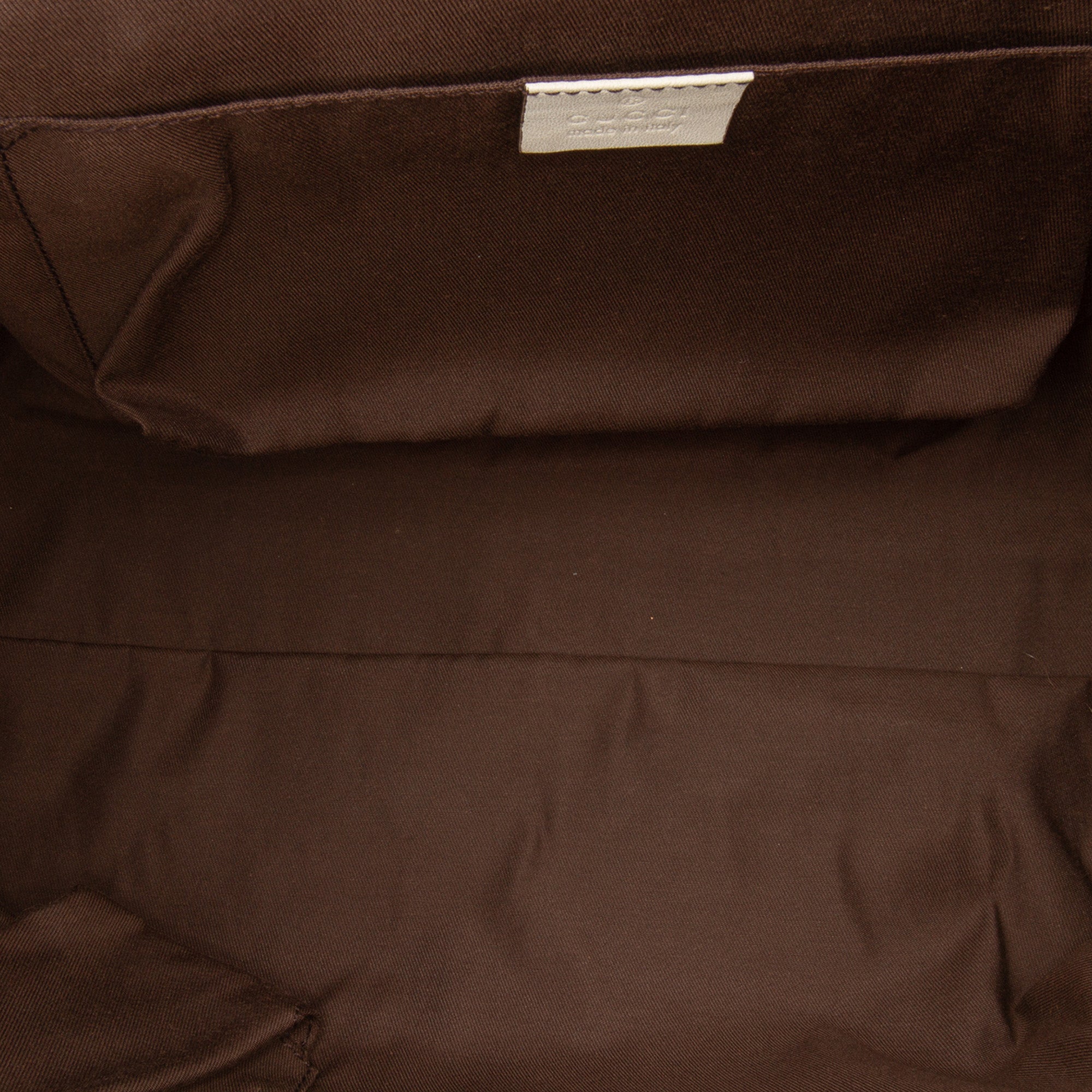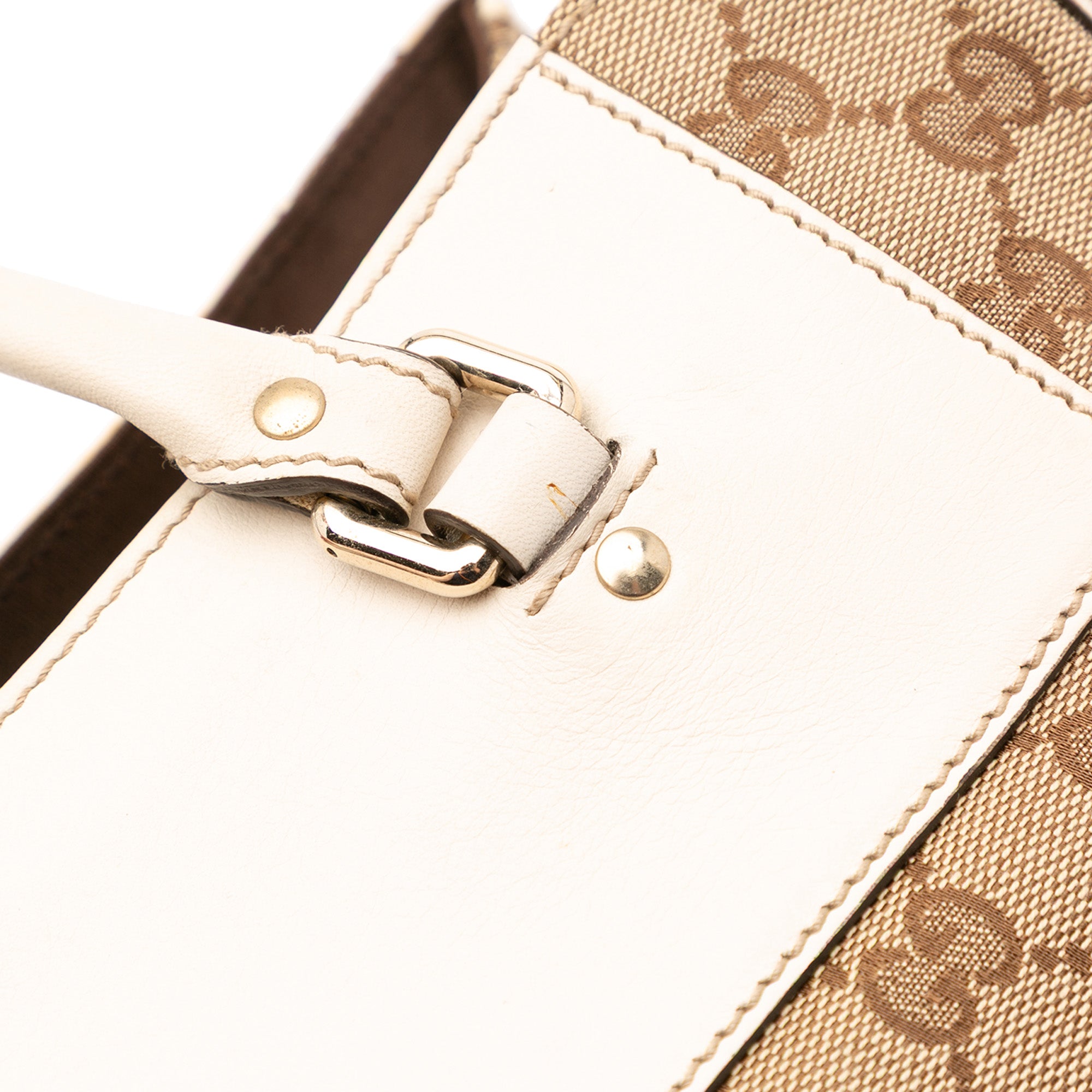 This tote bag features a canvas body with leather trim, rolled leather shoulder straps, an open top with a leather tab and magnetic snap button closure, and interior slip pockets. Retail Price: 865.00