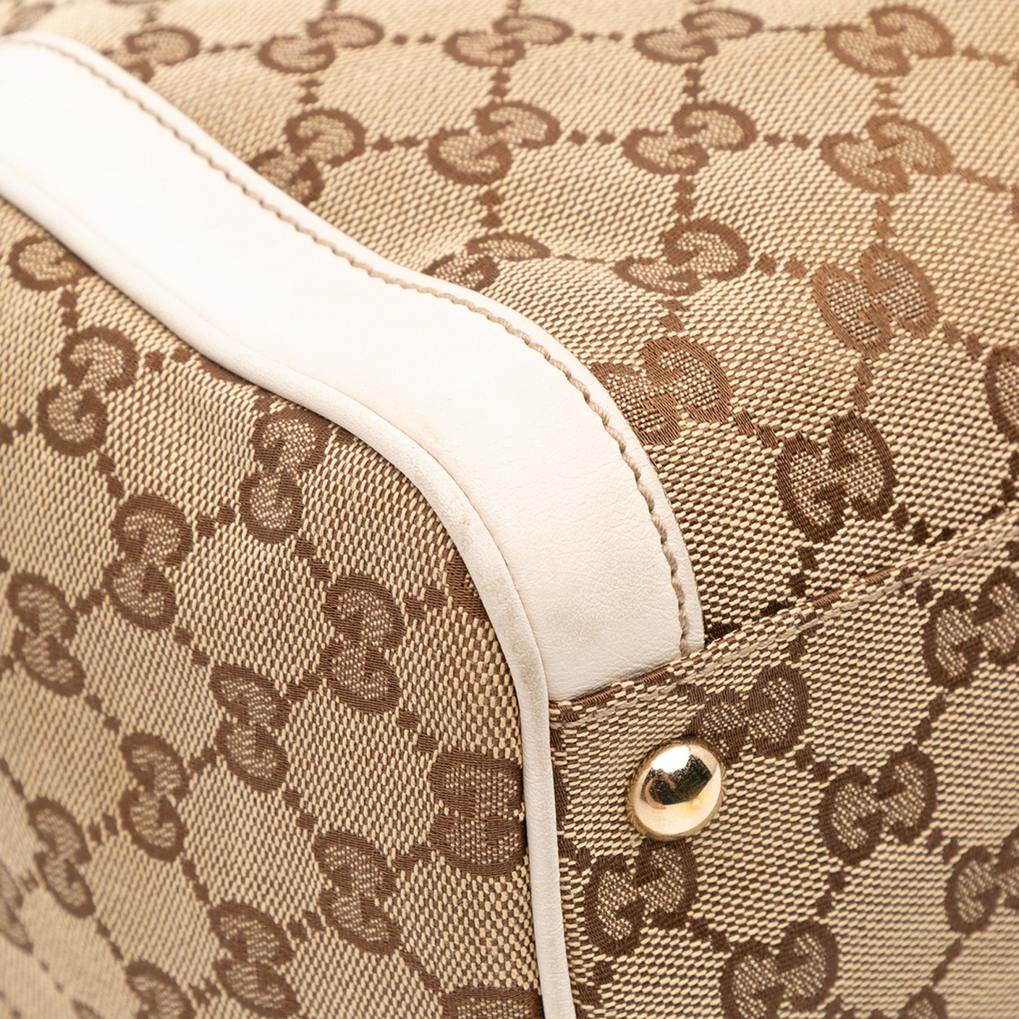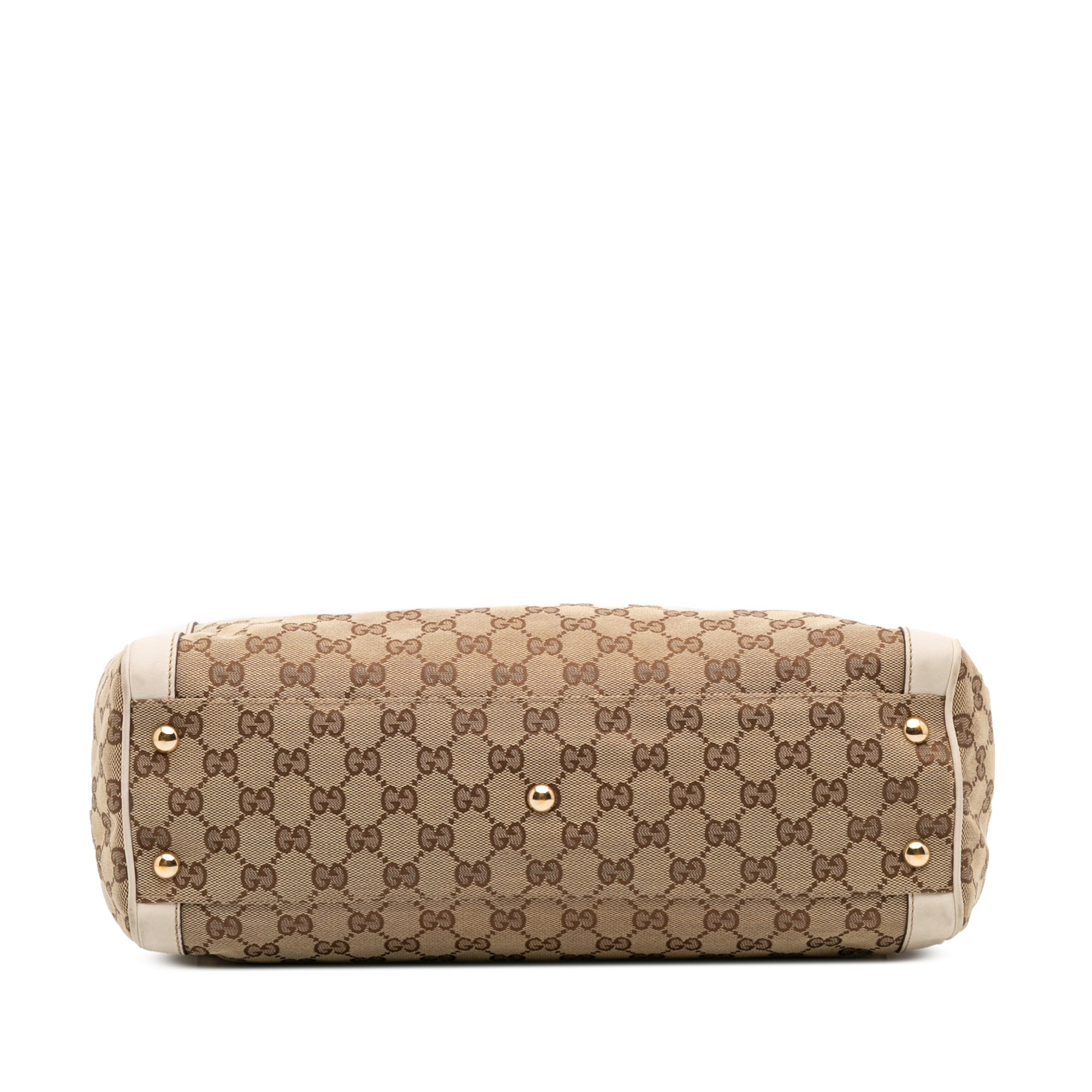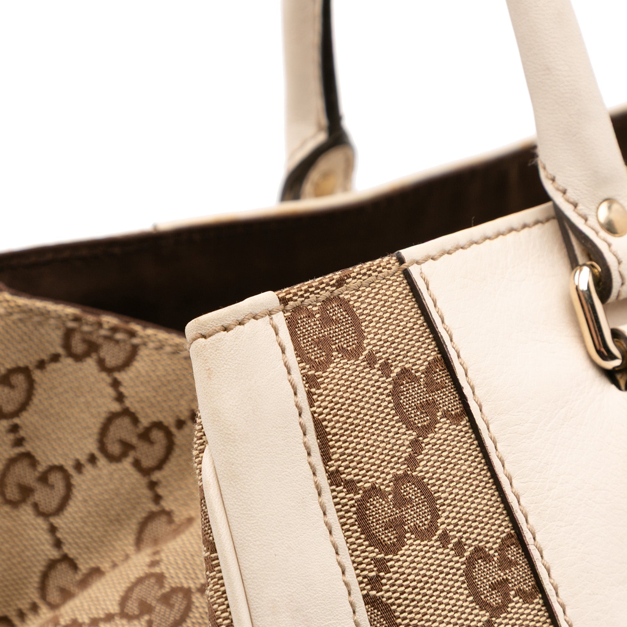 This tote bag features a canvas body with leather trim, rolled leather shoulder straps, an open top with a leather tab and magnetic snap button closure, and interior slip pockets. Retail Price: 865.00