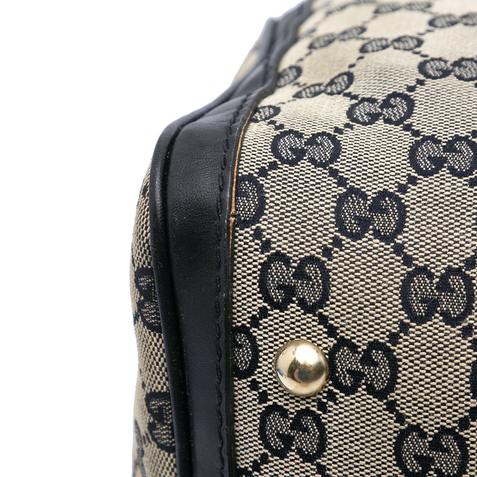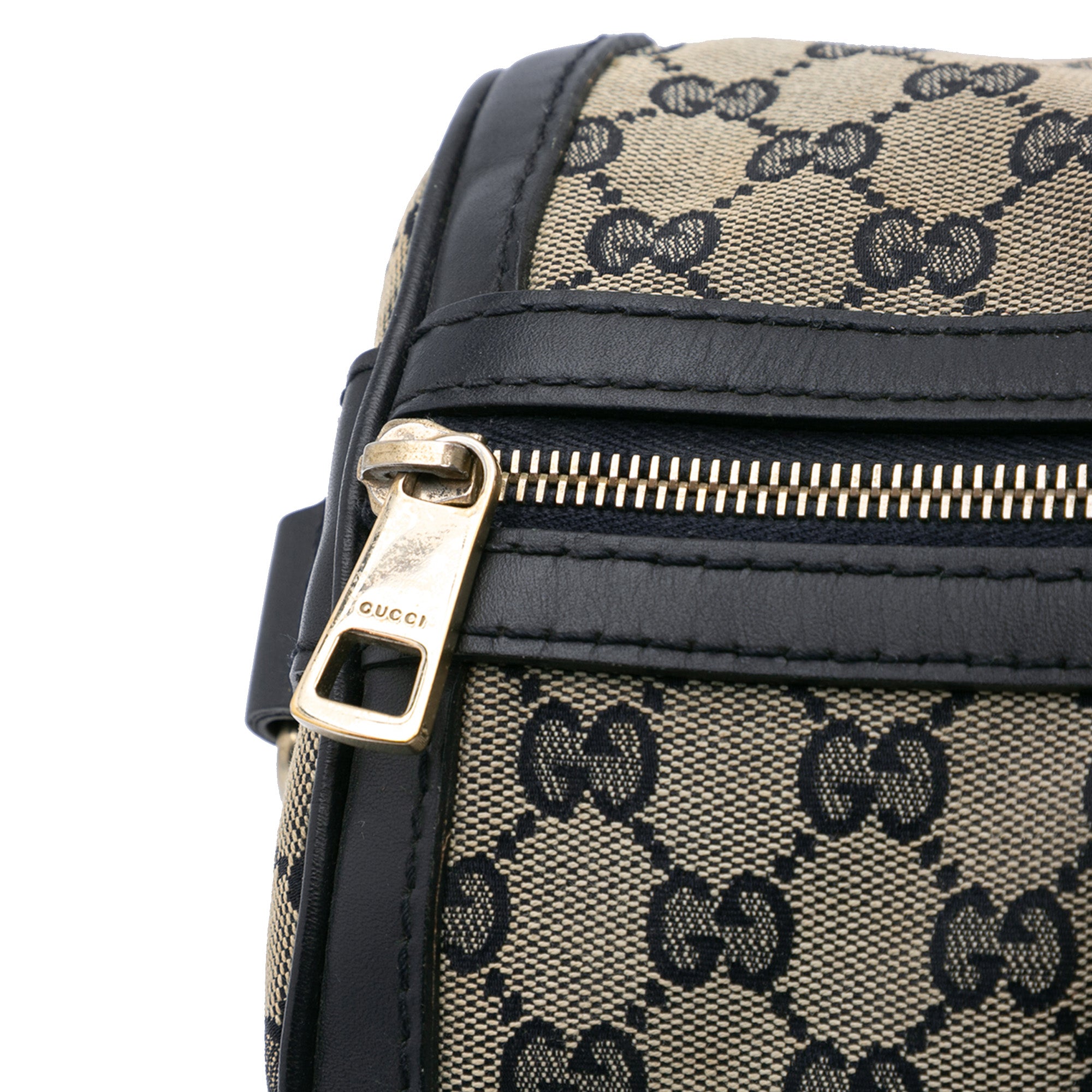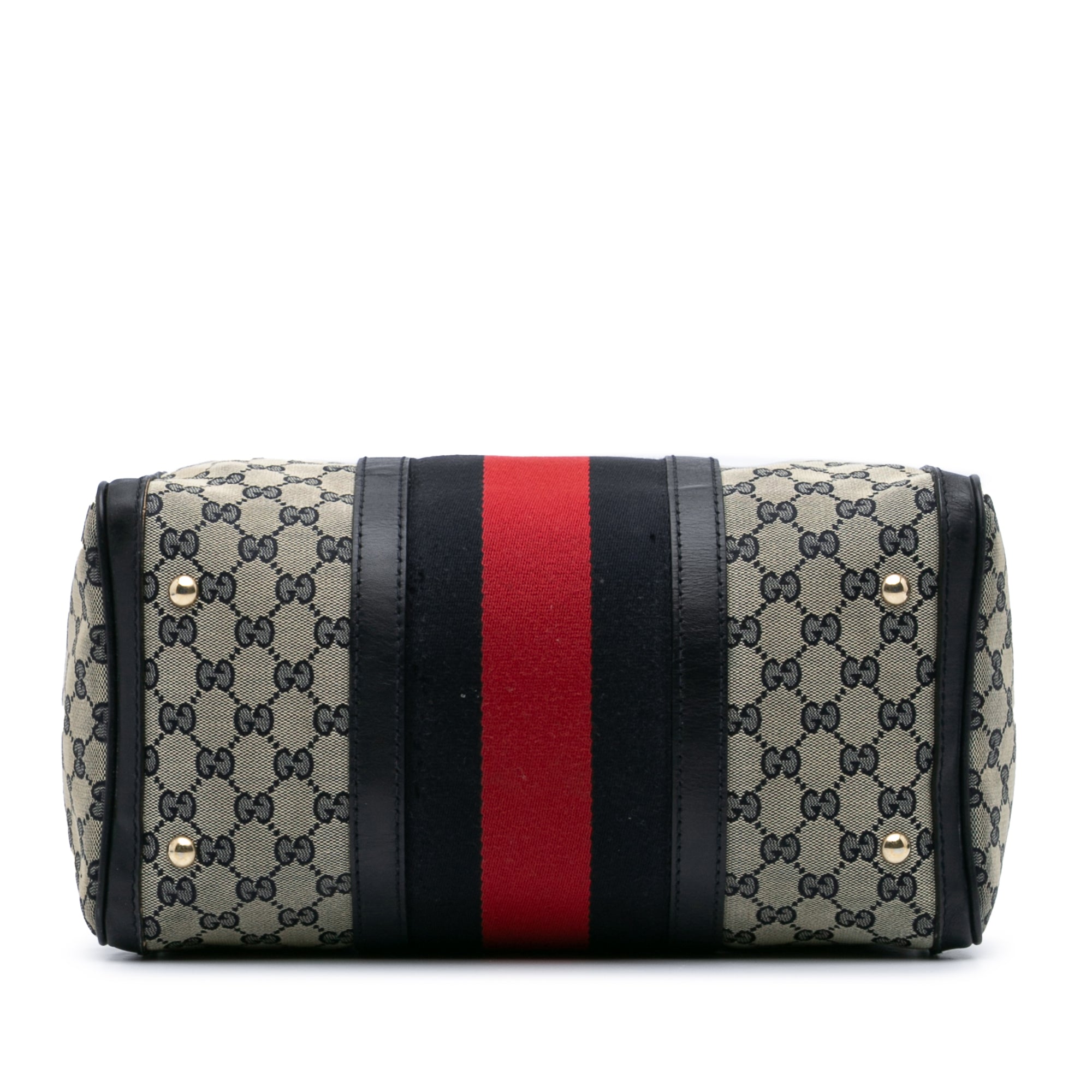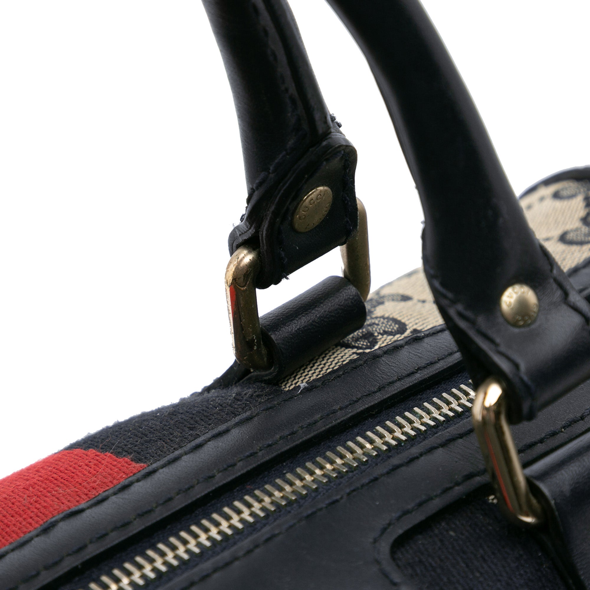 This satchel features a canvas body with leather trim and web detail, rolled leather handles, a top zip closure, and interior zip and slip pockets. Retail Price: 1200.00