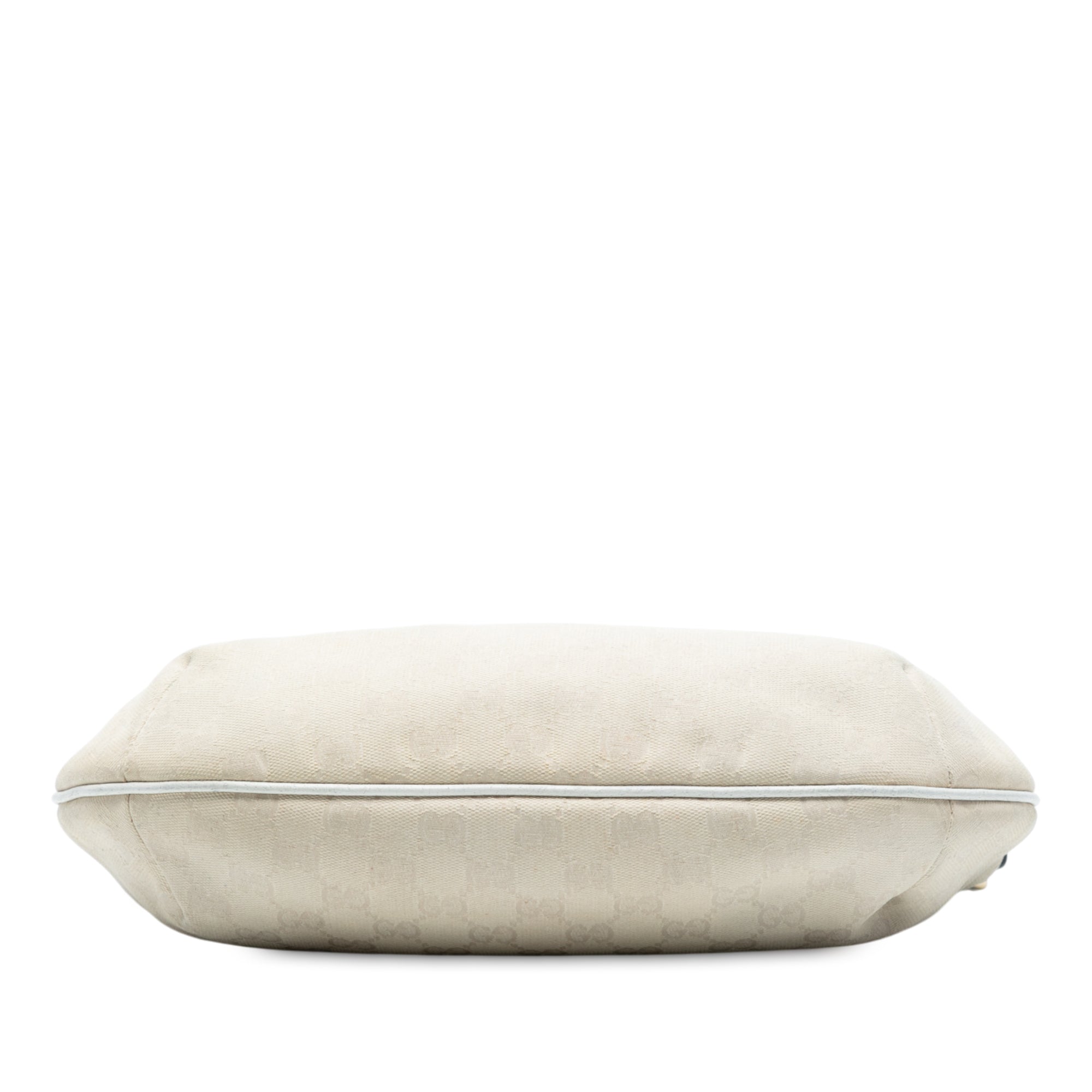This crossbody bag features a canvas body with leather trim, a flat strap, a top zip closure, and an interior zip pocket. Retail Price: 800.00