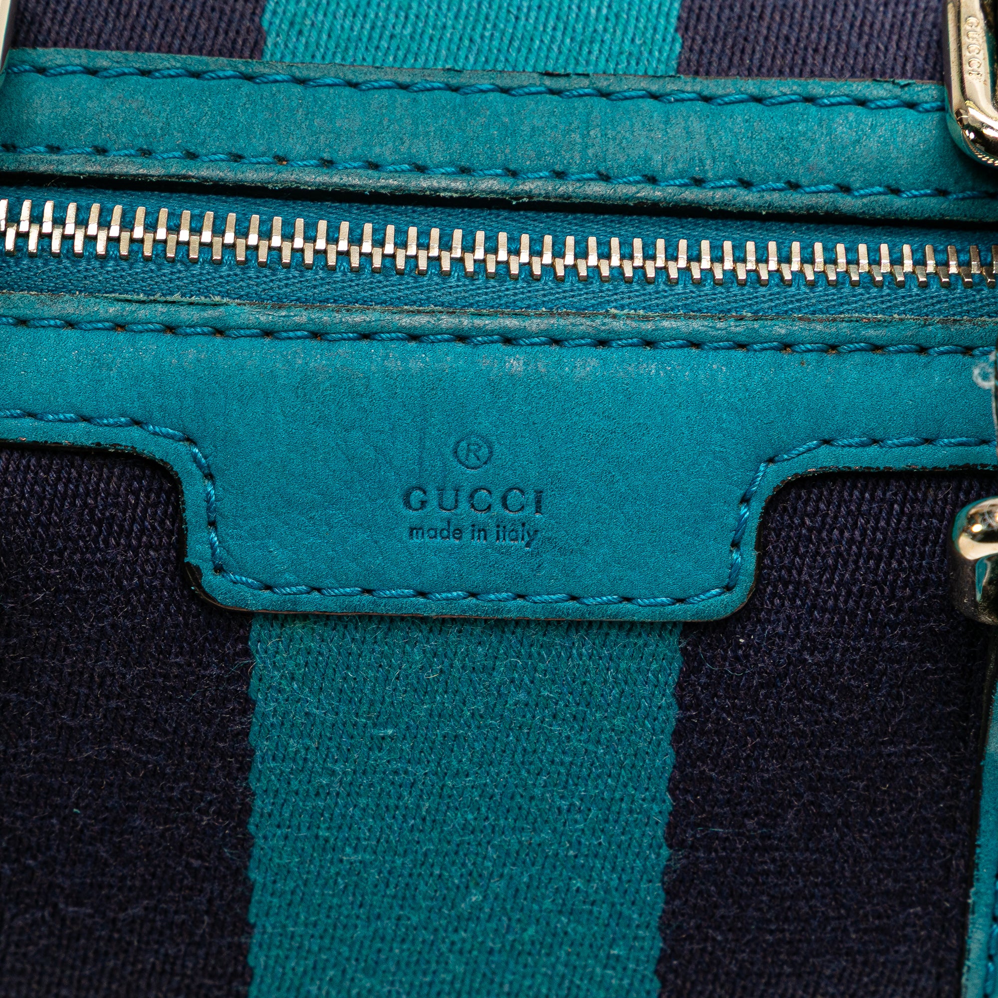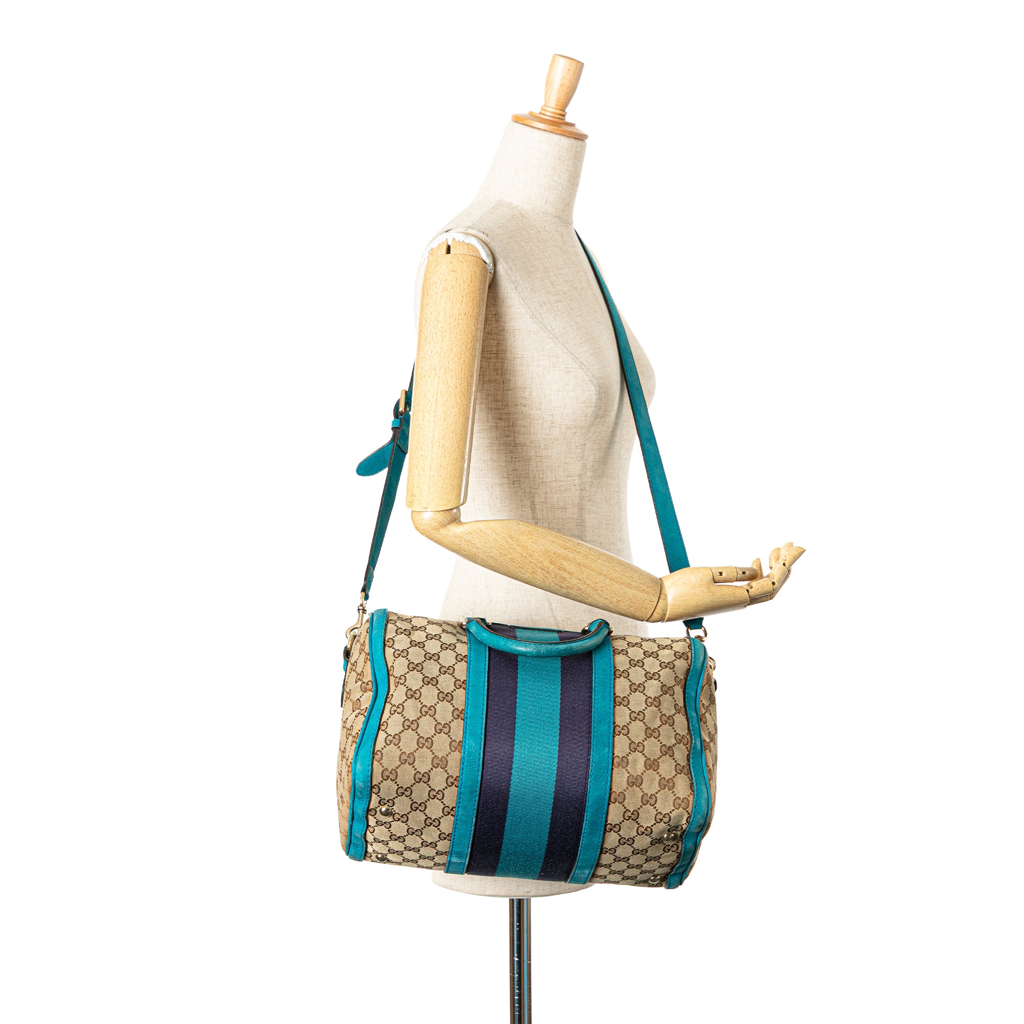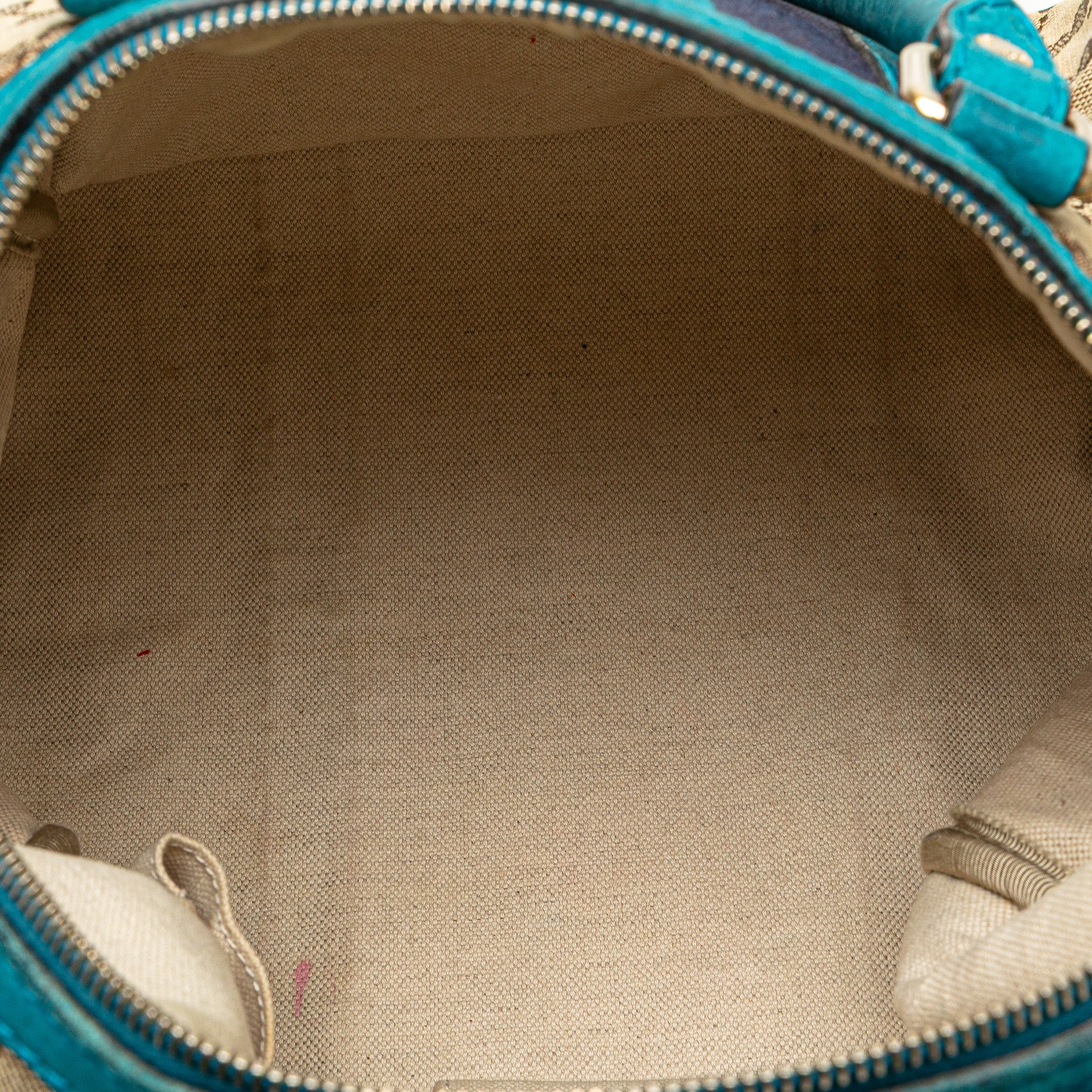 This satchel features a canvas body with leather trim and web detail, rolled leather handles, a detachable flat leather strap, a top zip closure, and an interior zip pocket. Retail Price: 1200.00