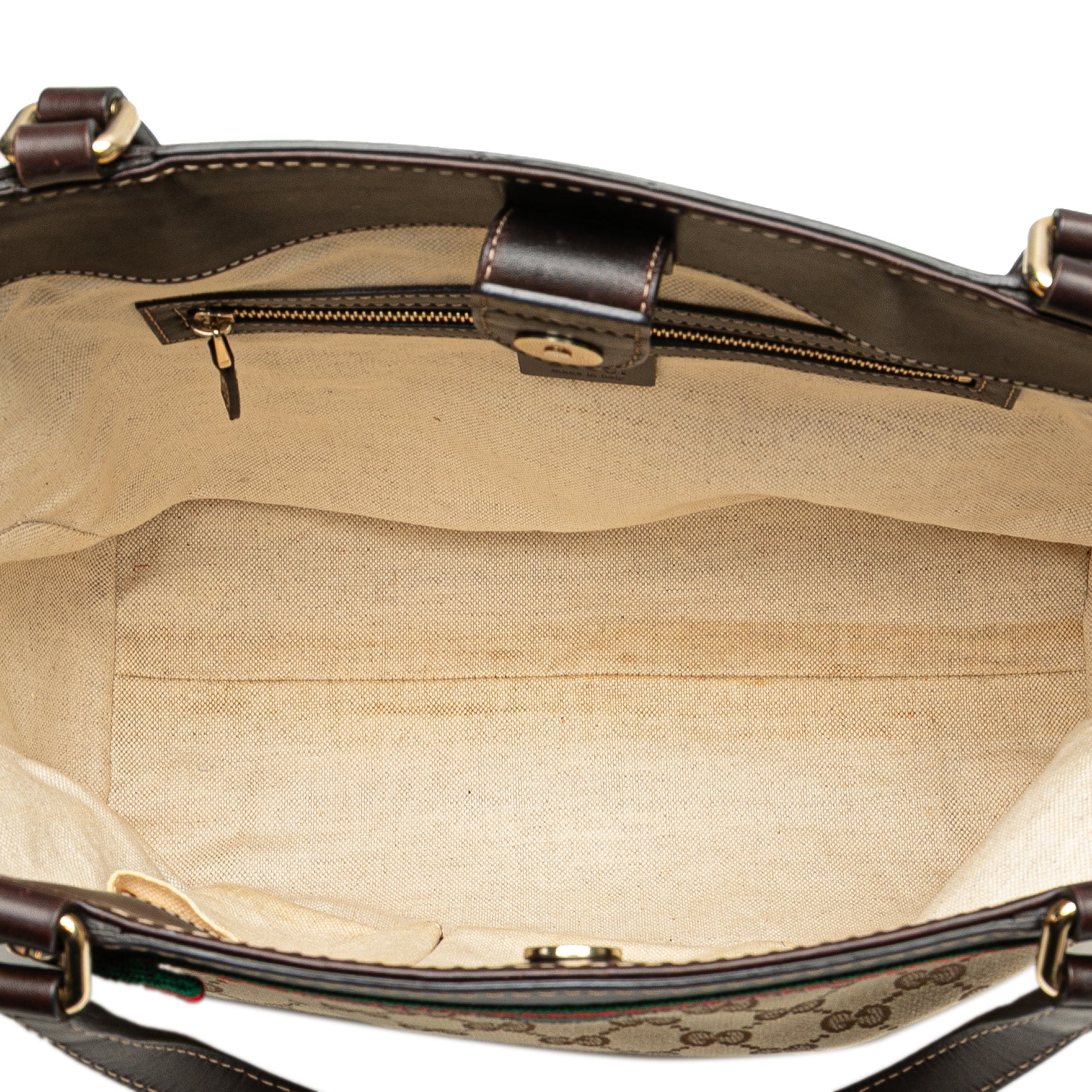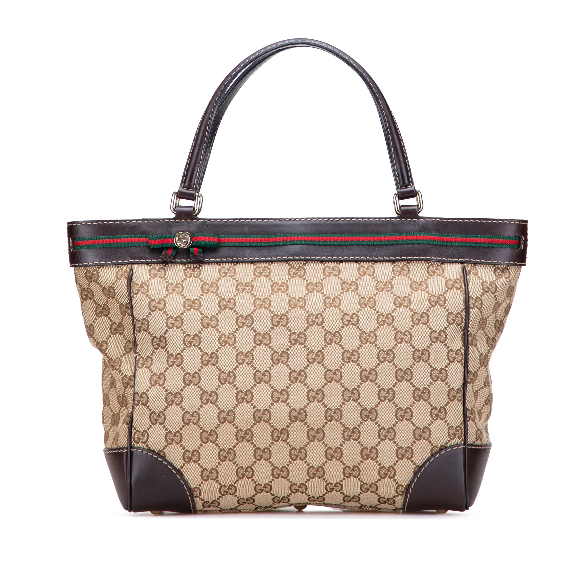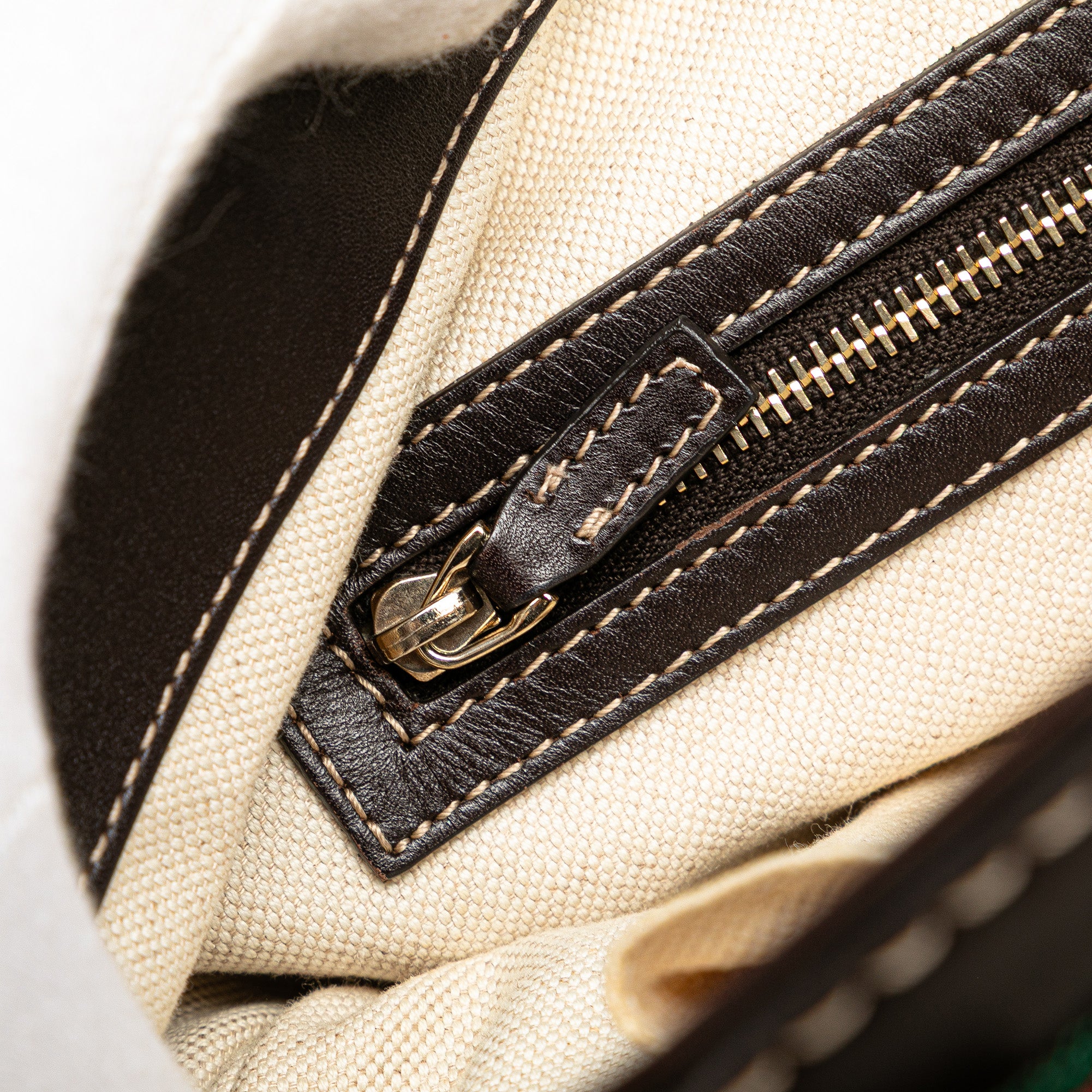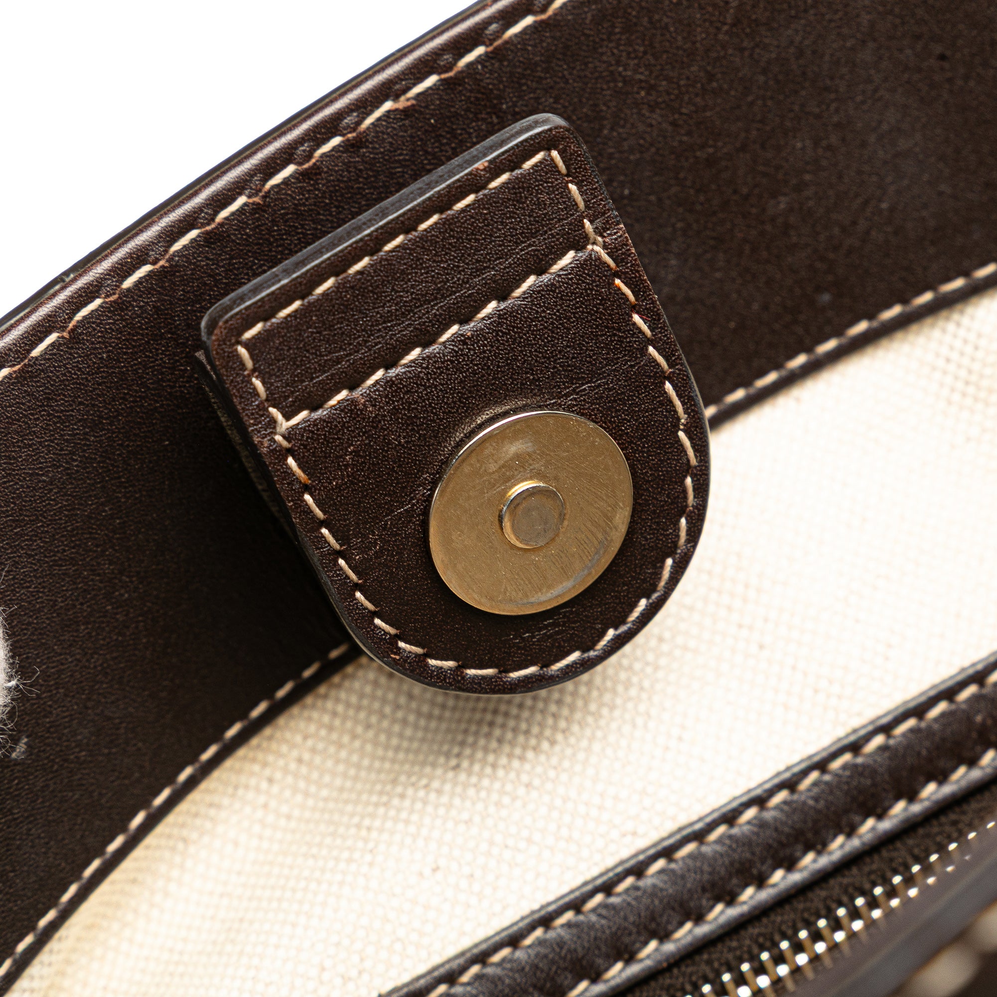 The Mayfair tote bag features a canvas body with leather trim, flat leather straps, an open top with magnetic snap button closure, and interior zip and slip pockets. Retail Price: 840.00