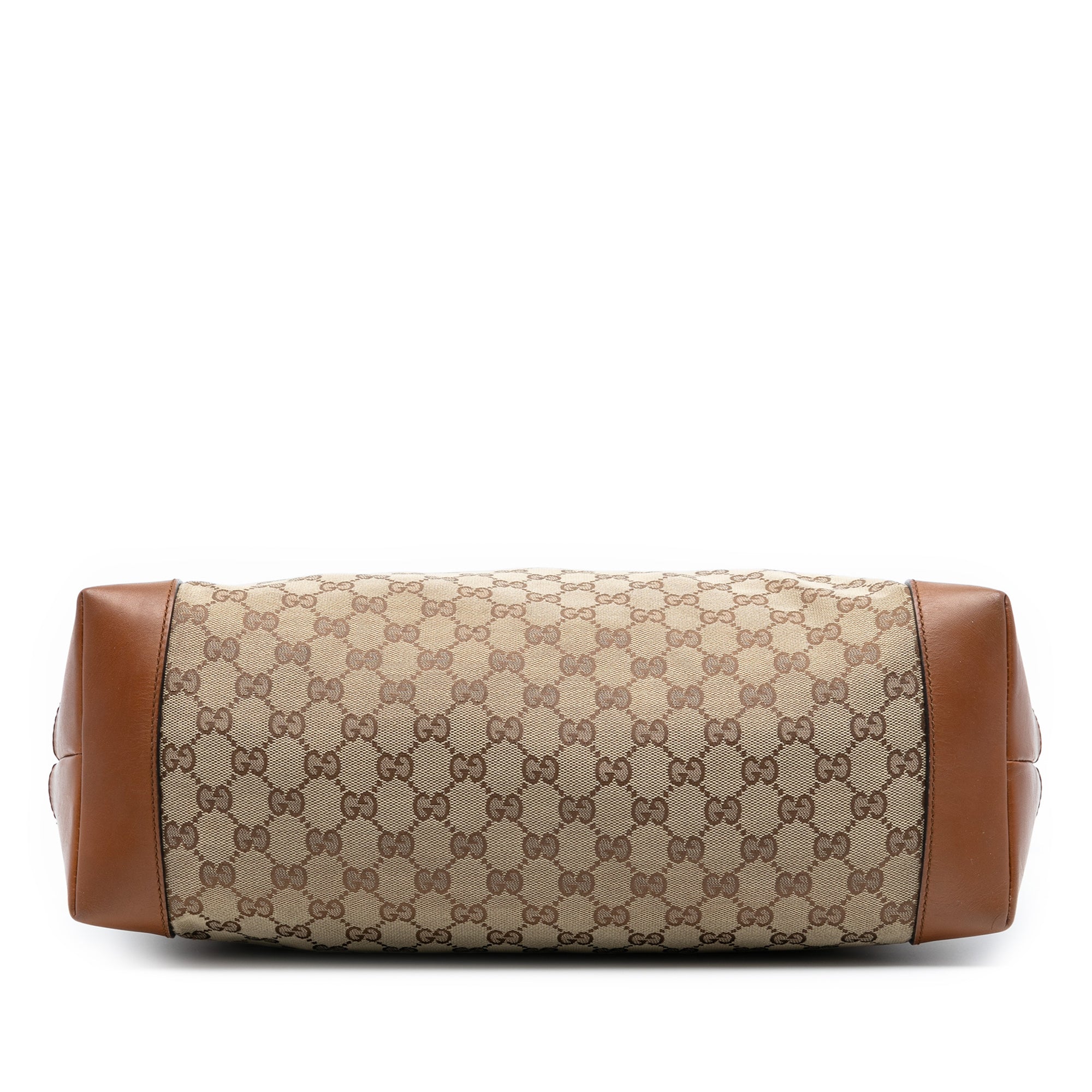 This tote bag features a canvas body with leather trim, flat leather straps, top zip closure, and interior zip and slip pockets. Retail Price: 695.00