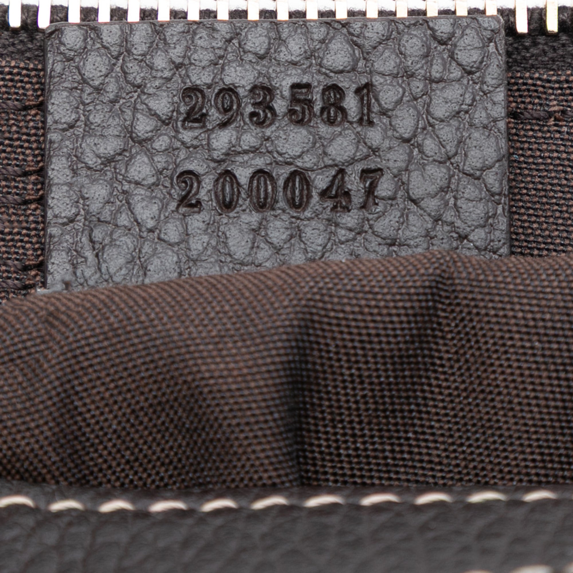 The Abbey handbag features a coated canvas body with leather trim, a rolled leather strap, a top zip closure, exterior front flap pockets with magnetic snap closure, and an interior zip pocket. Retail Price: 1500.00