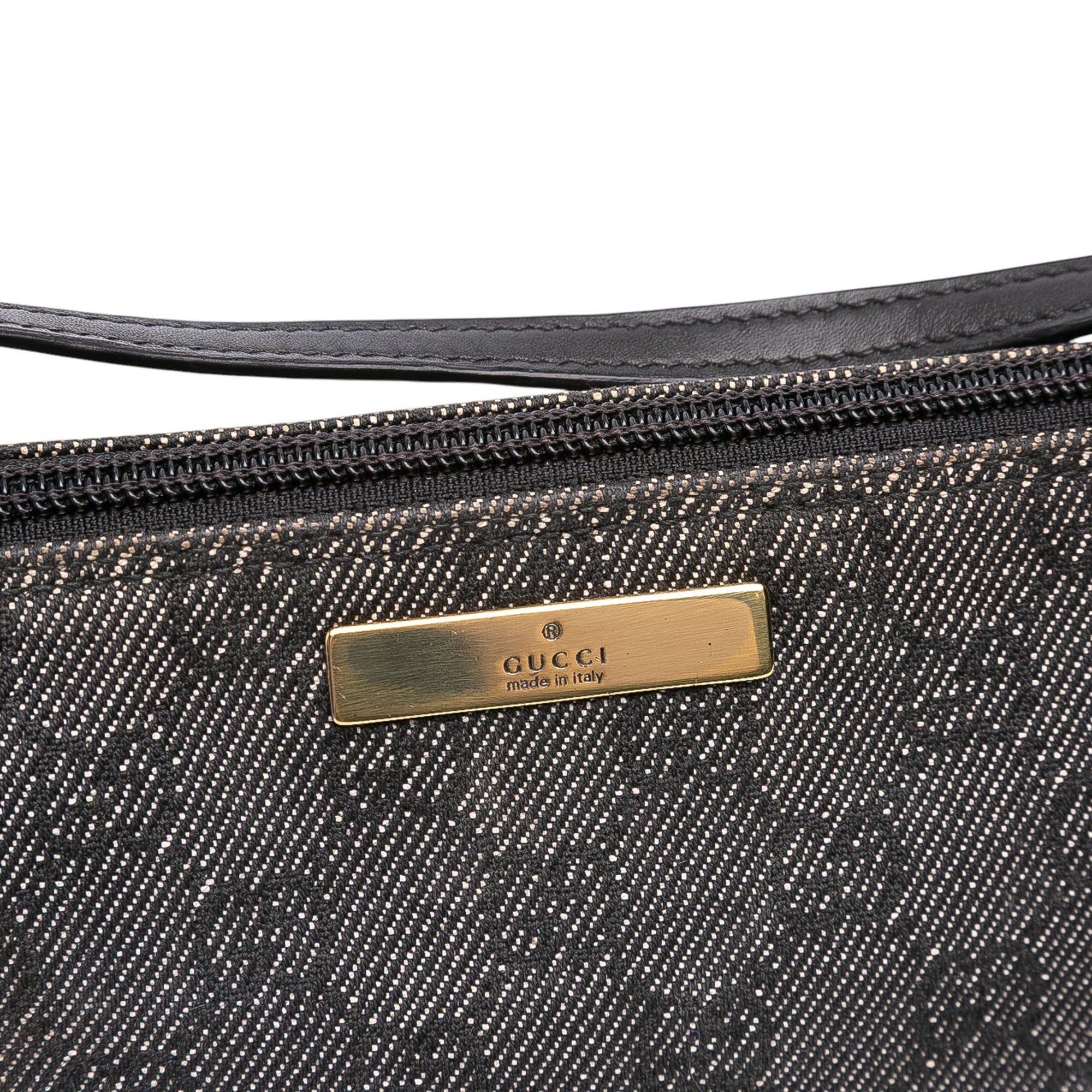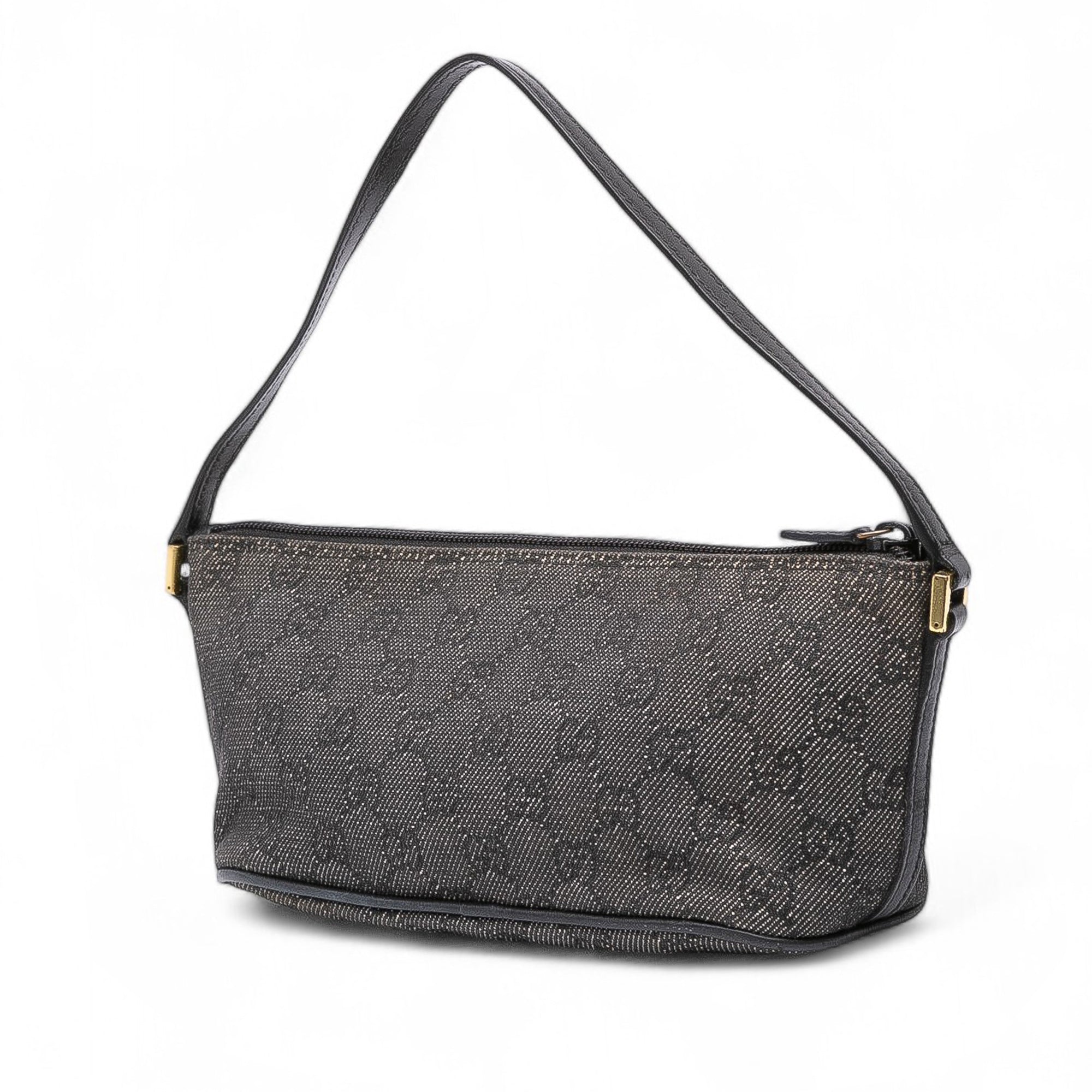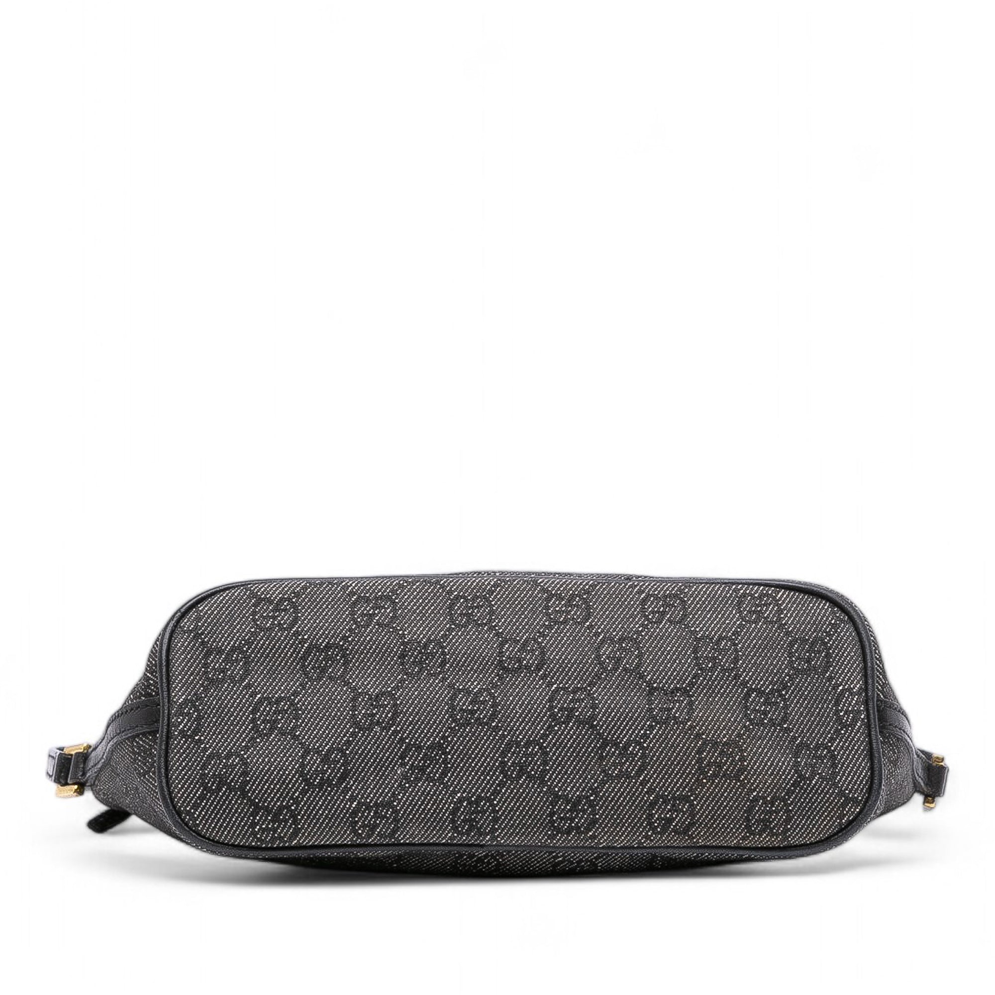This shoulder bag features a denim body with leather trim, a flat leather strap, and a top zip closure. Retail Price: 500.00