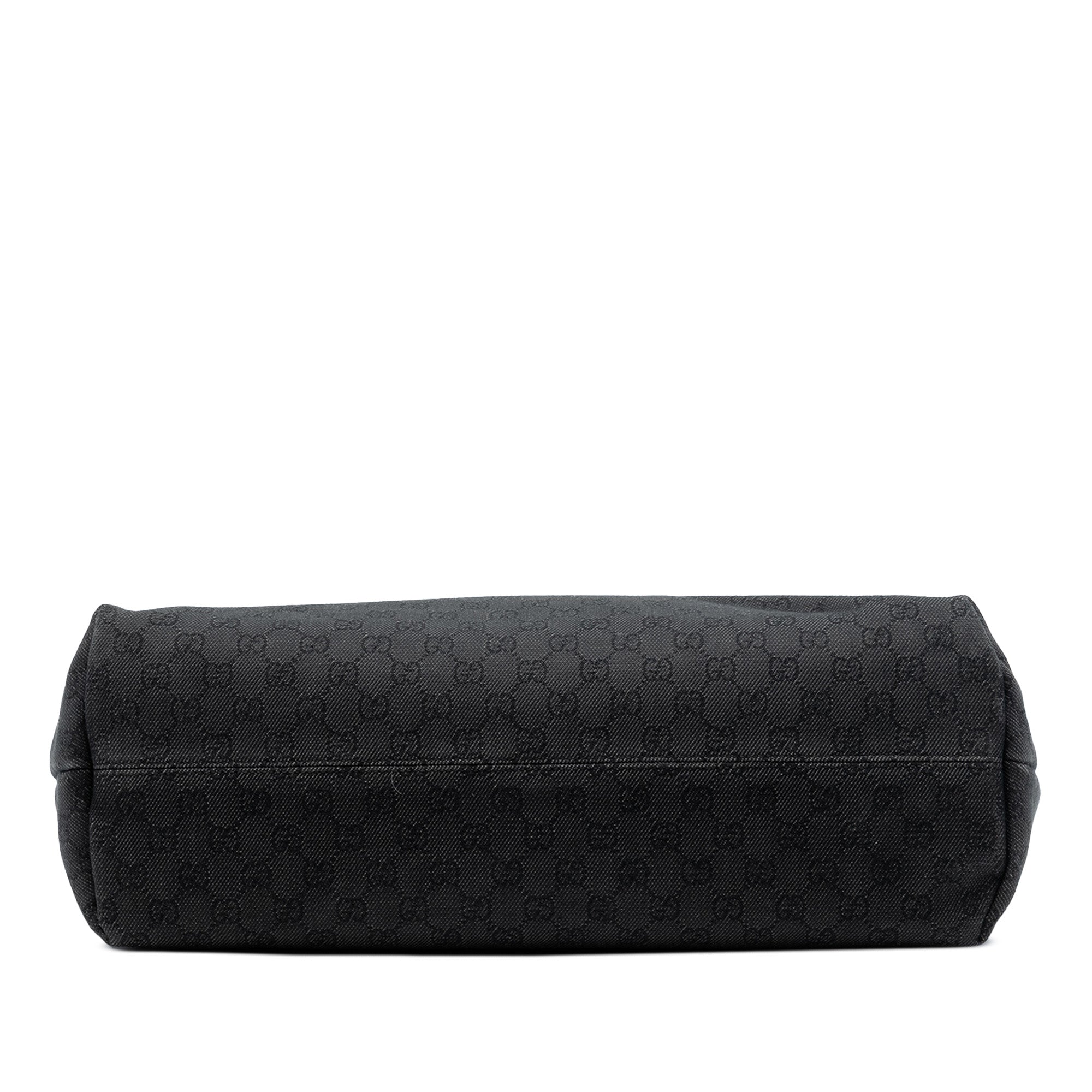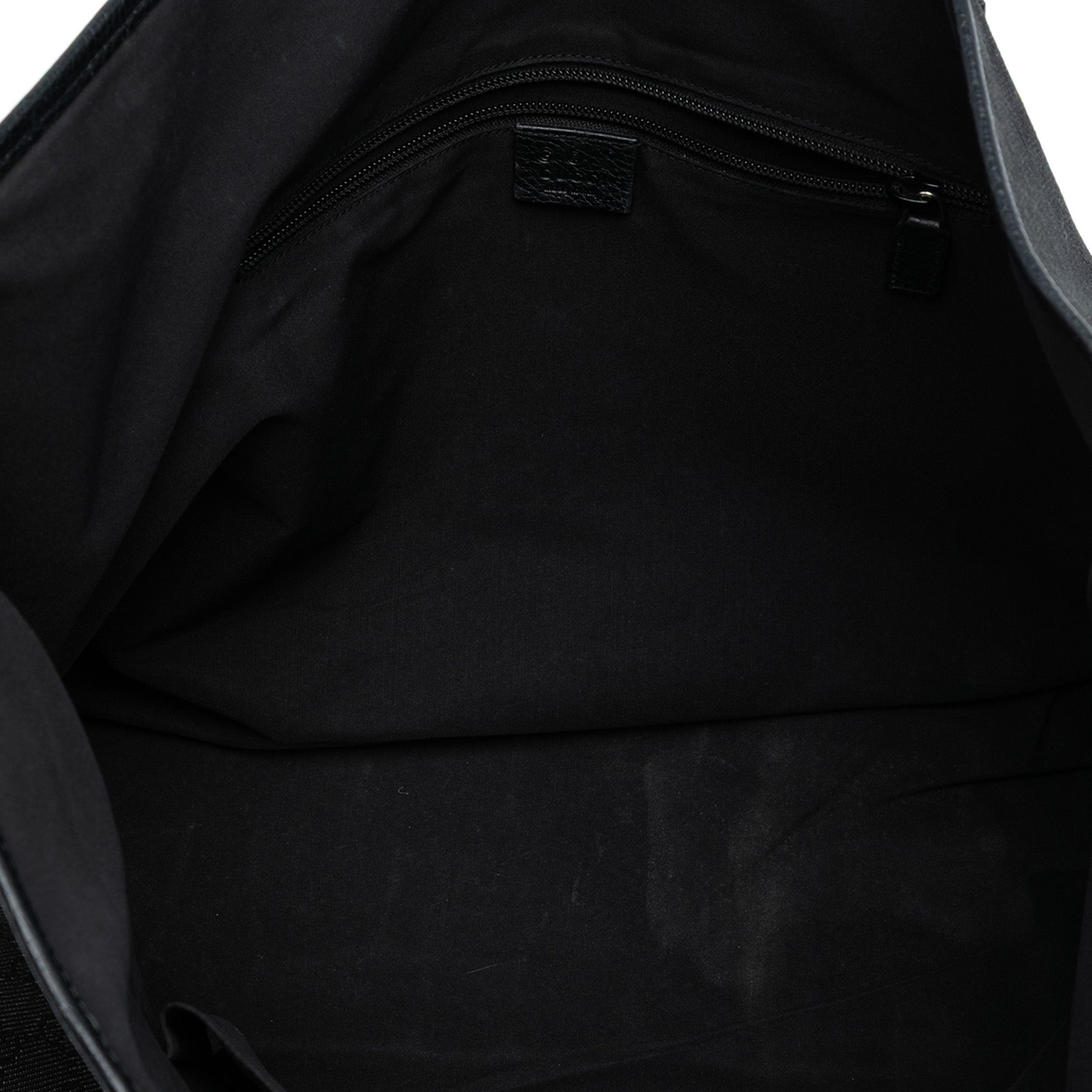 This tote bag features a denim body with leather trim, flat handles, an open top with magnetic closure, and interior zip and slip pockets. Retail Price: 1200.00